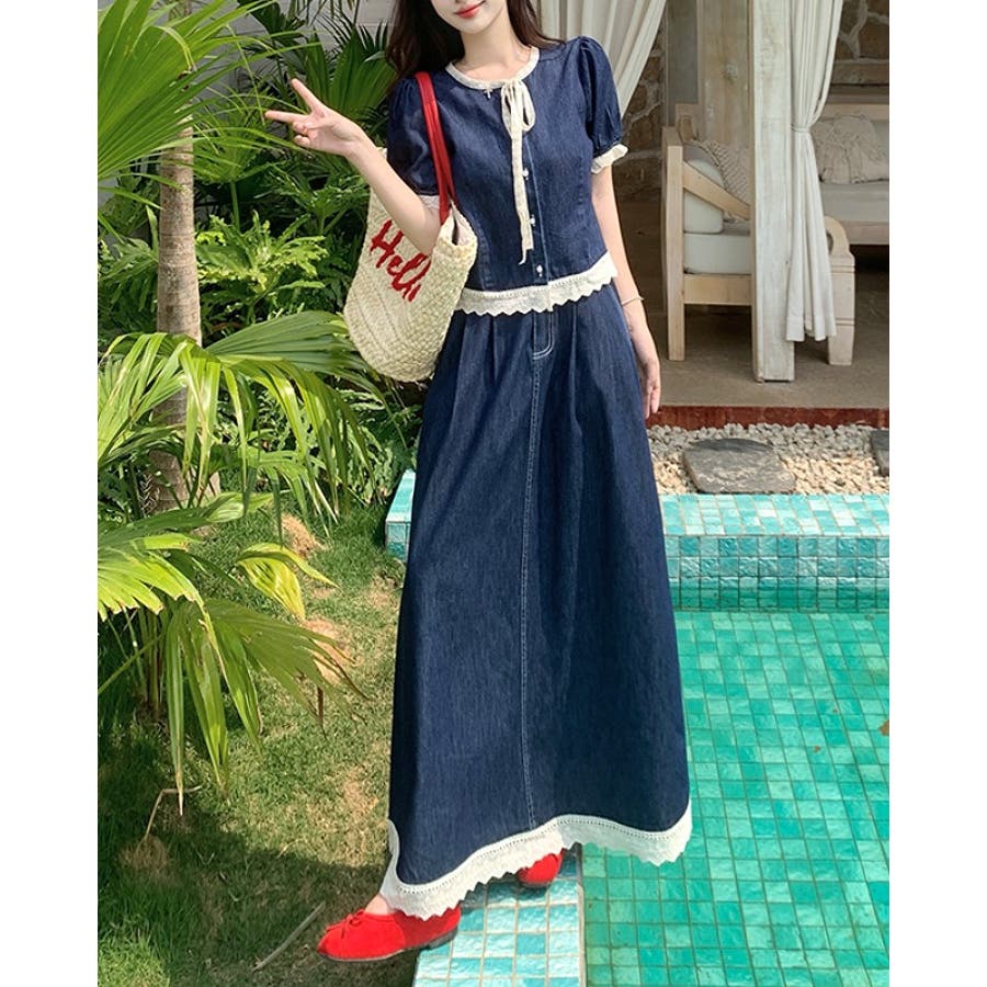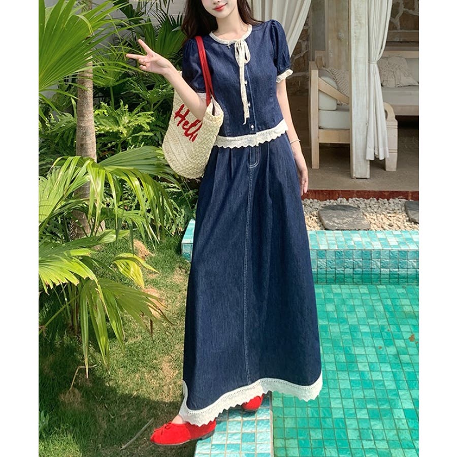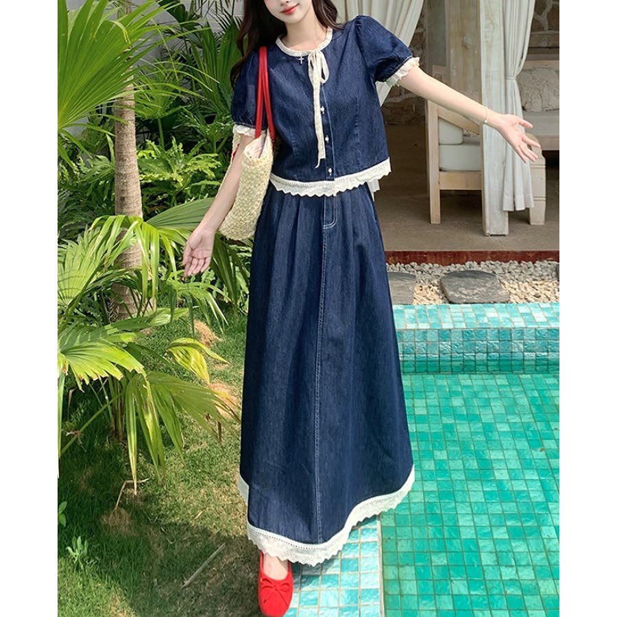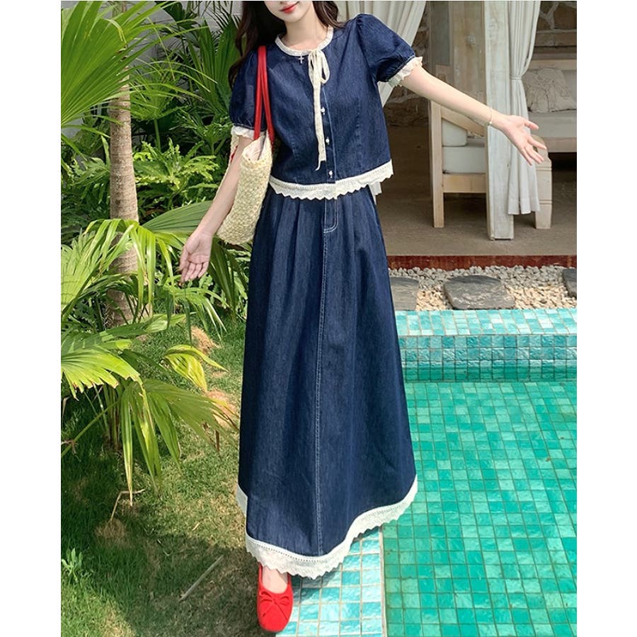 ポケット切り替えレースデニムセットアップ