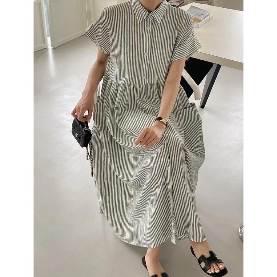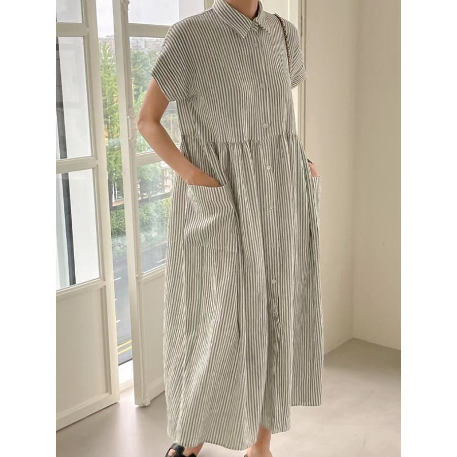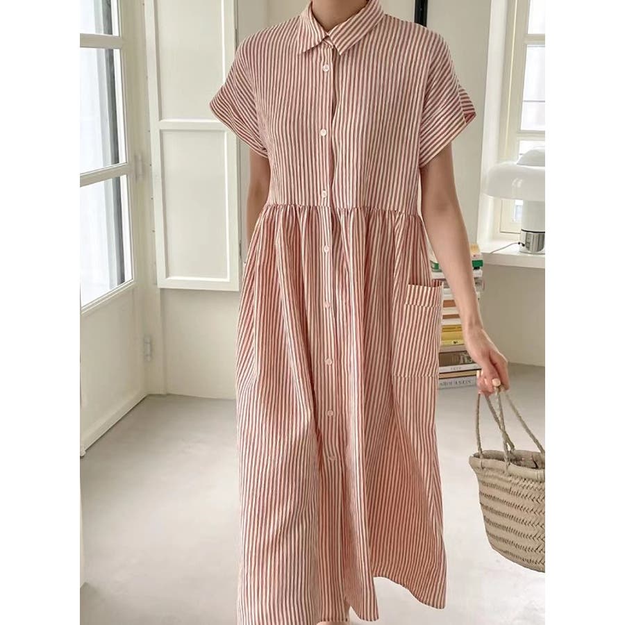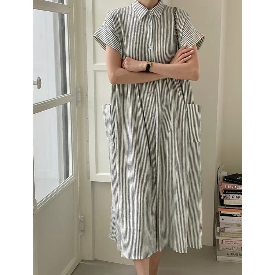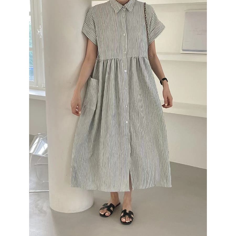 ストライプ柄ボタンダウン半袖ワンピース