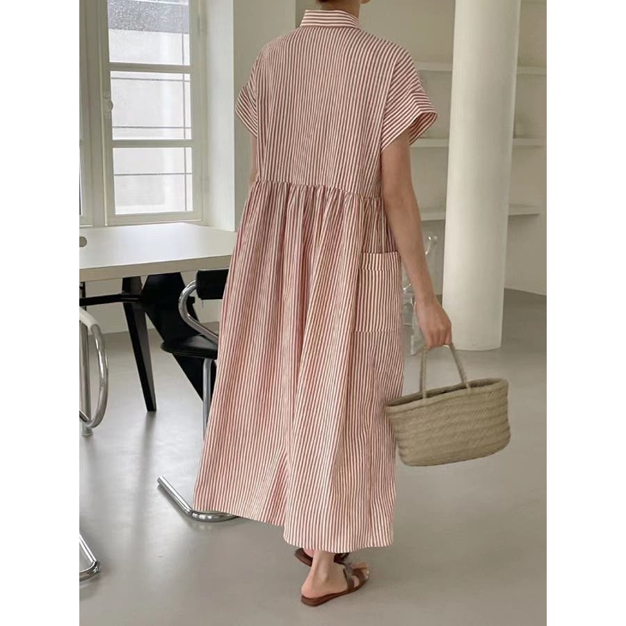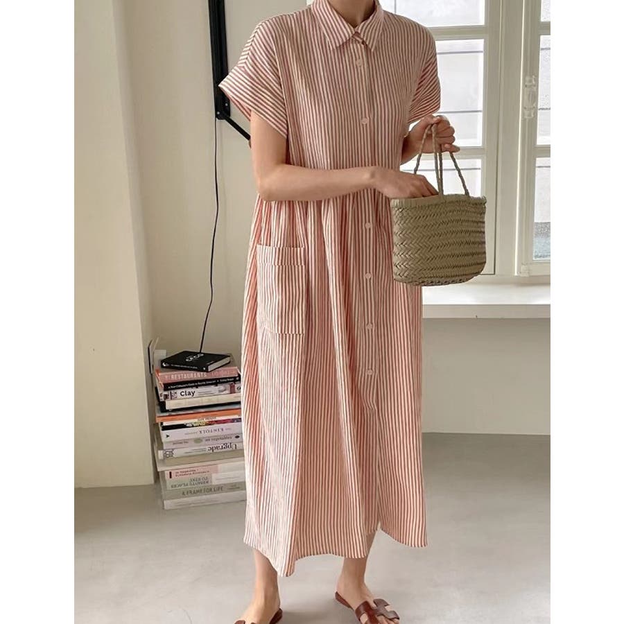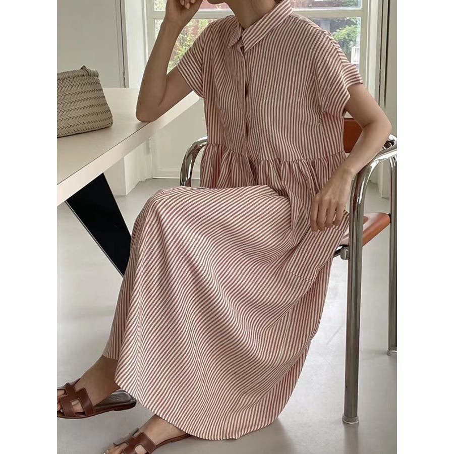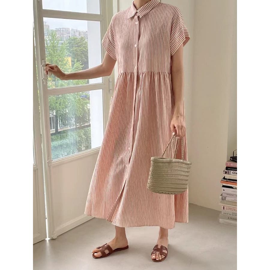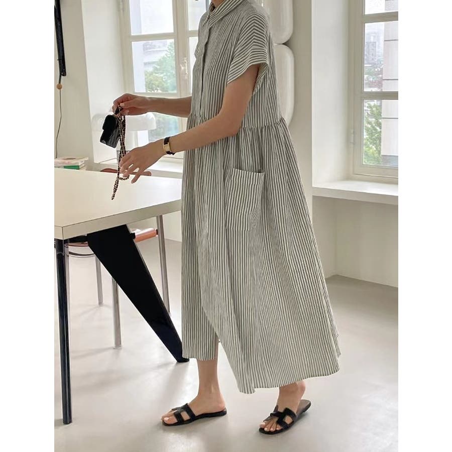 ストライプ柄ボタンダウン半袖ワンピース
