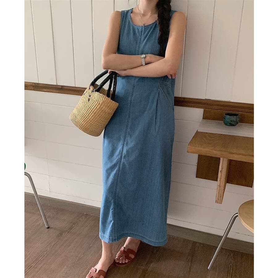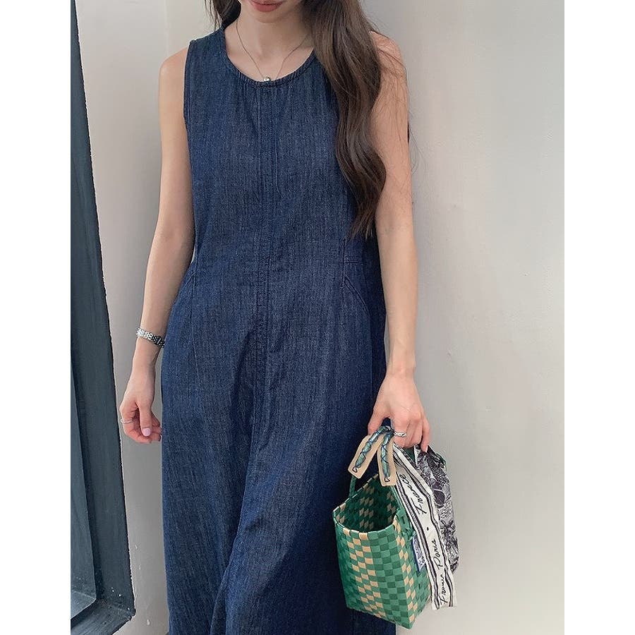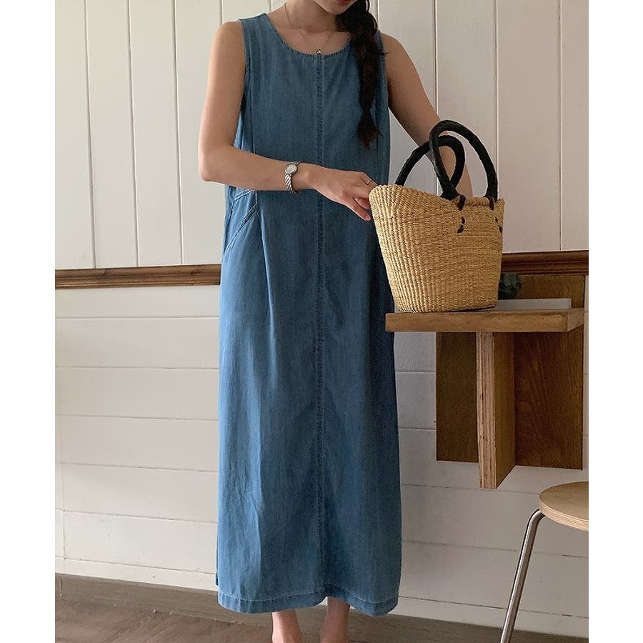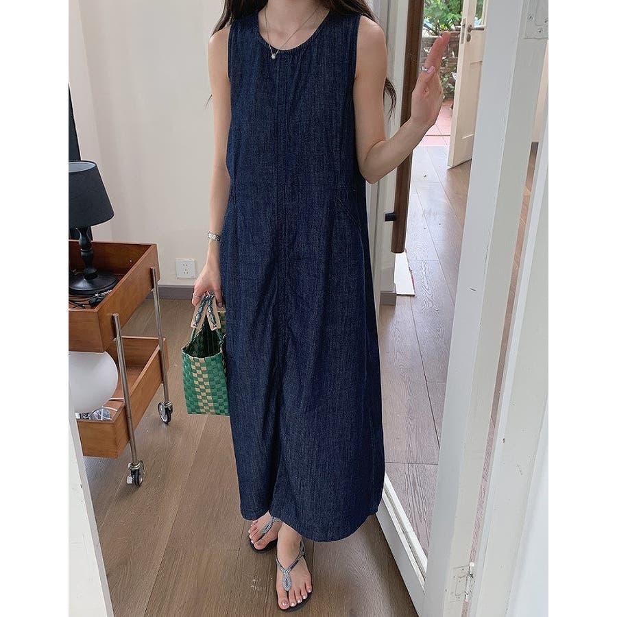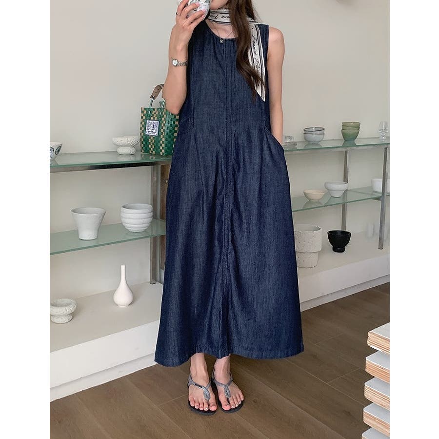 ポケット袖なしデニムワンピース