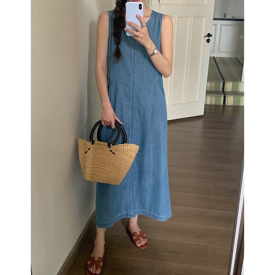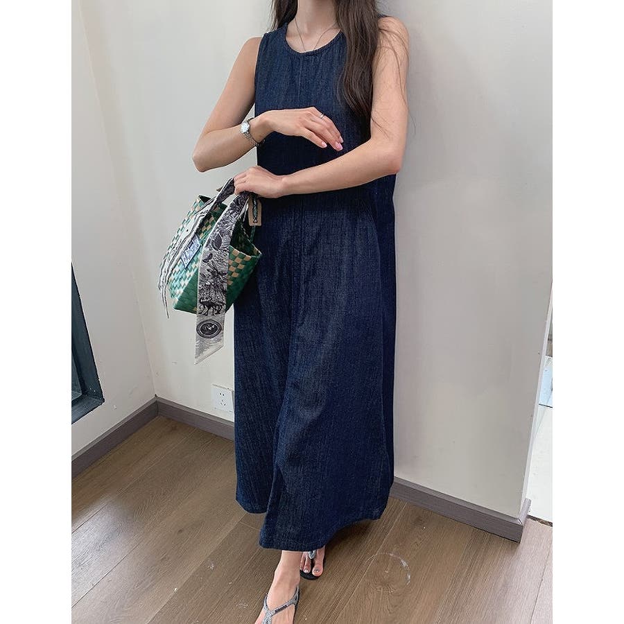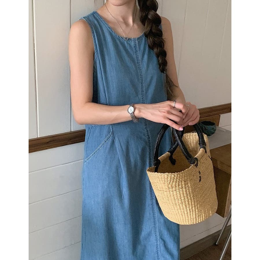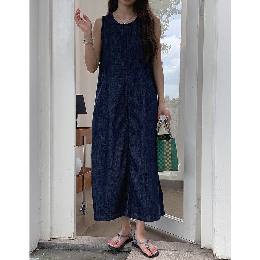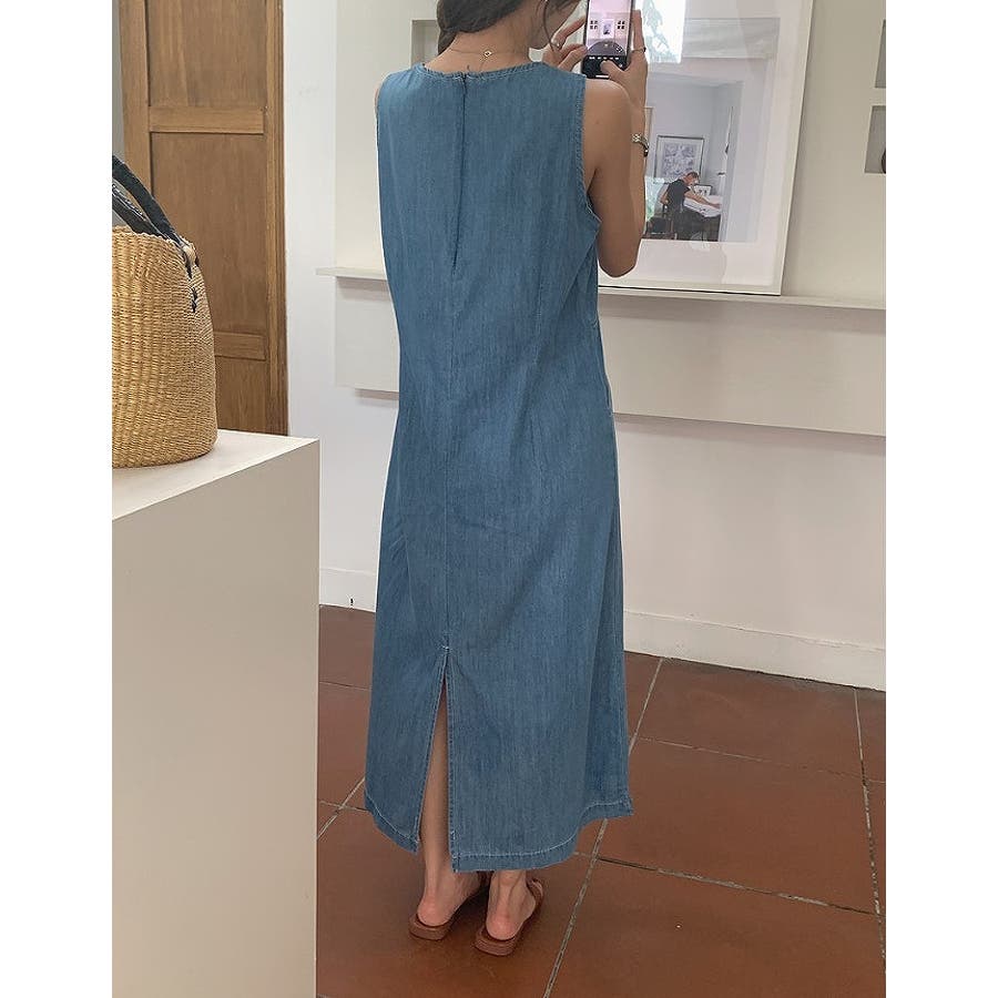 ポケット袖なしデニムワンピース