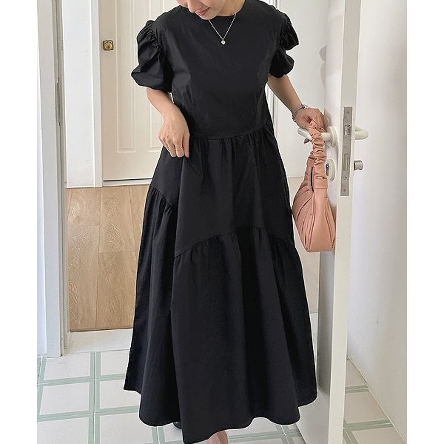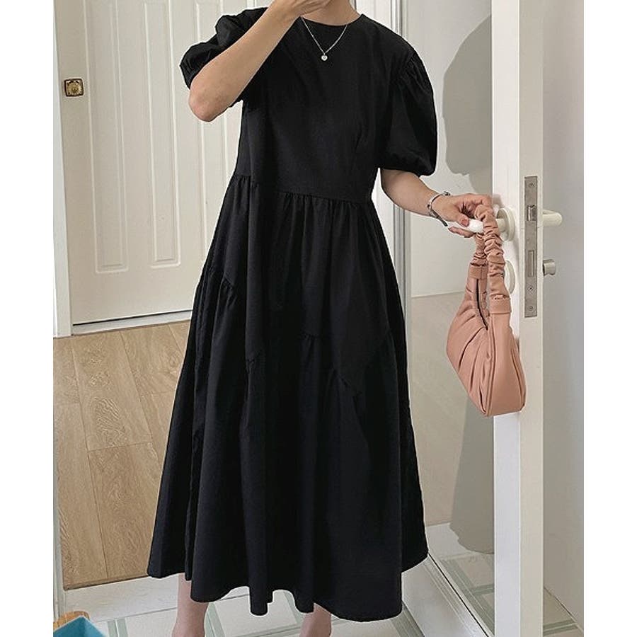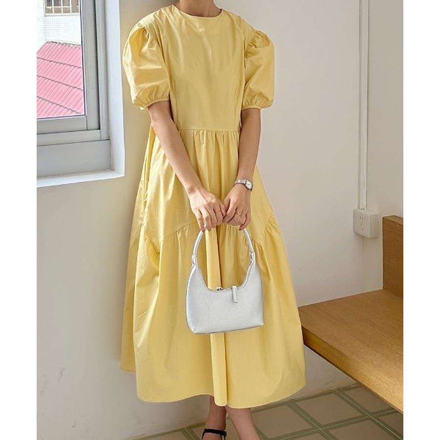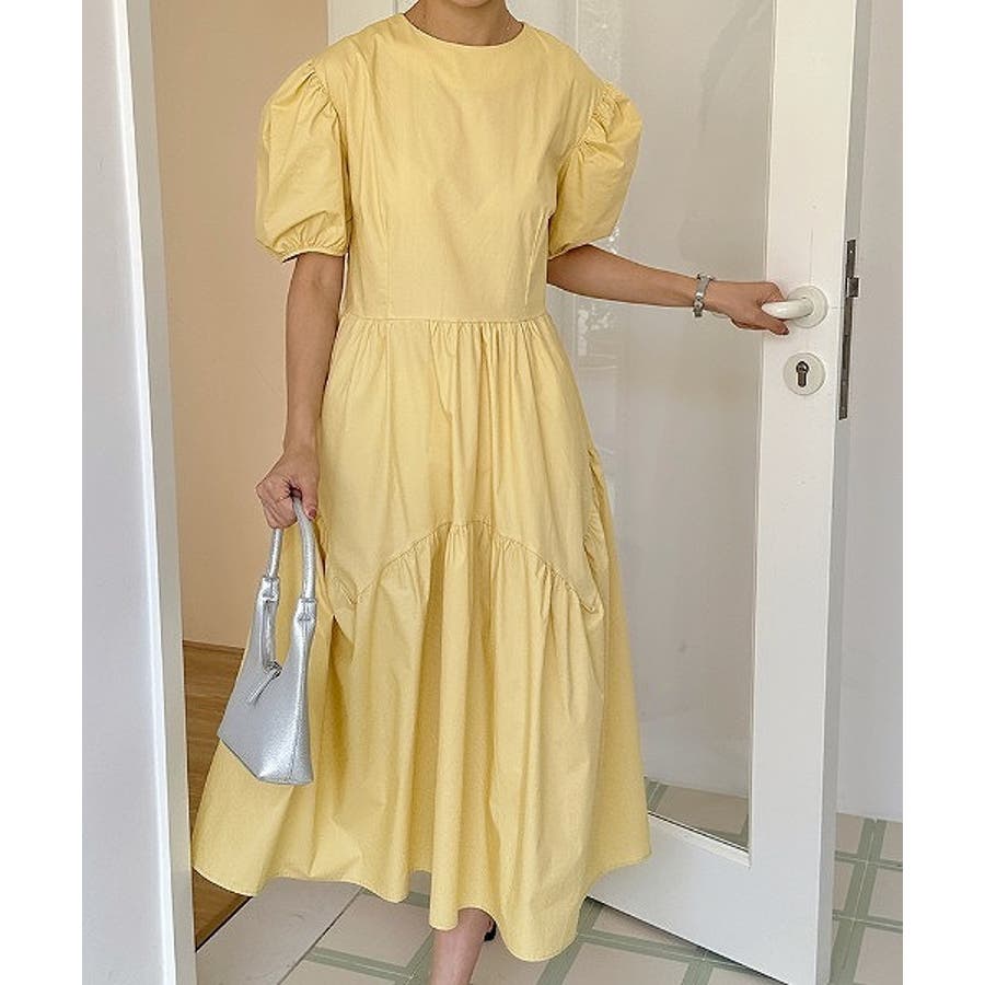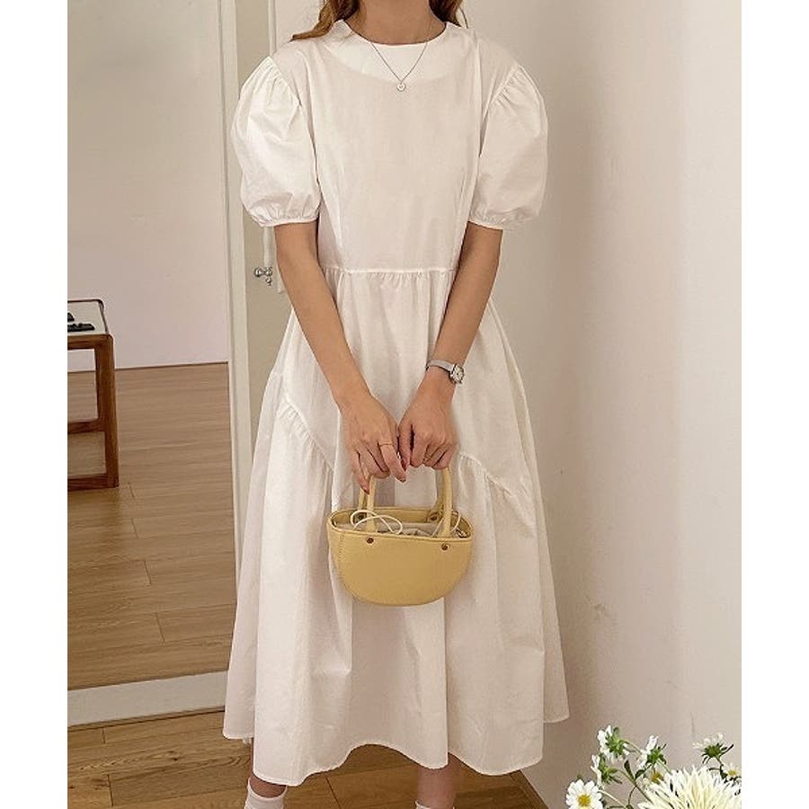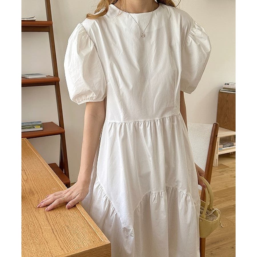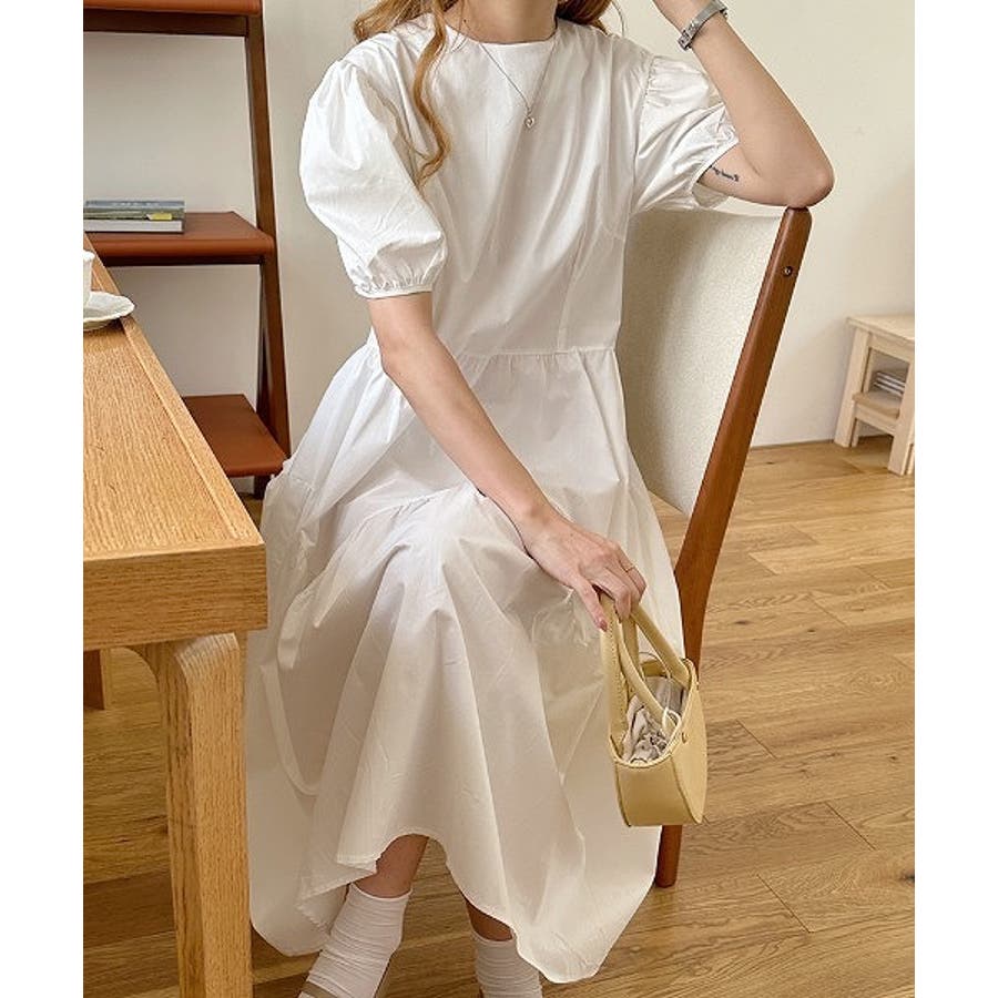 パフスリーブクルーネック半袖ワンピース