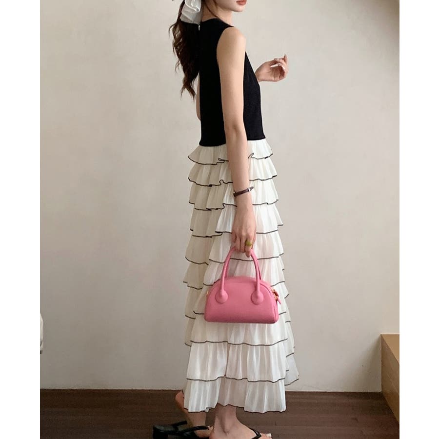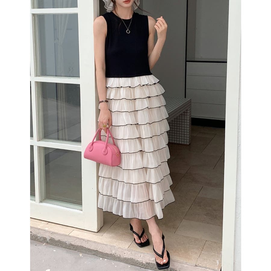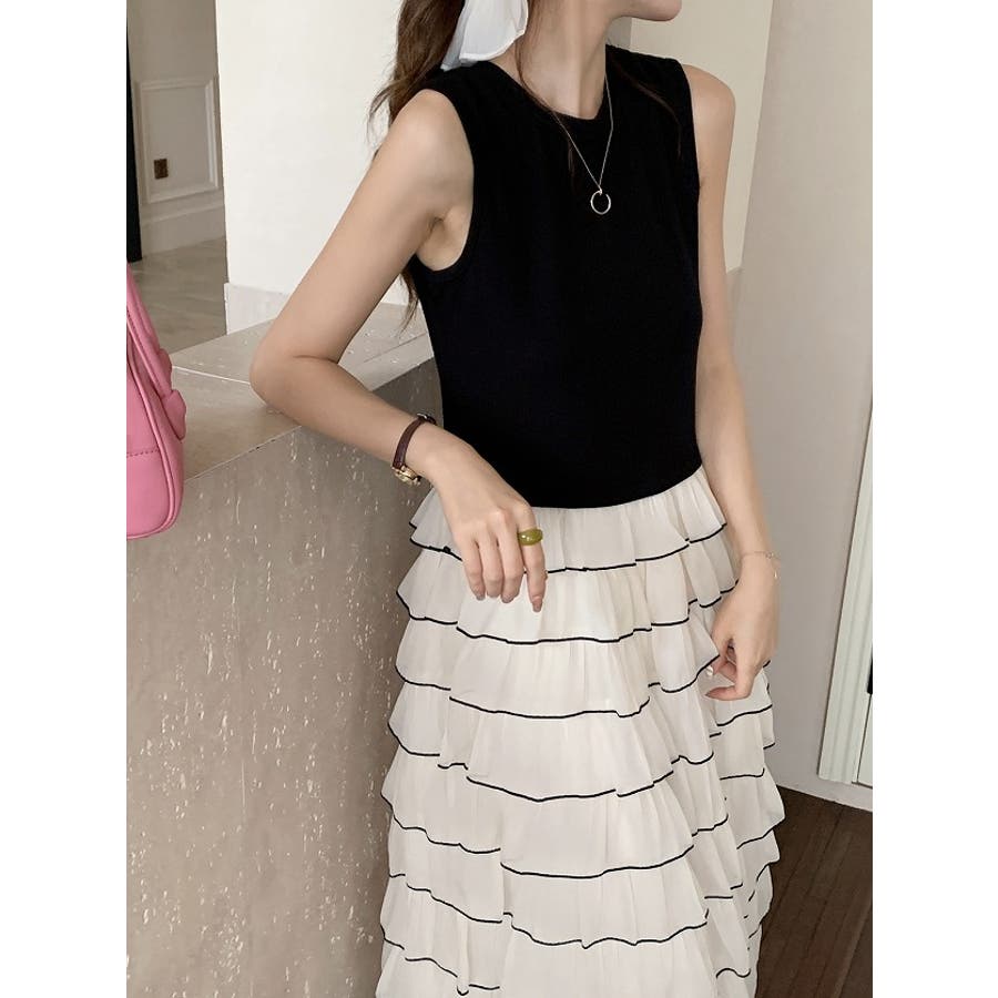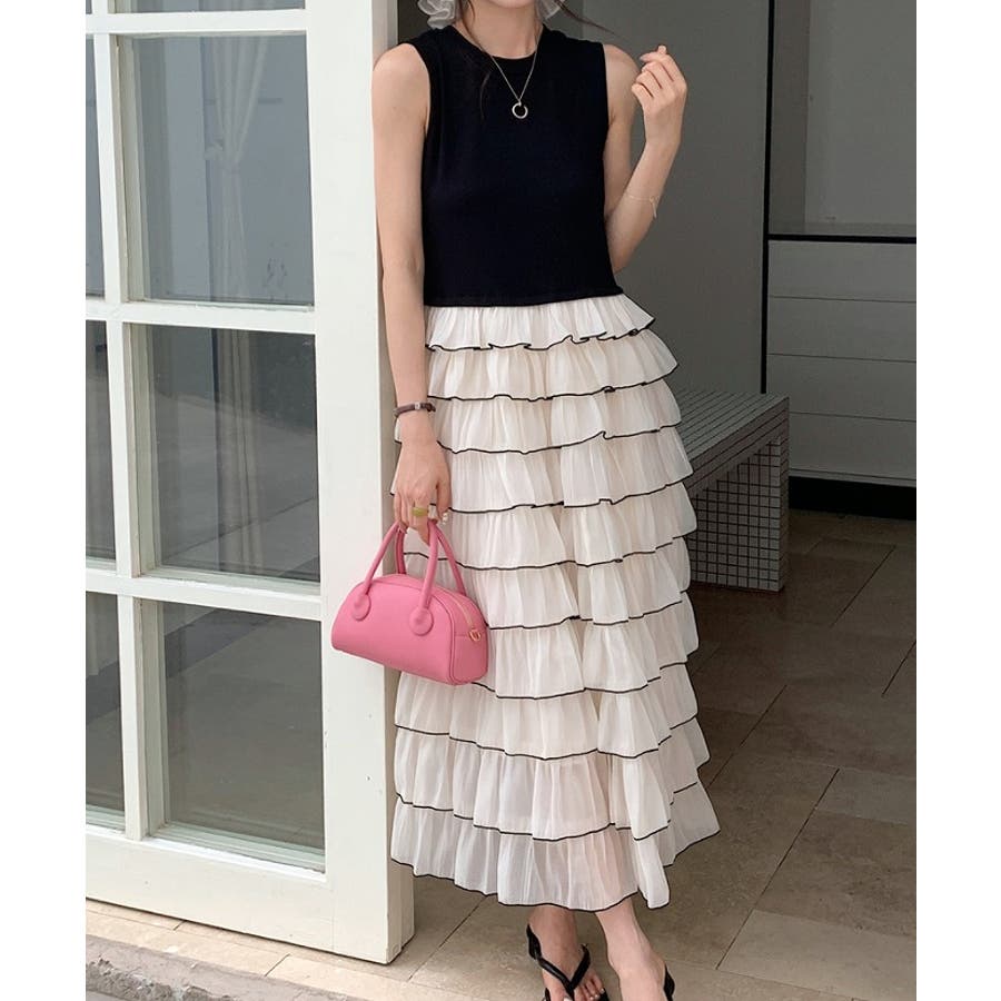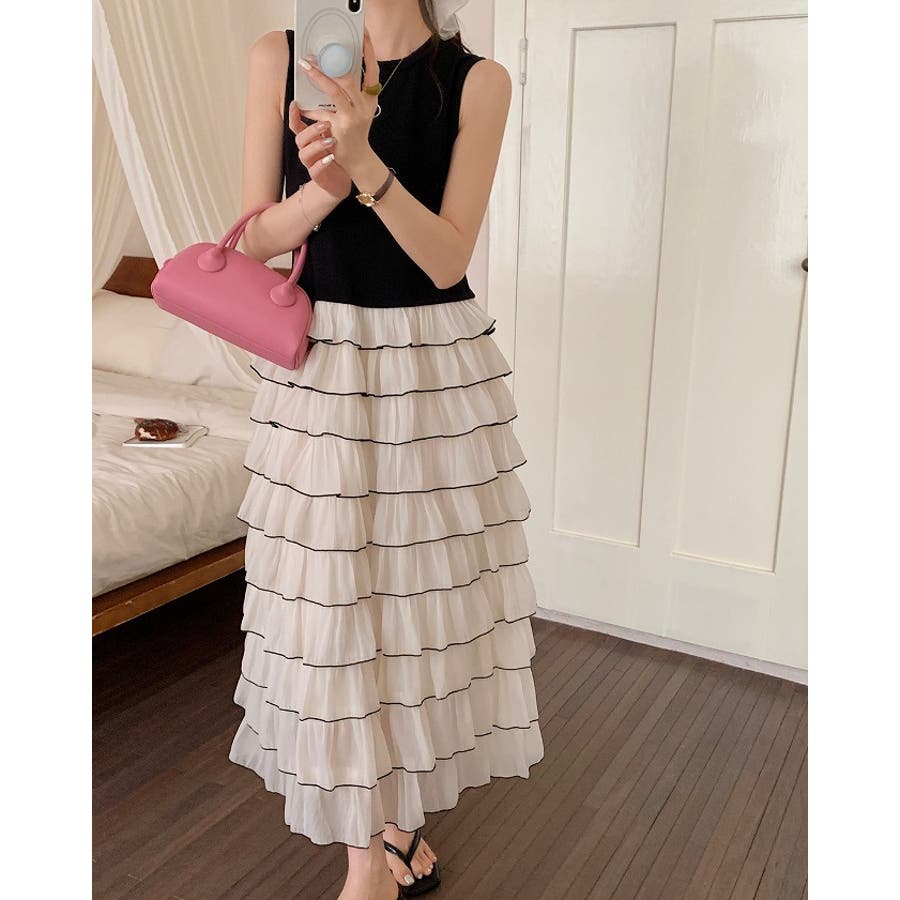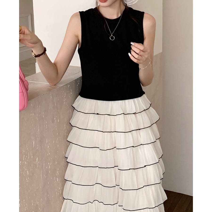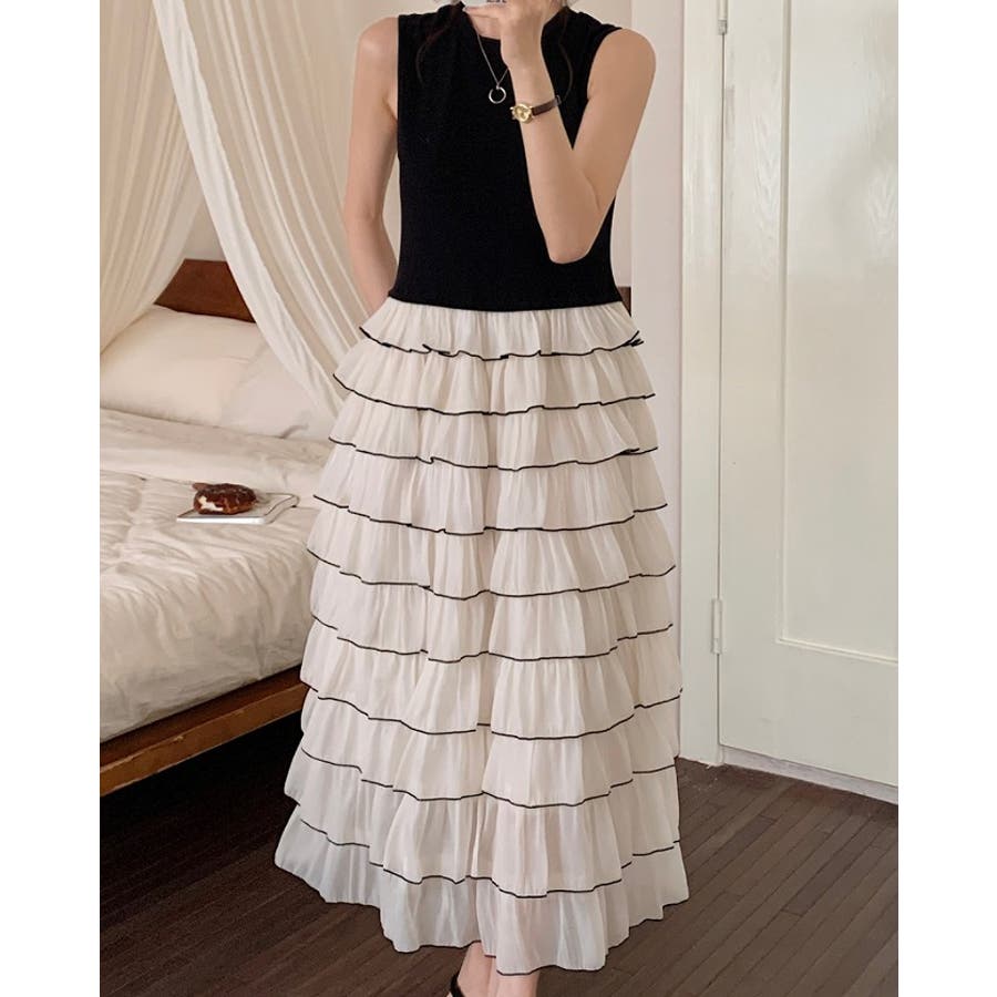 切り替えレイヤード袖なしワンピース