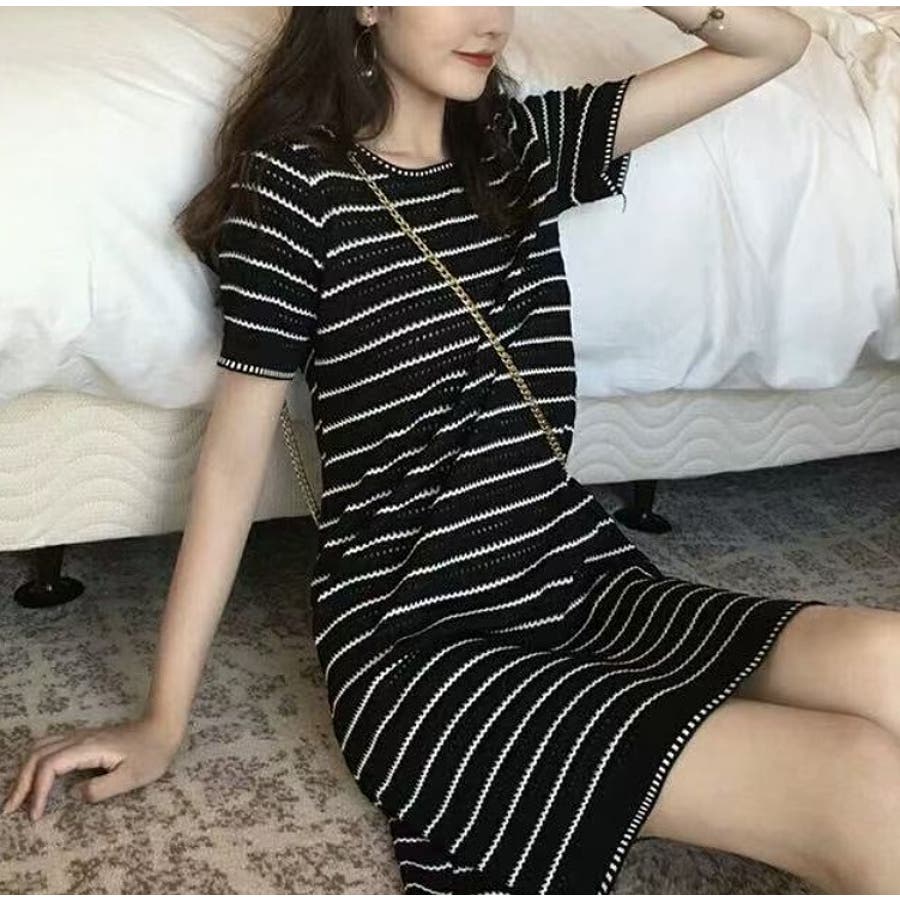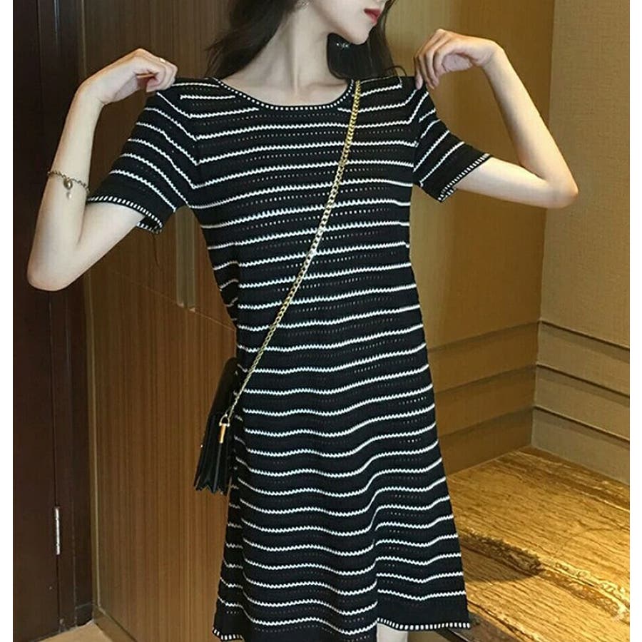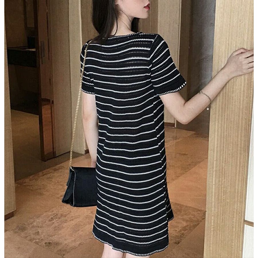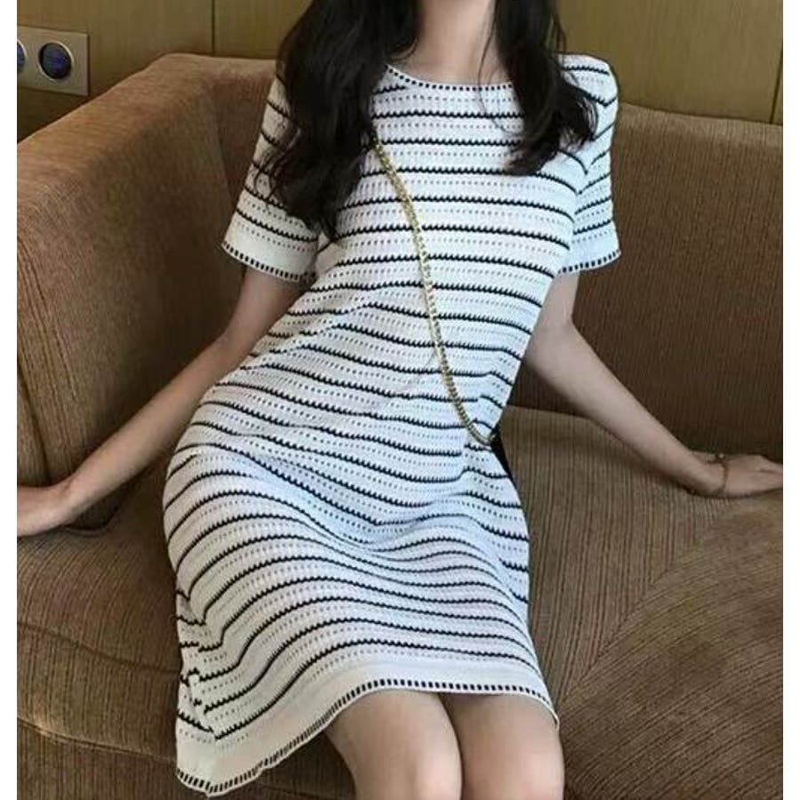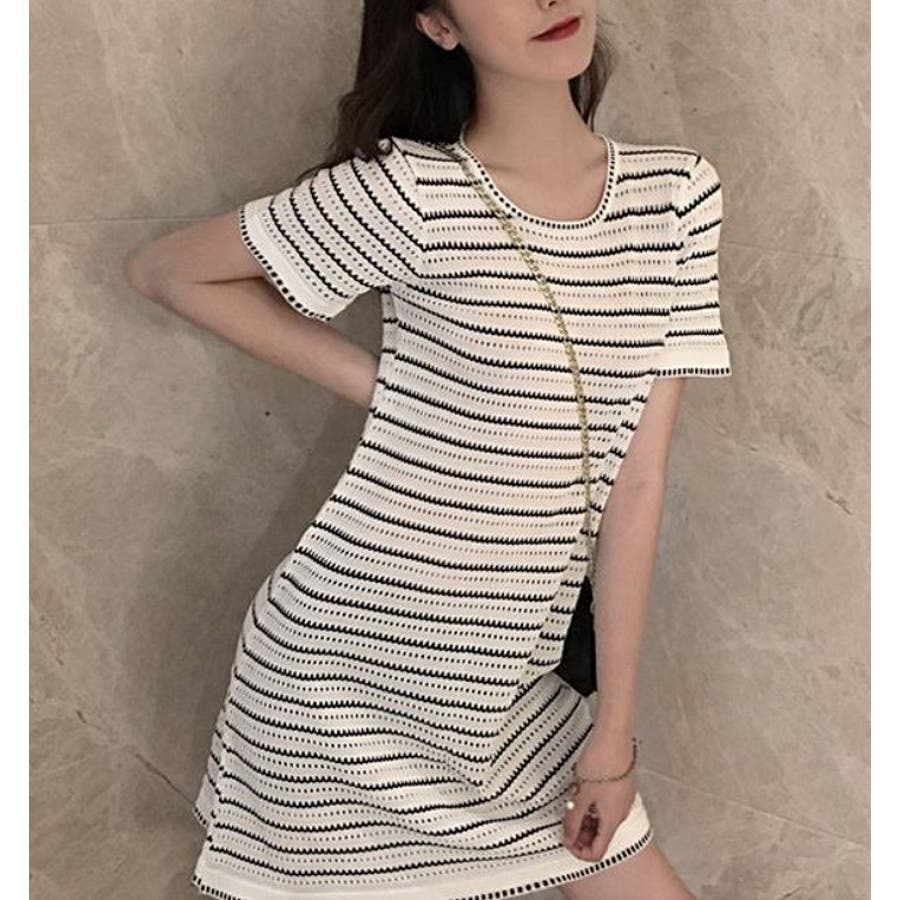 ボーダー柄ニットクルーネック半袖ワンピース