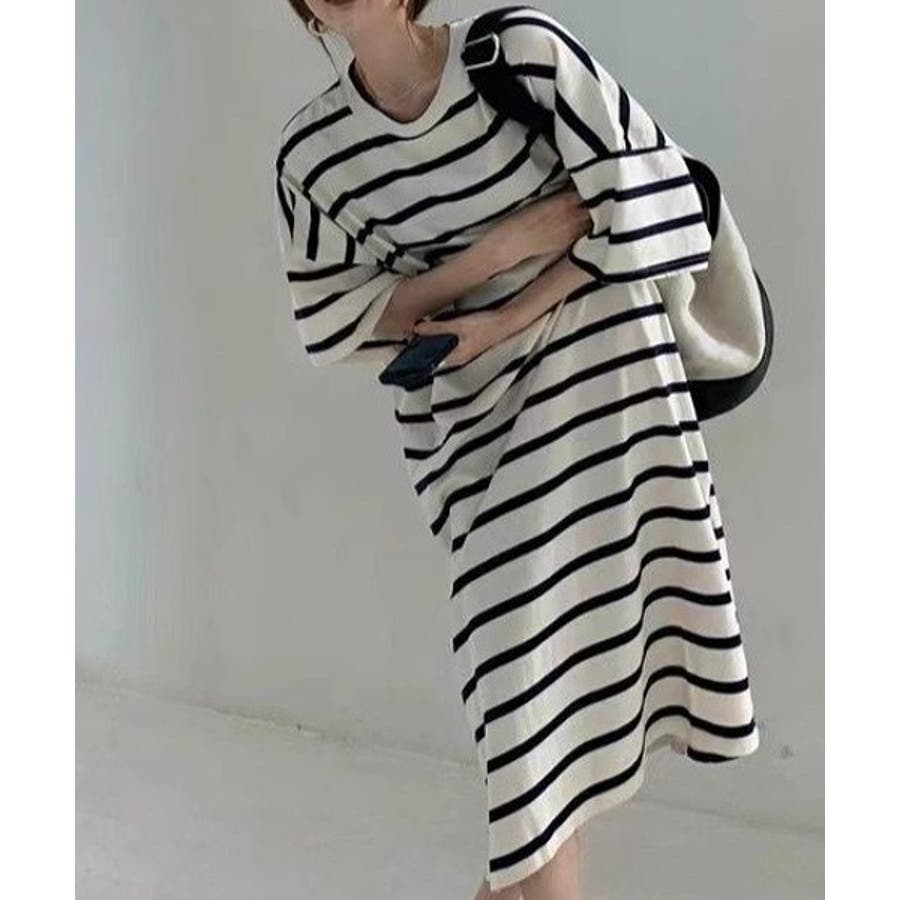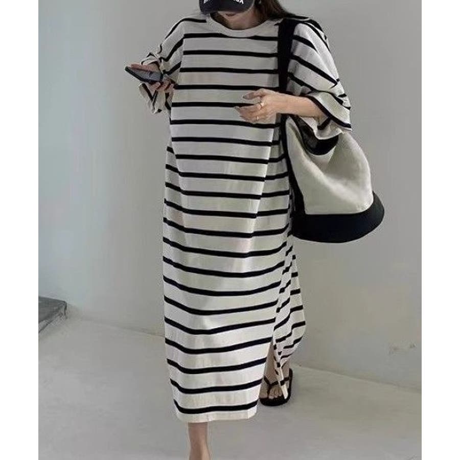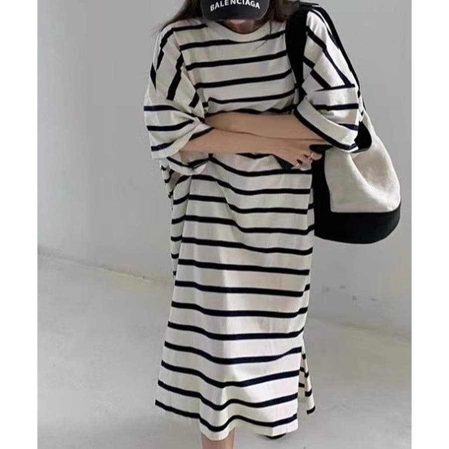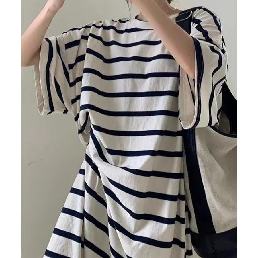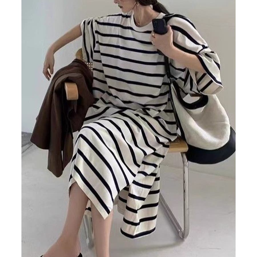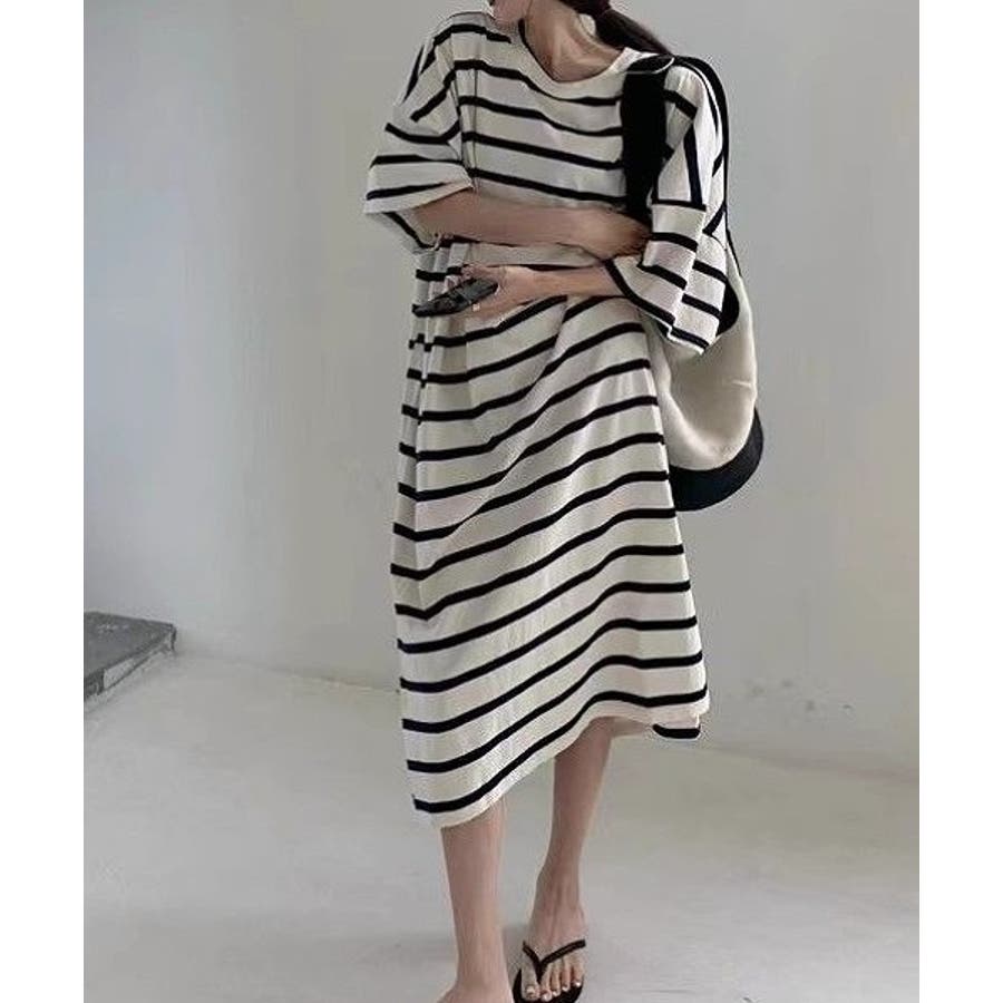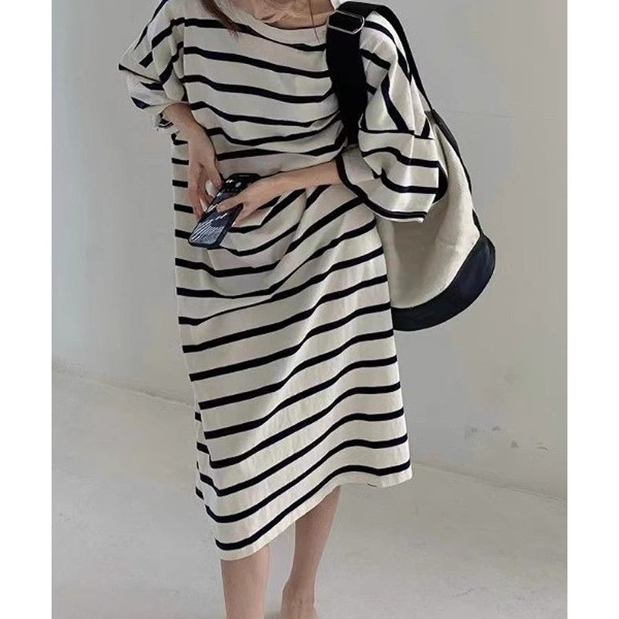 ボーダー柄クルーネック半袖ワンピース