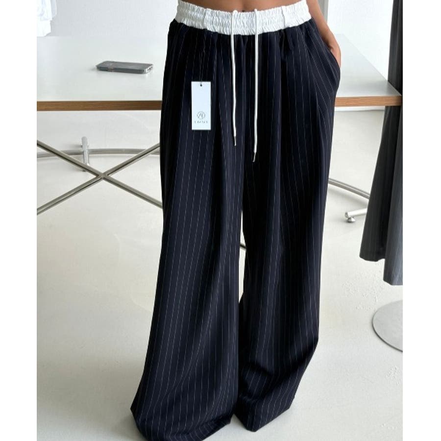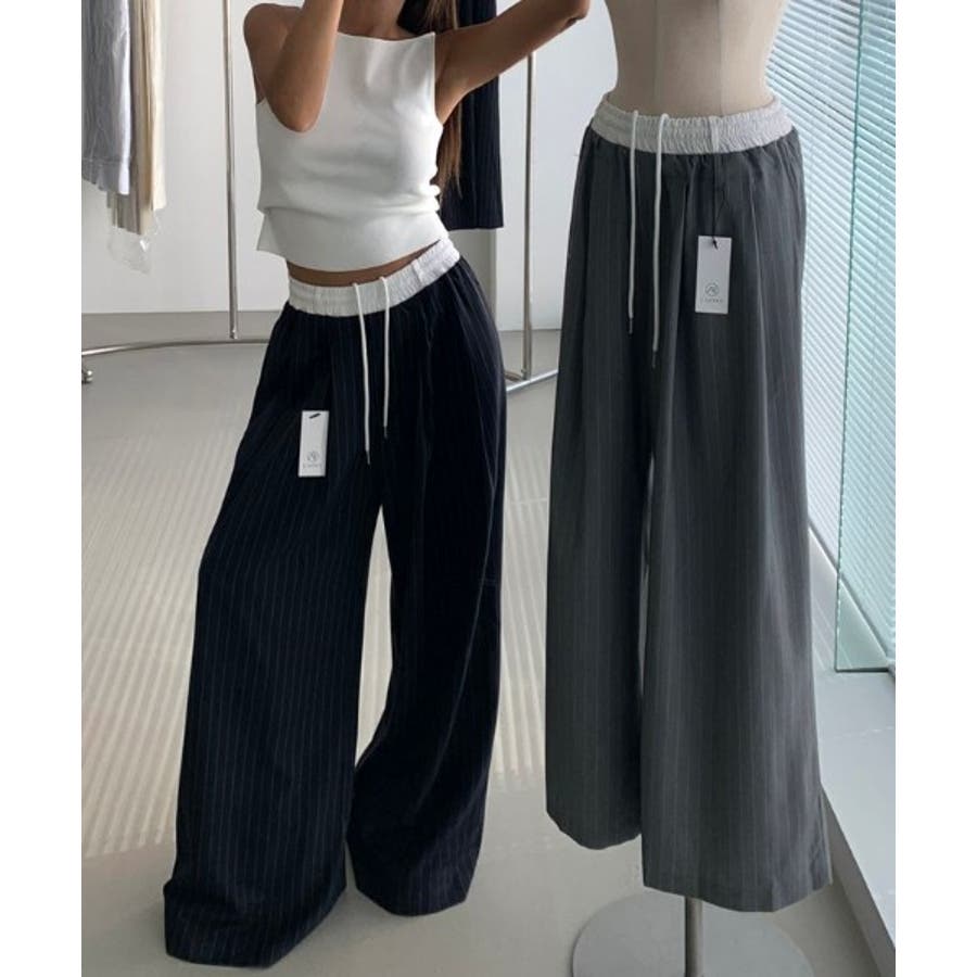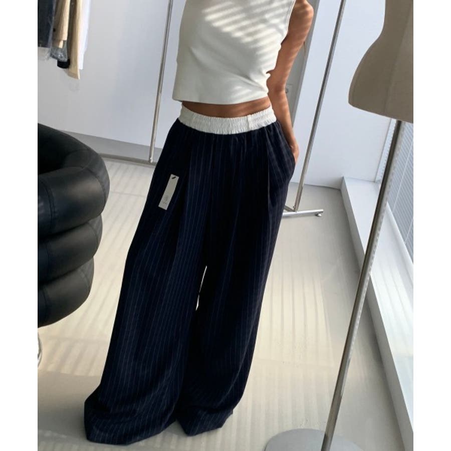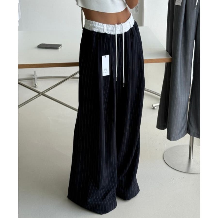 ドローストリングパッチワークストライプ柄ワイドパンツ