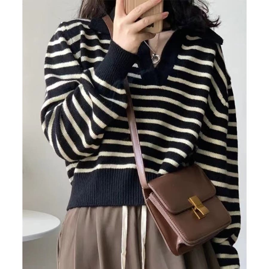 Vネックボーダー柄ニットトップス