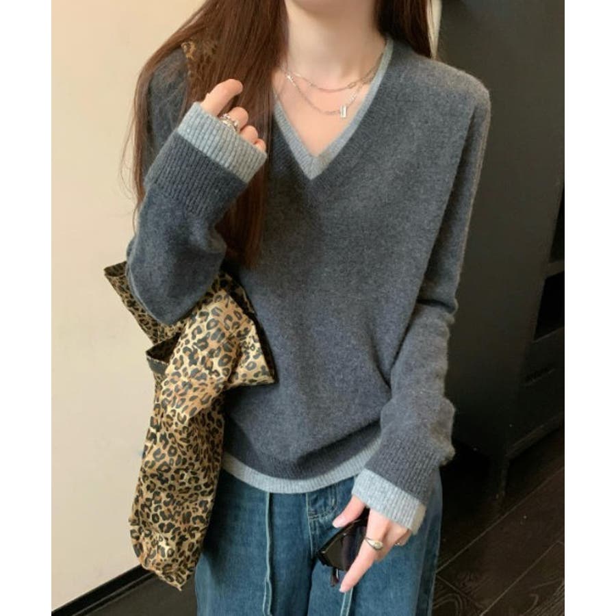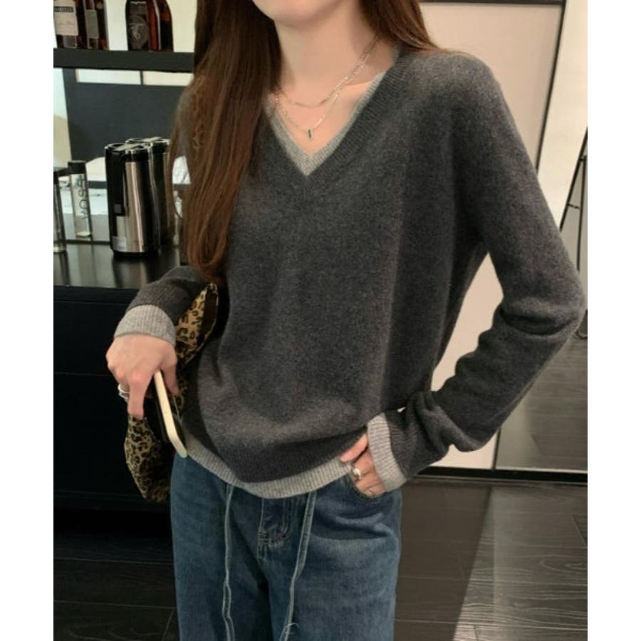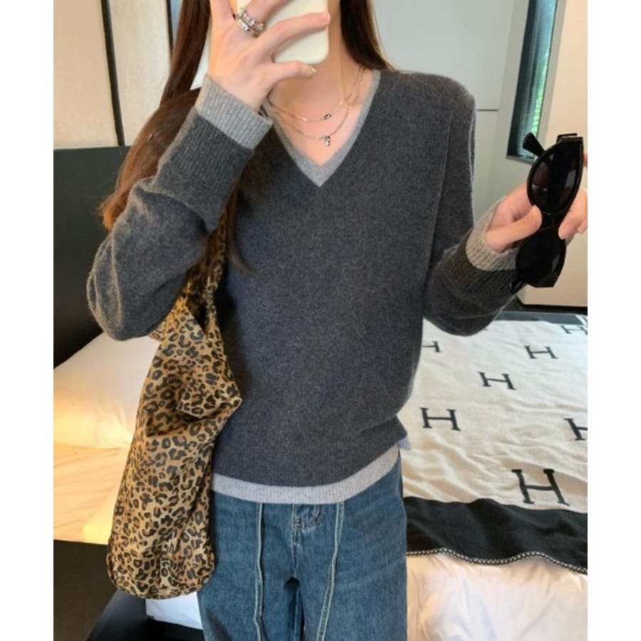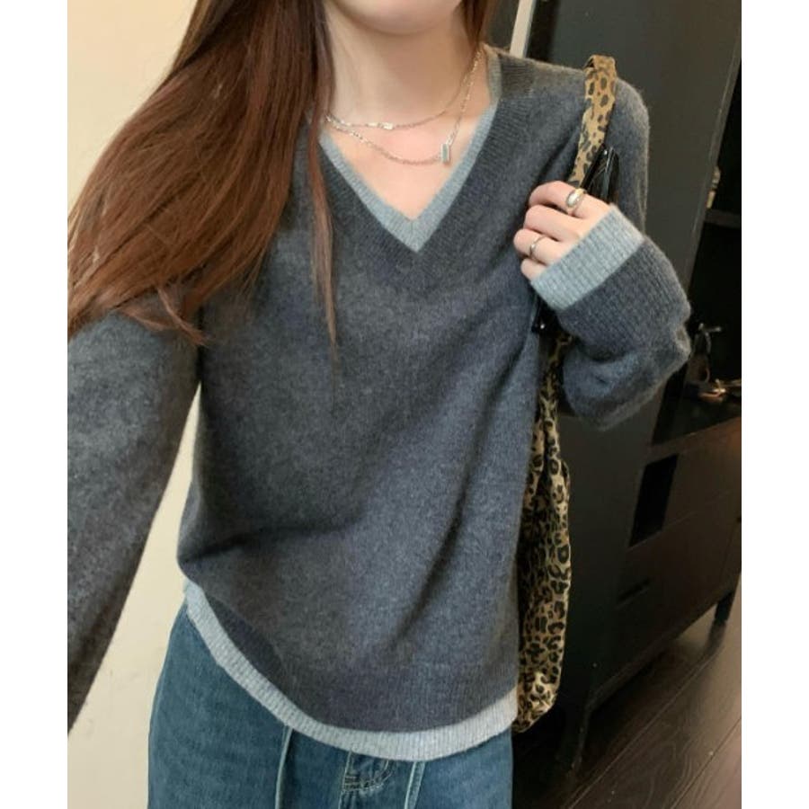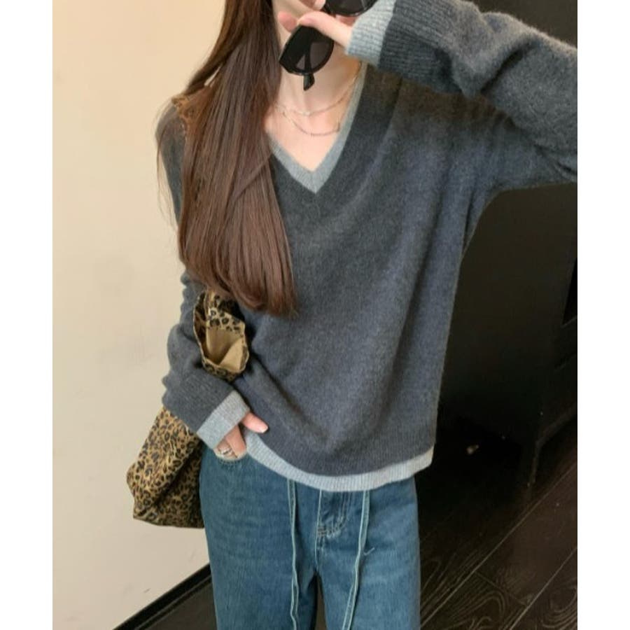 Vネック切り替えニットトップス