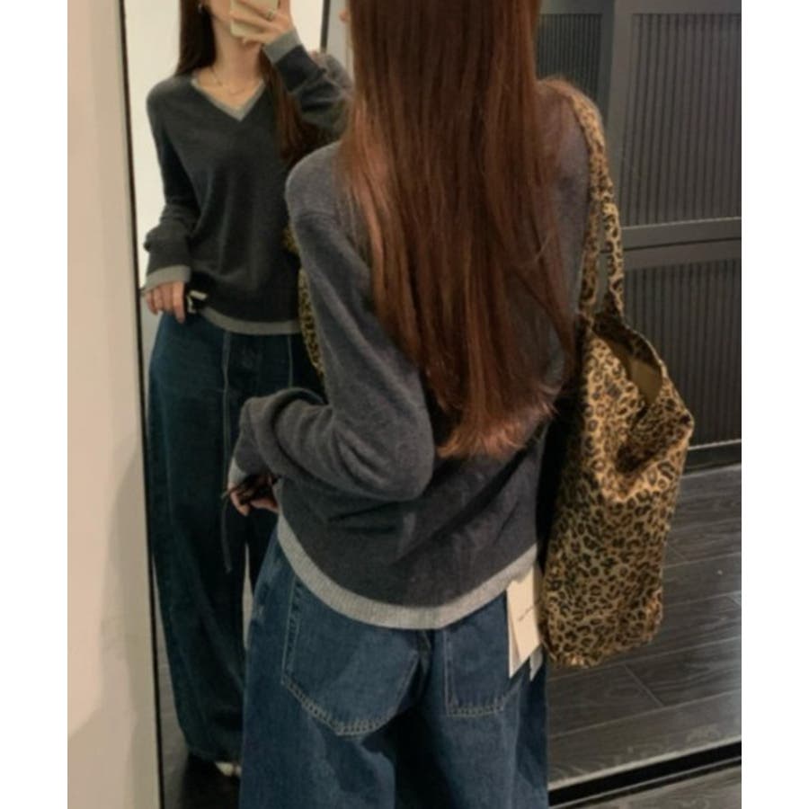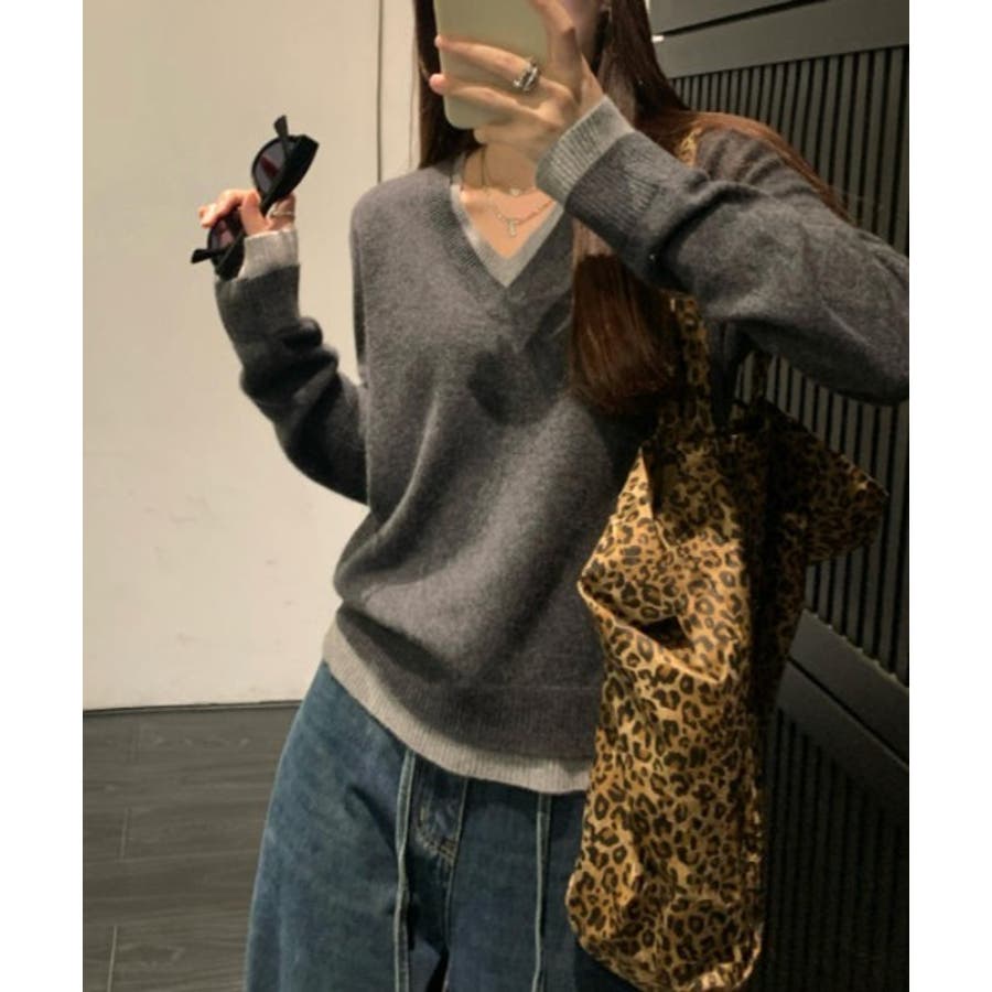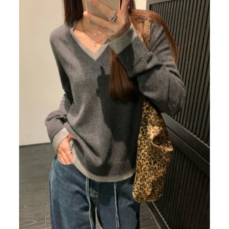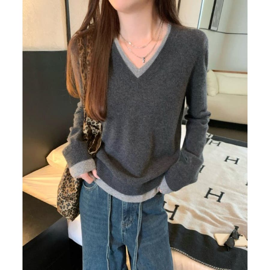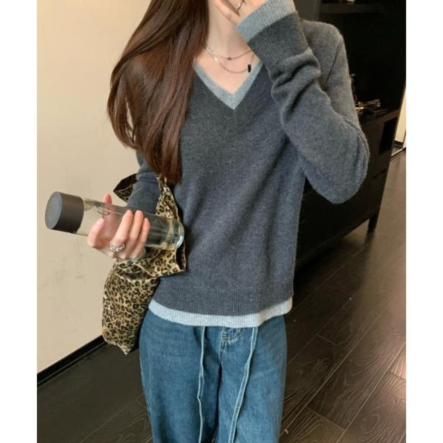 Vネック切り替えニットトップス