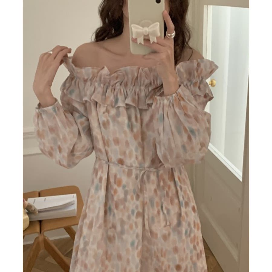 ボートネックフリル長袖ワンピース