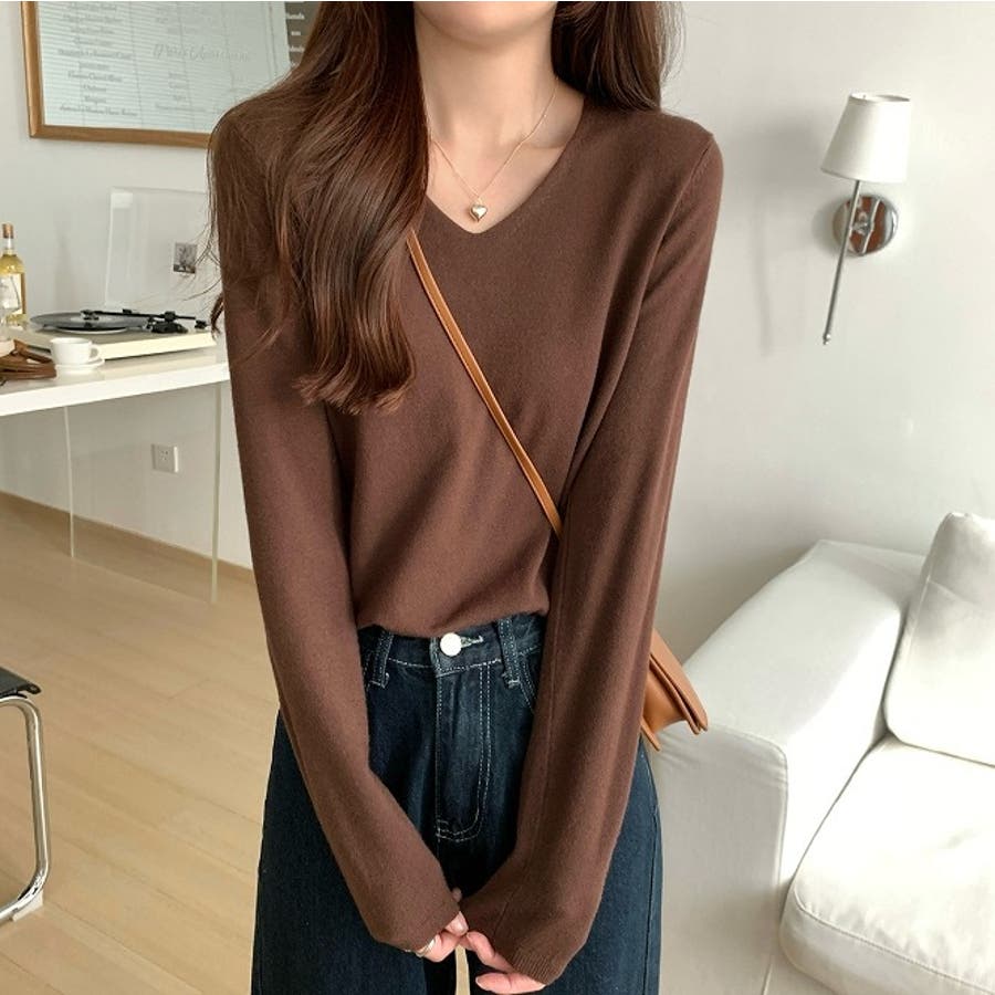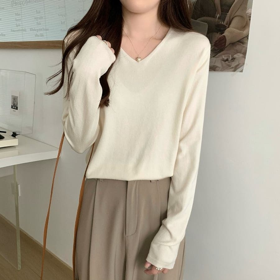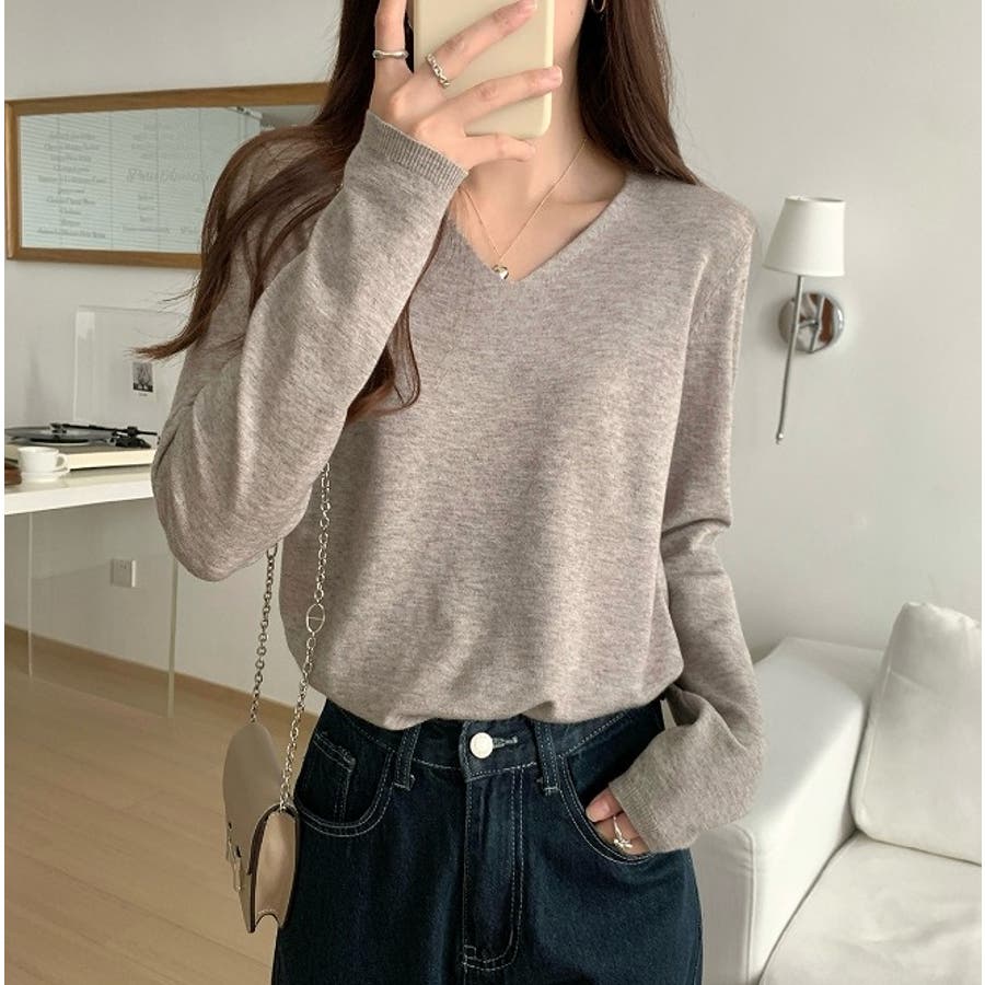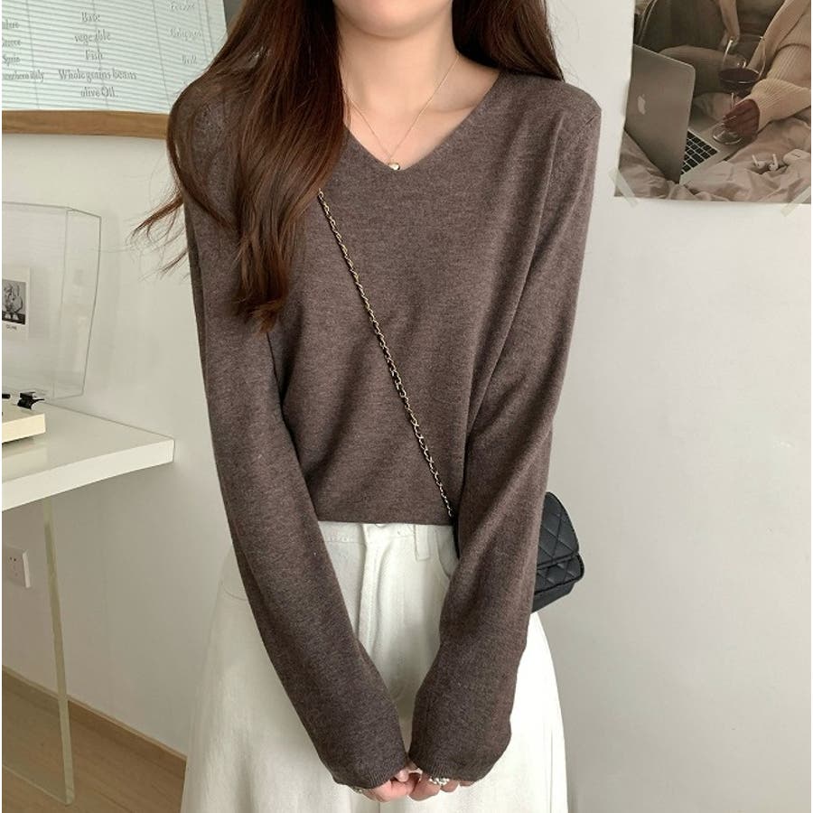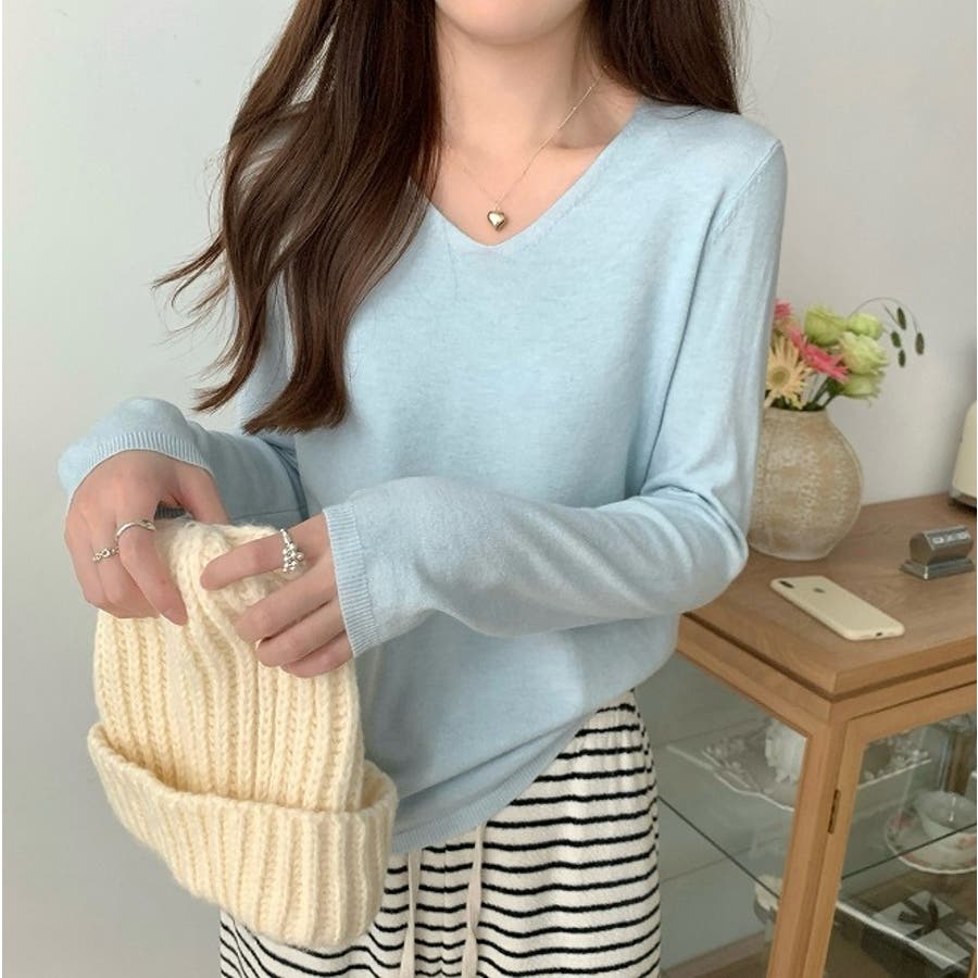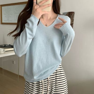 Vネック無地ニットトップス