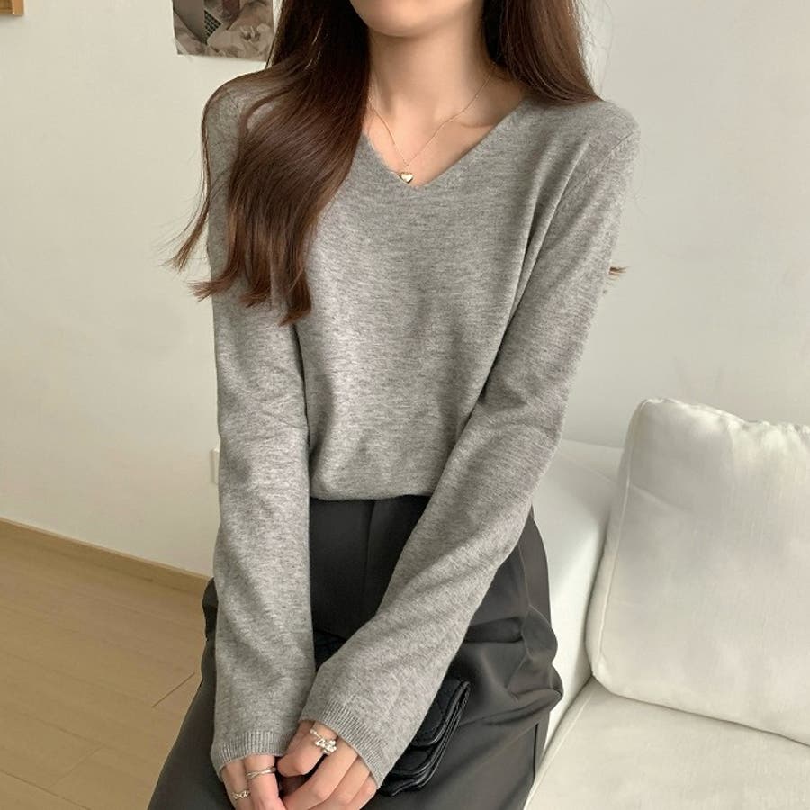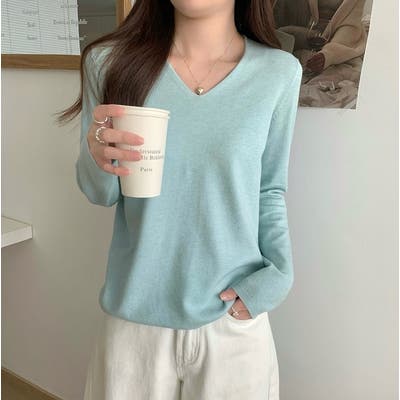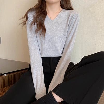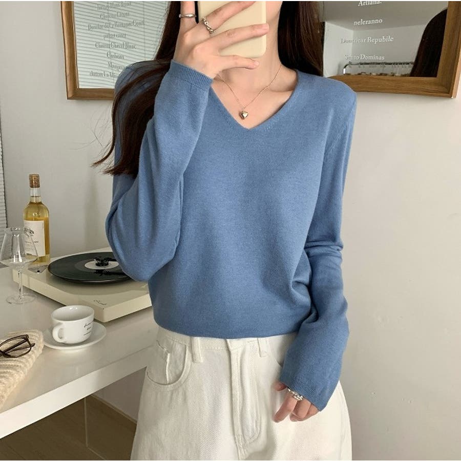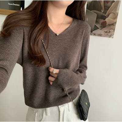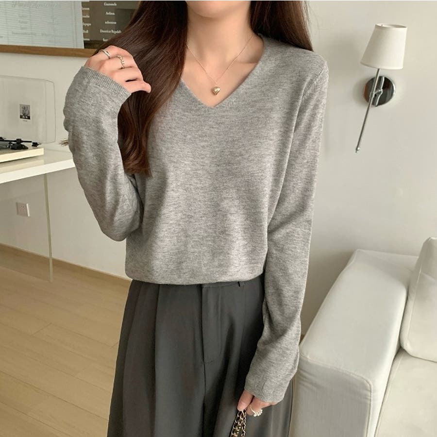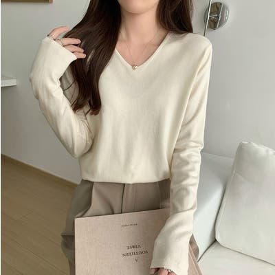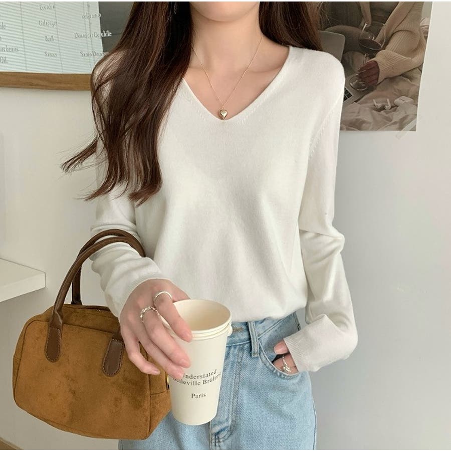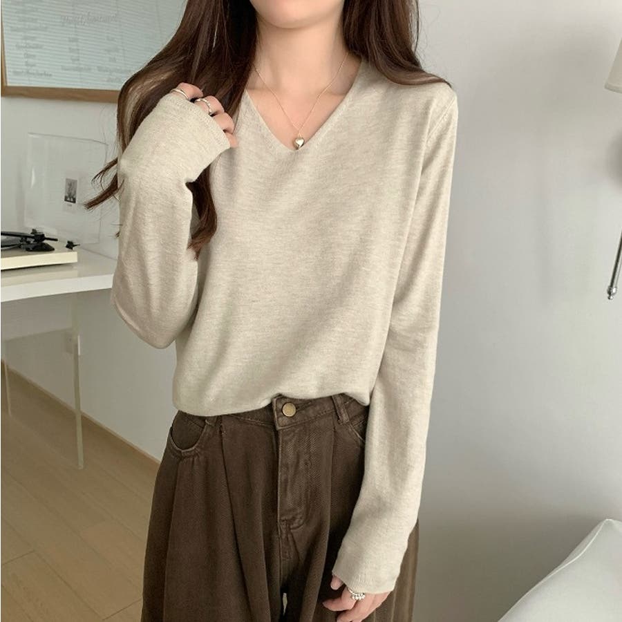 Vネック無地ニットトップス