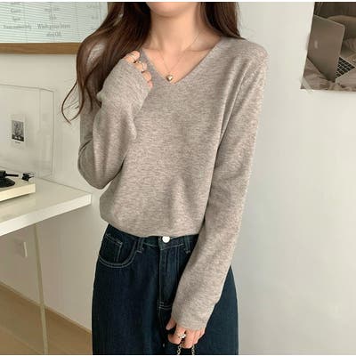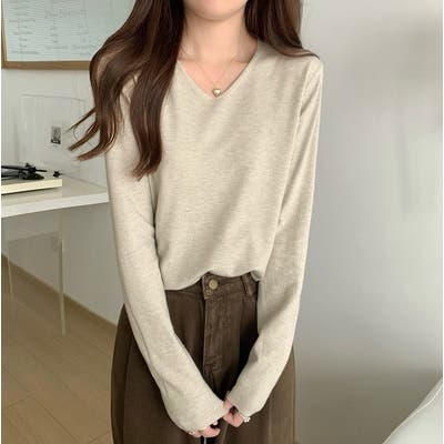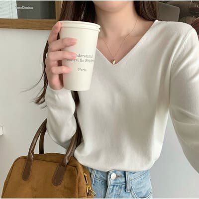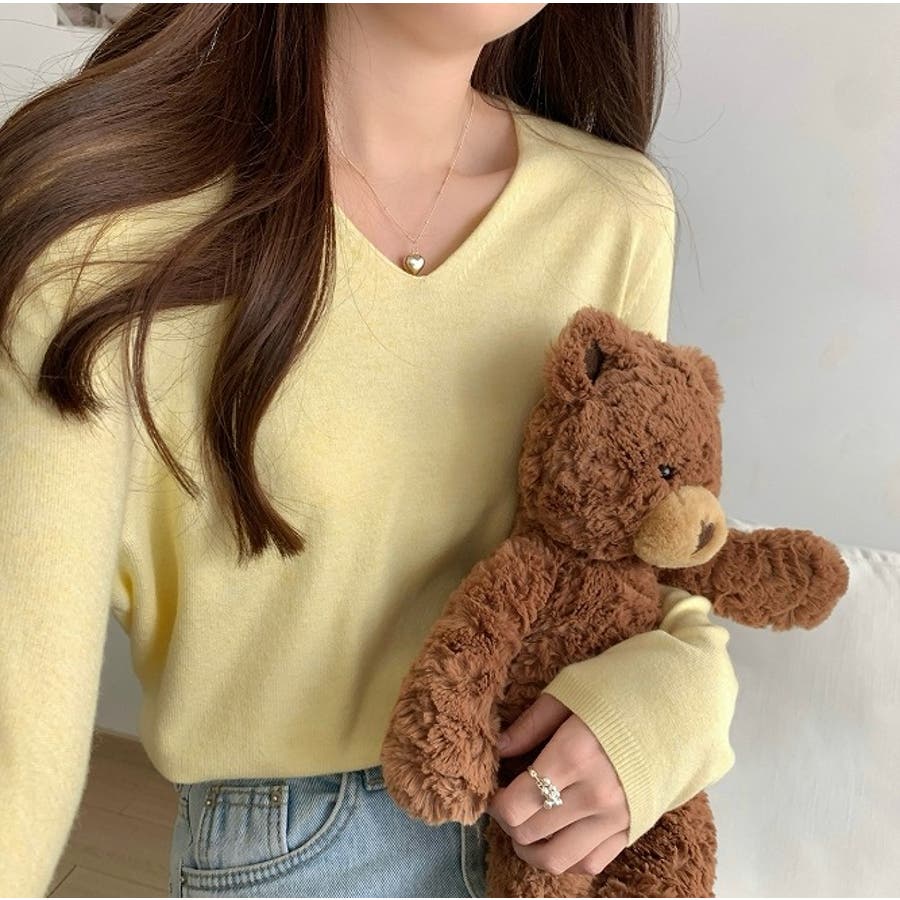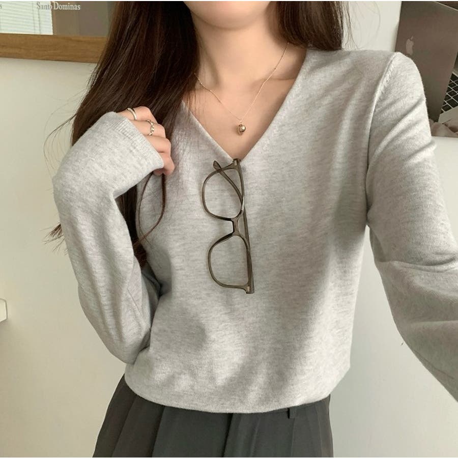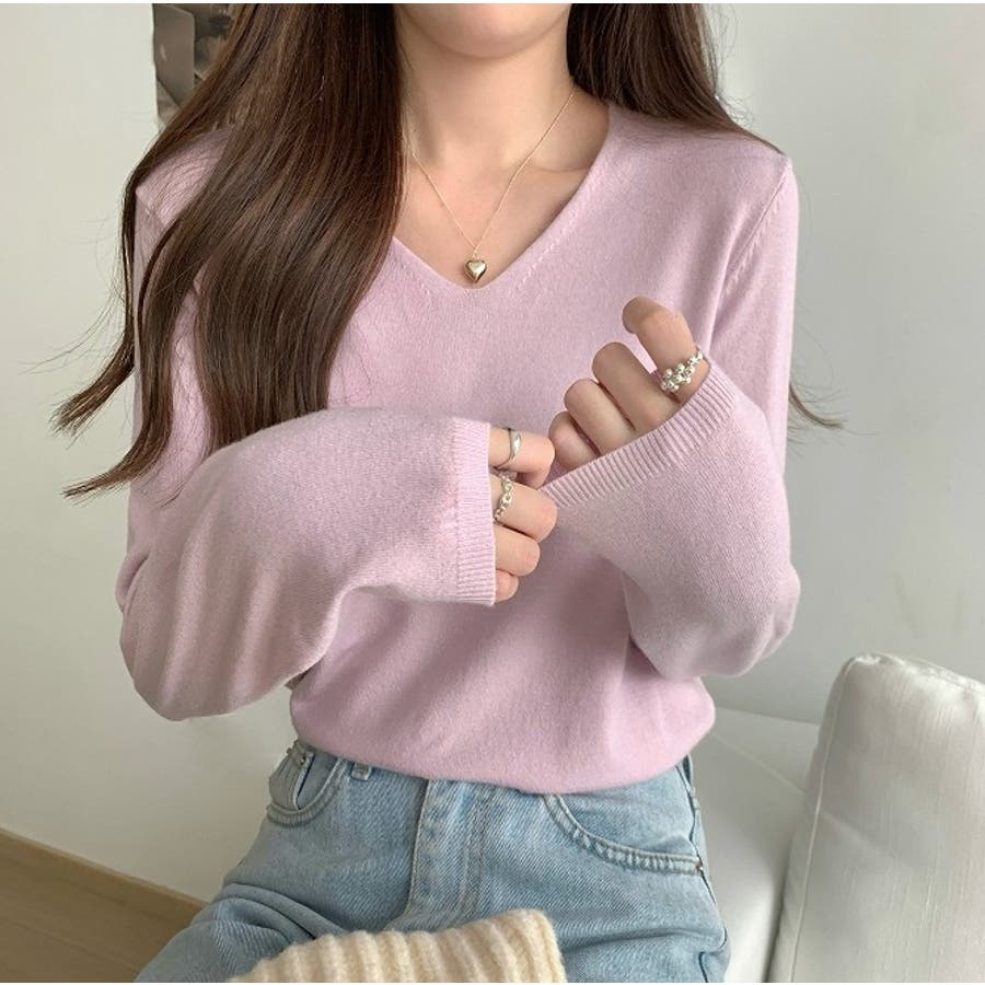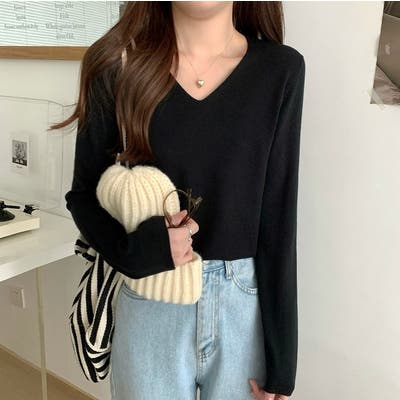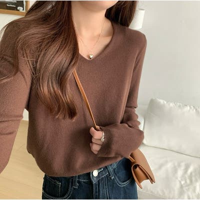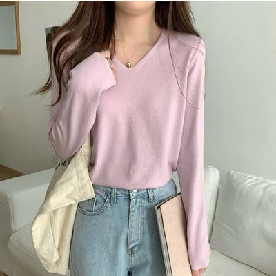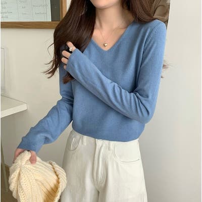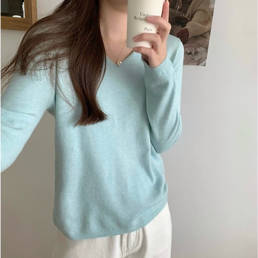 Vネック無地ニットトップス