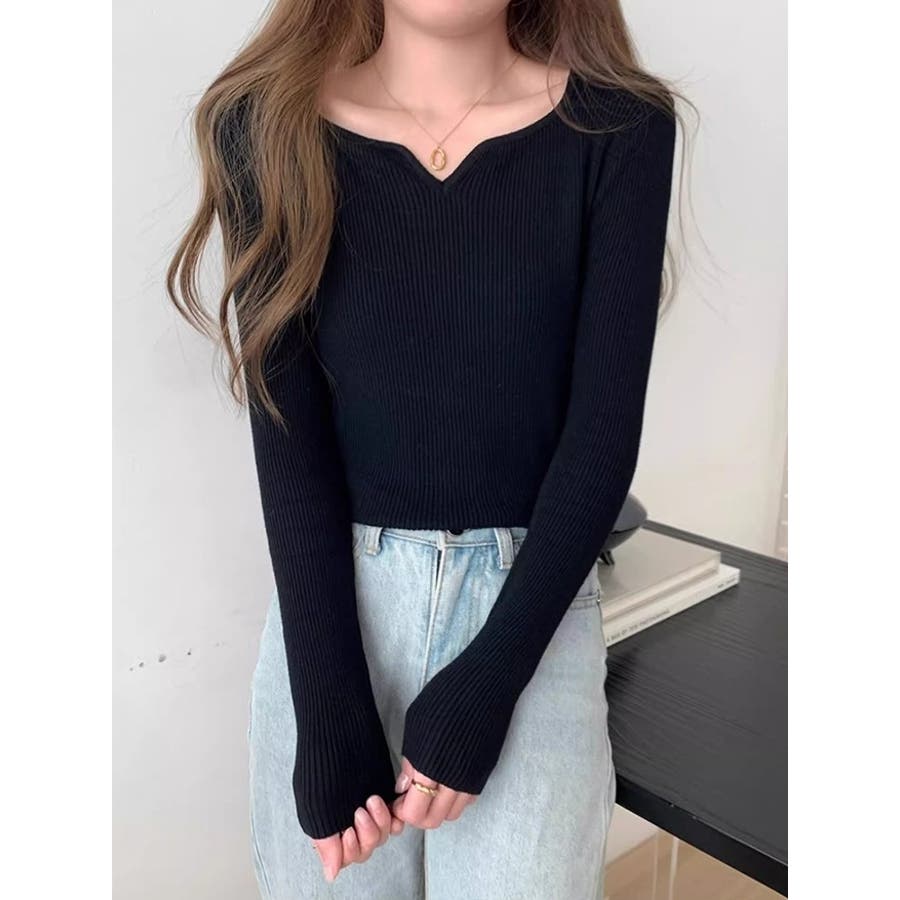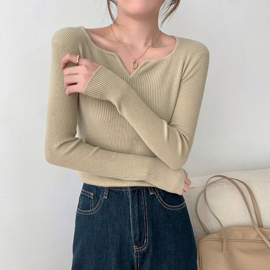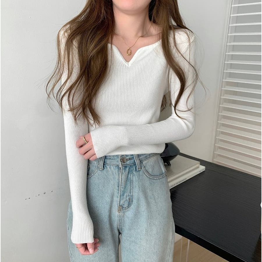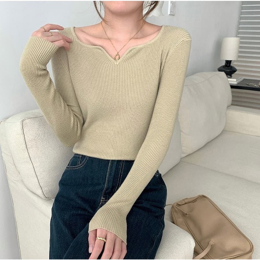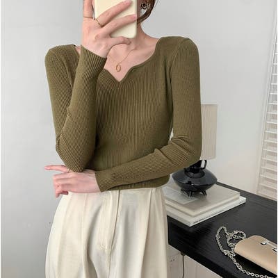 Vネック無地ニットトップス
