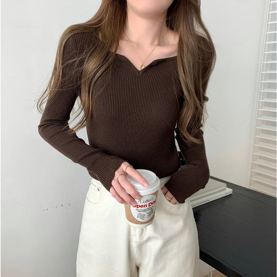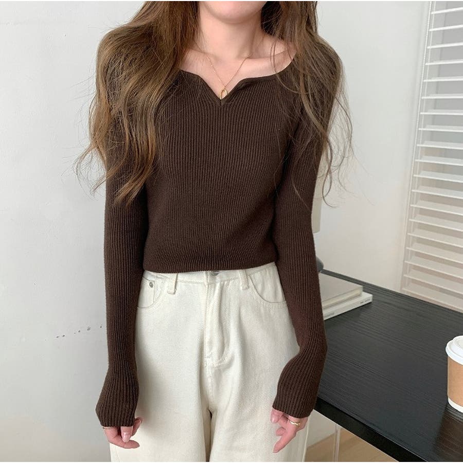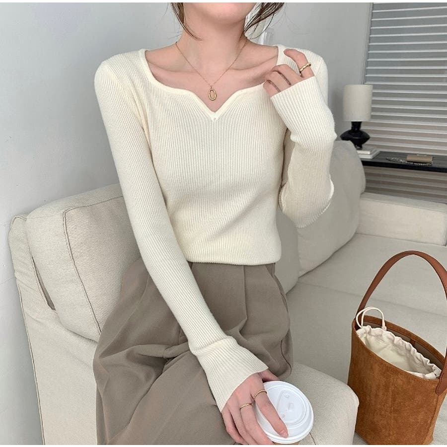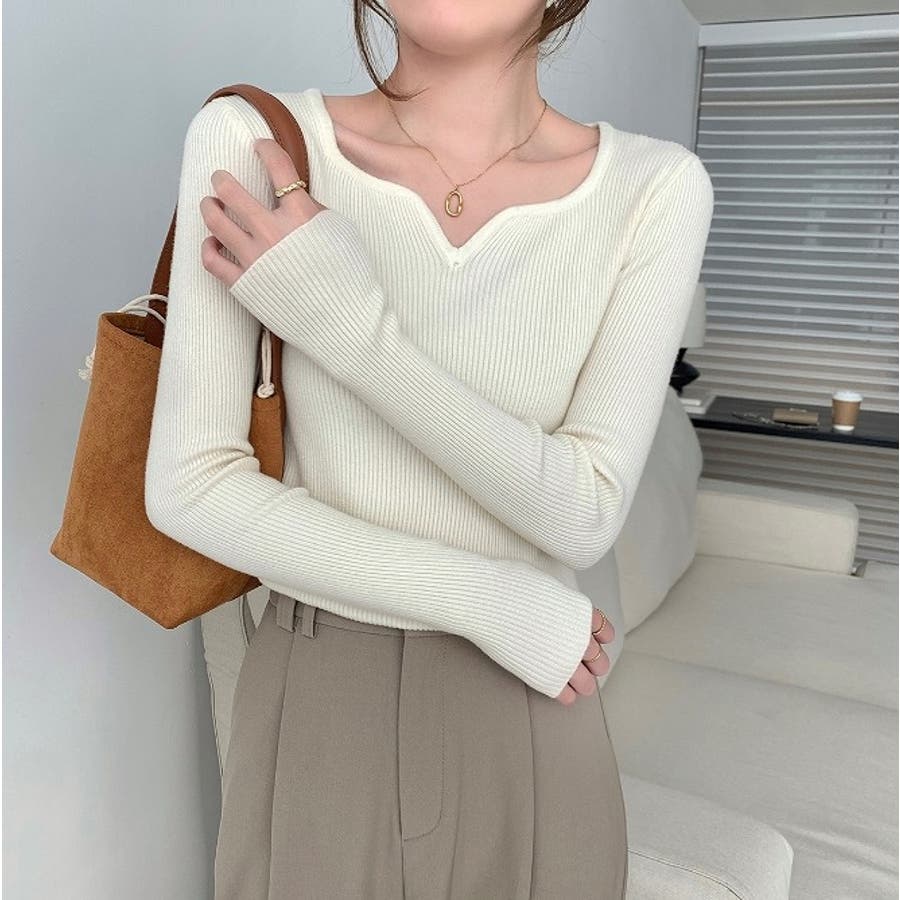 Vネック無地ニットトップス