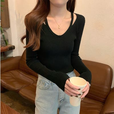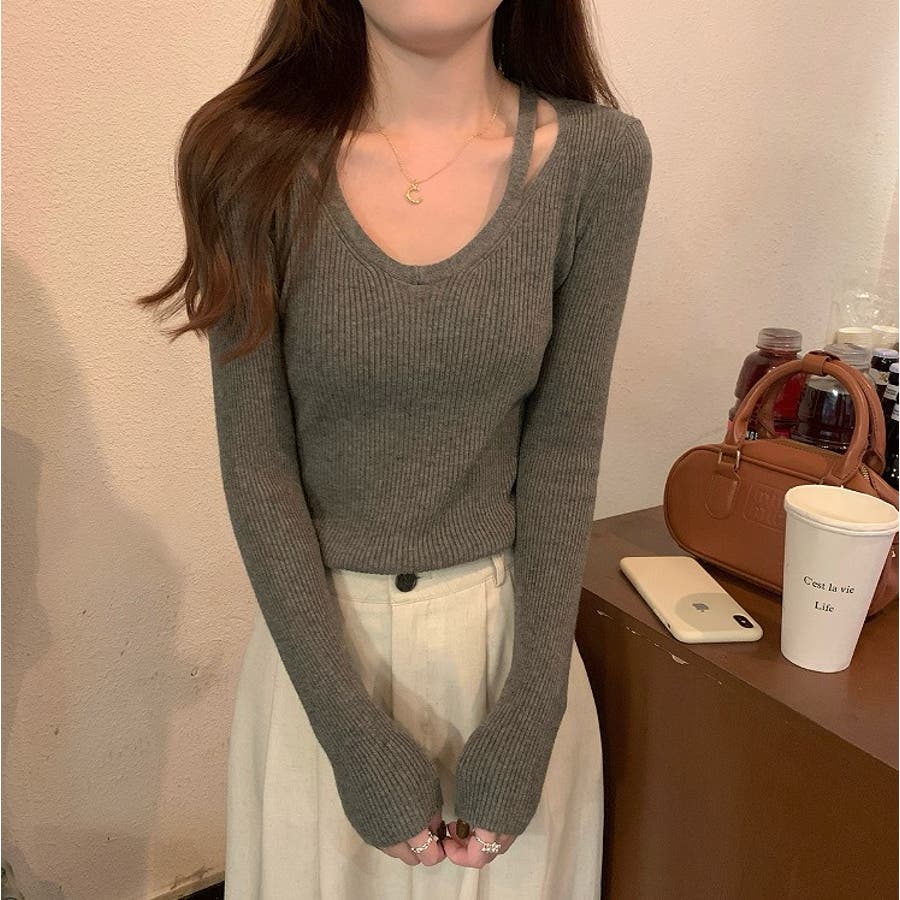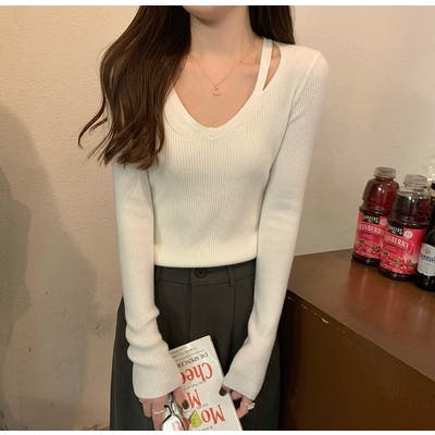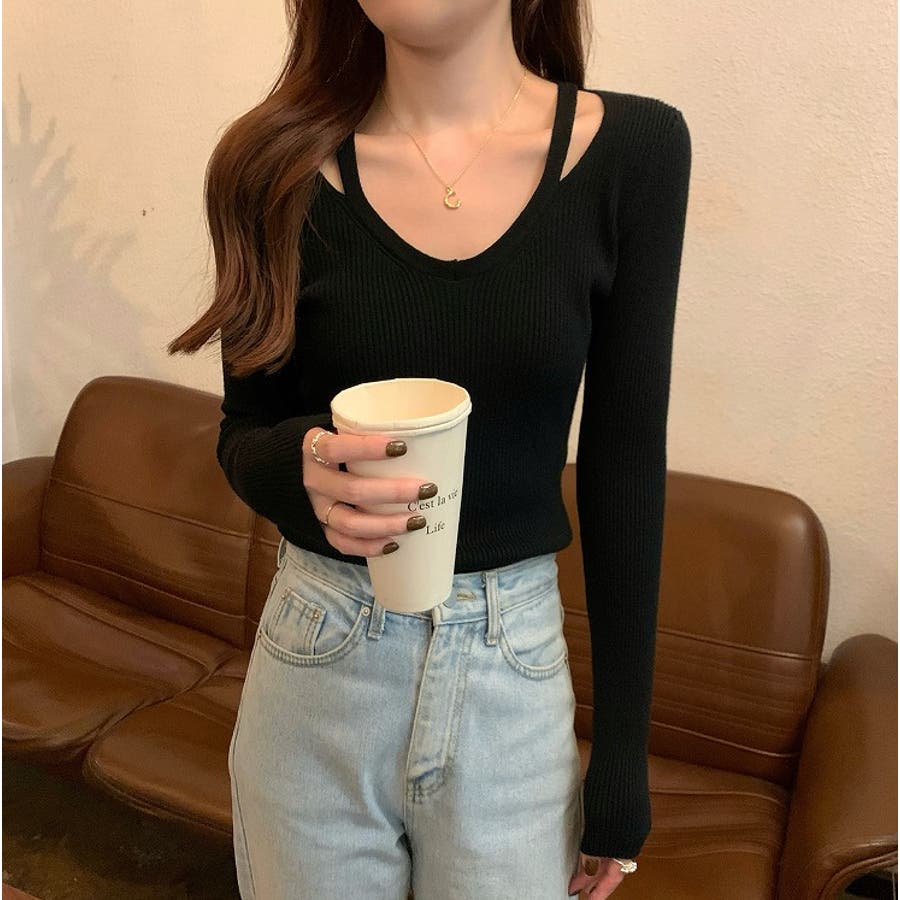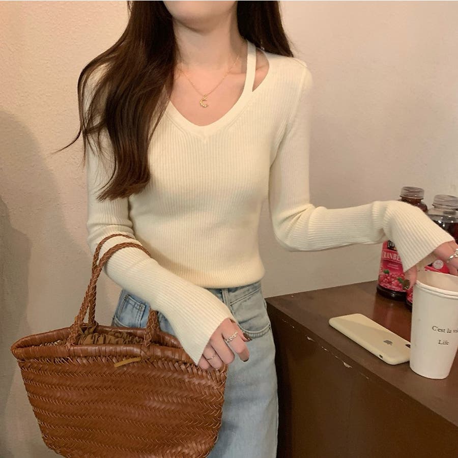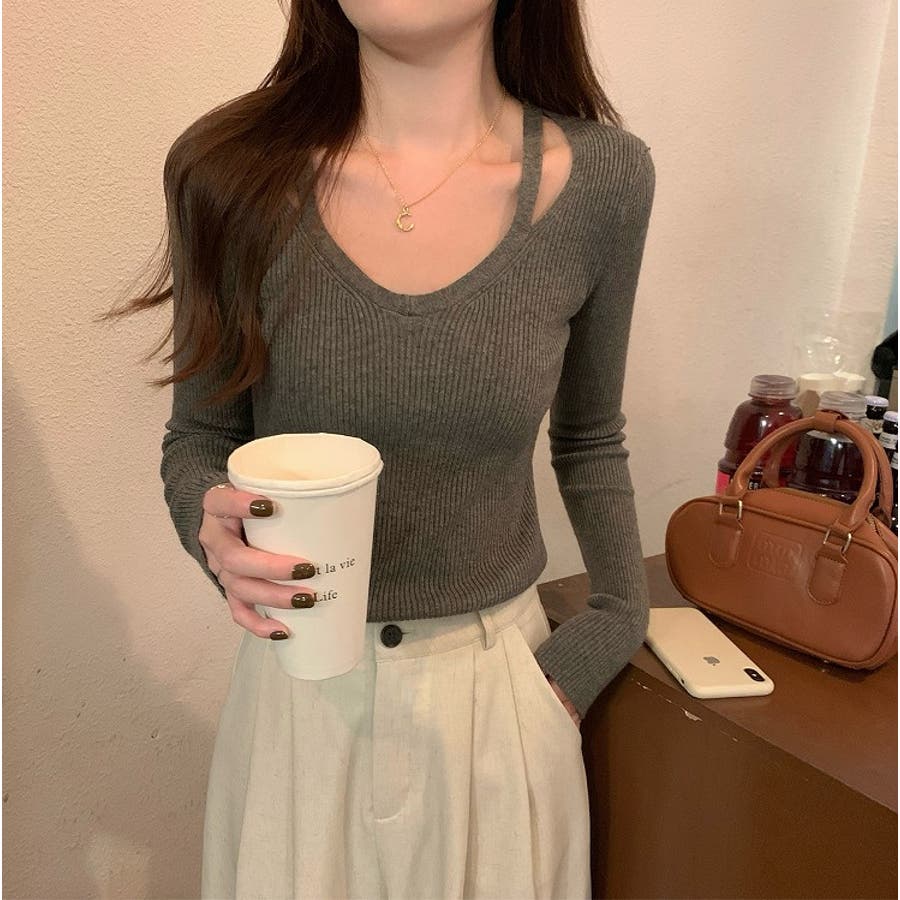 着回ししやすいVネック無地長袖ニットトップス