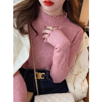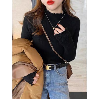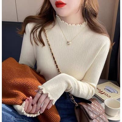デザインハーフネック無地ニットトップス