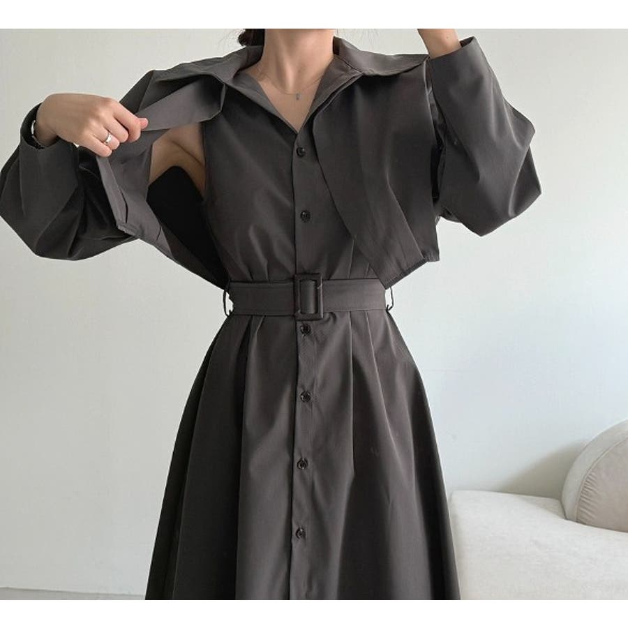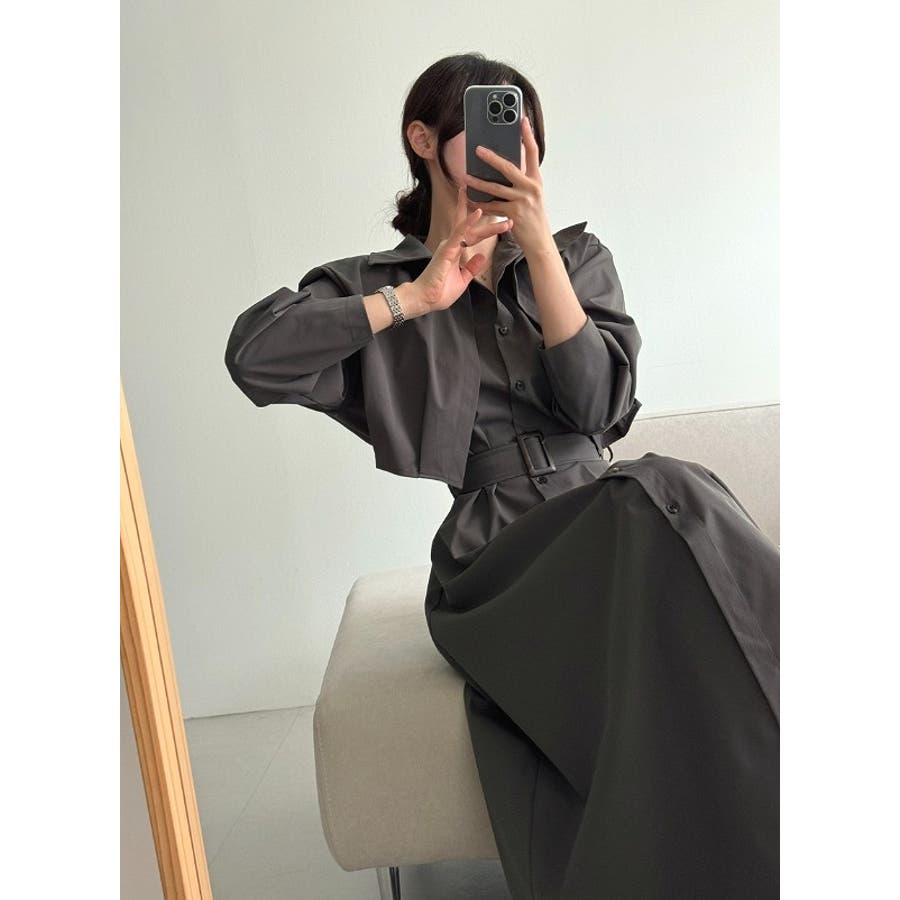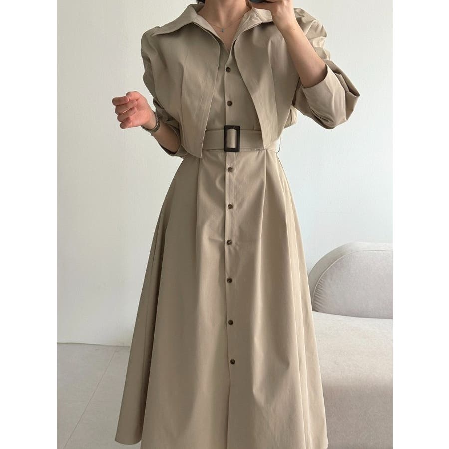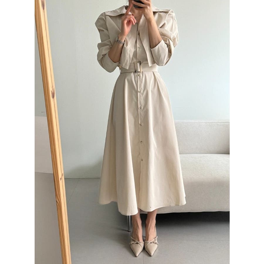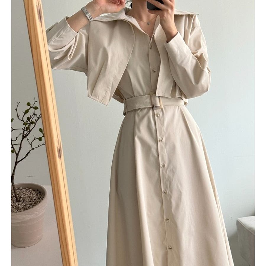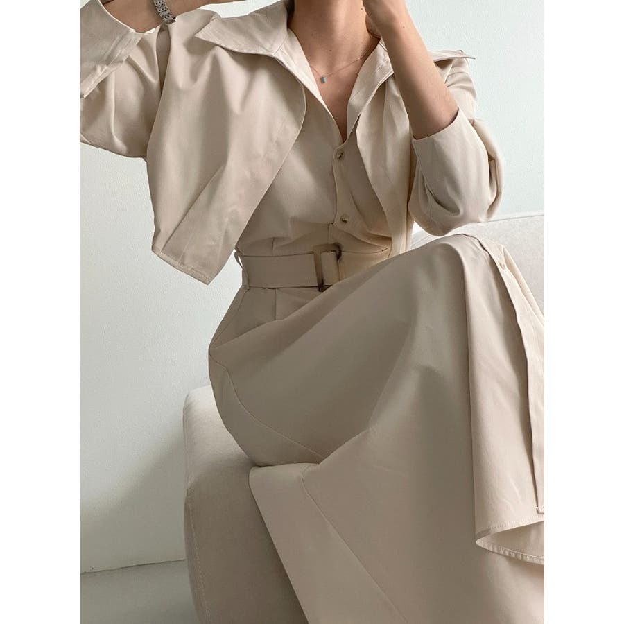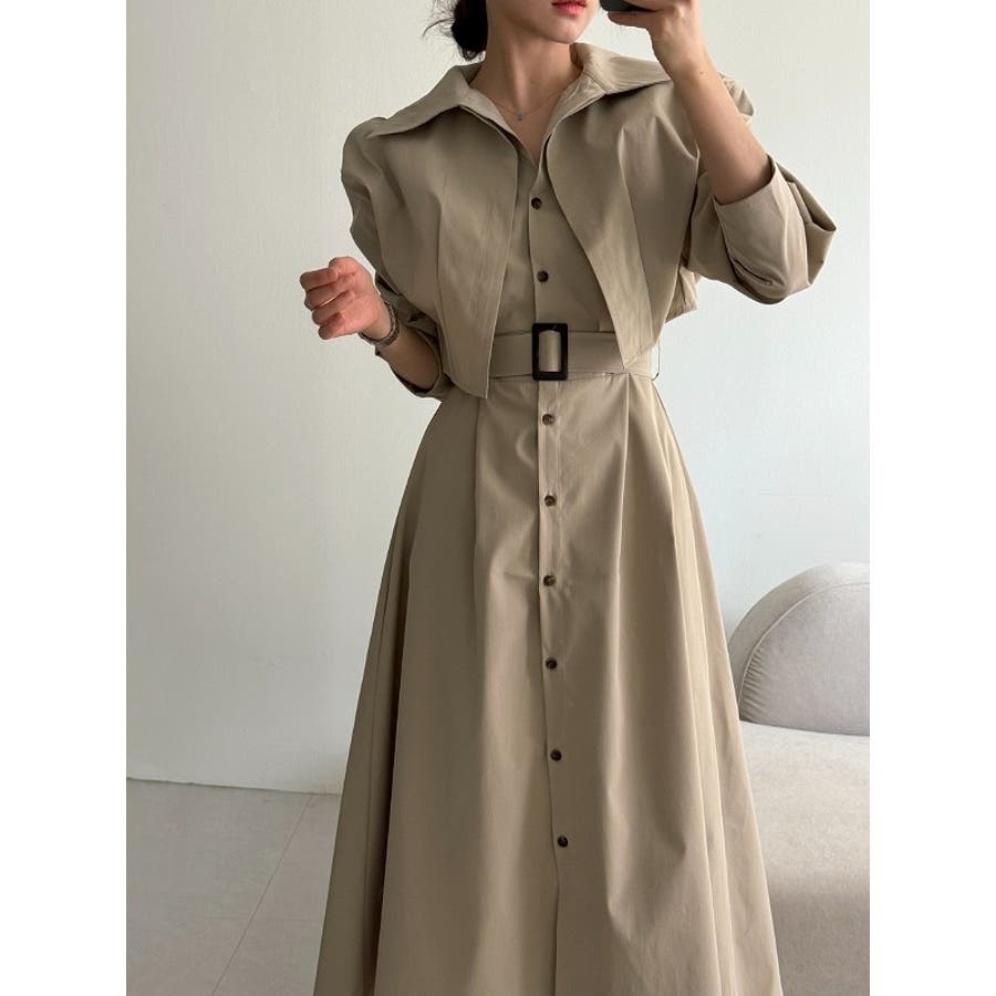 ベルト付きシングルブレストワンピース無地ショットコート2点セットアップ