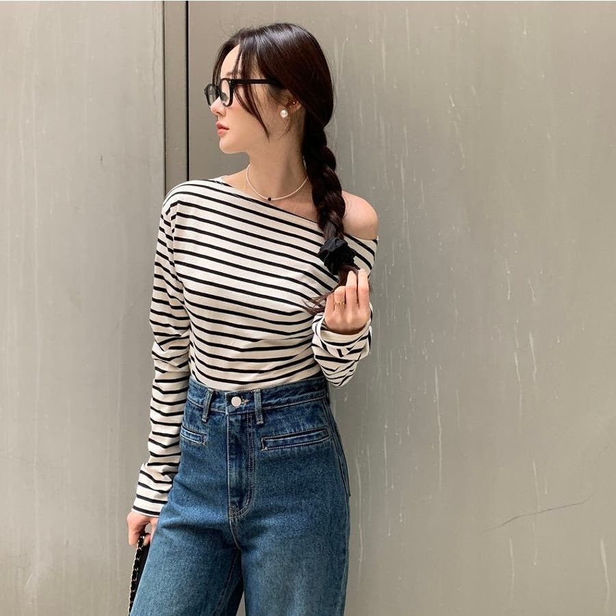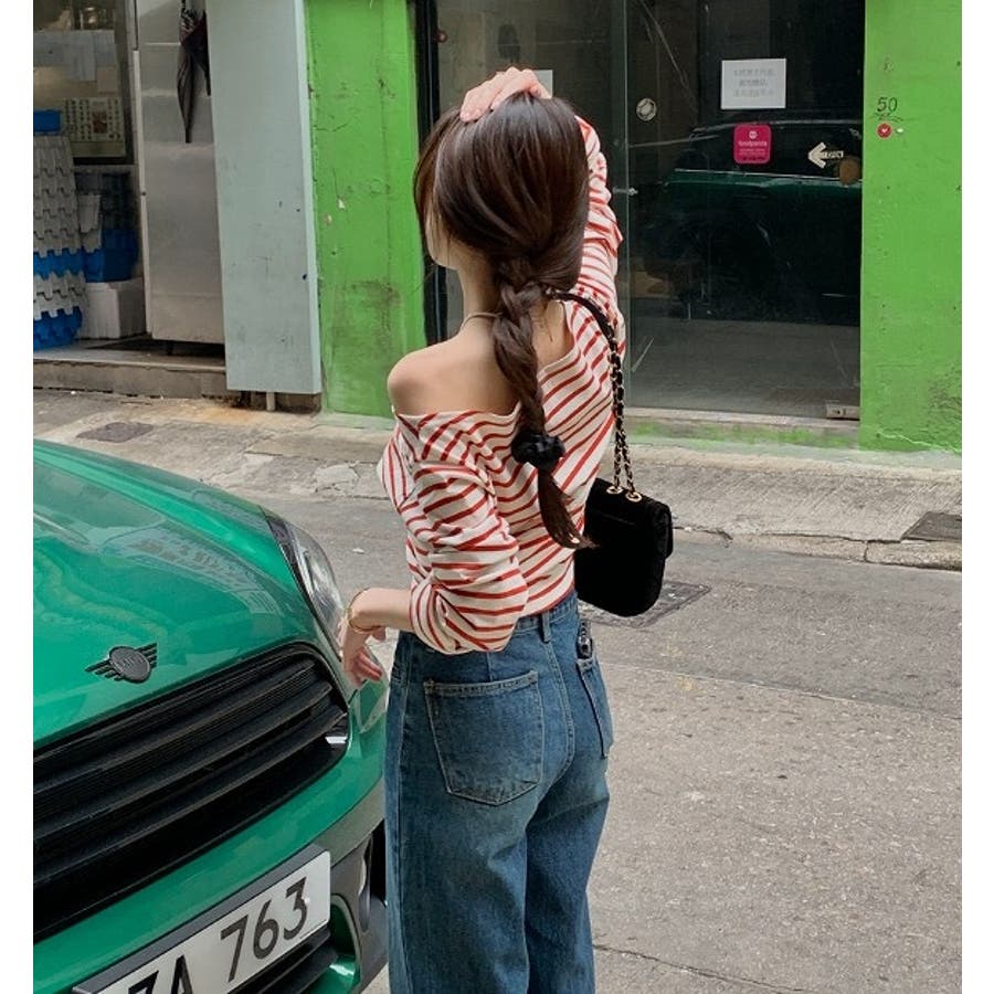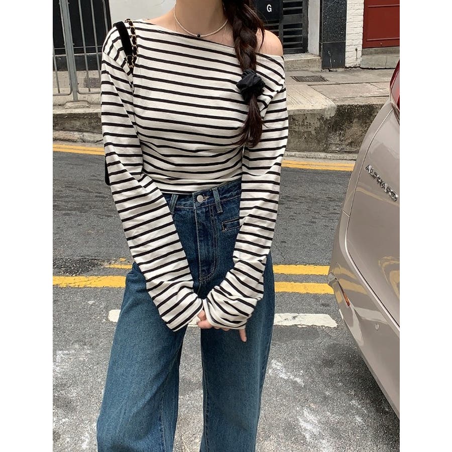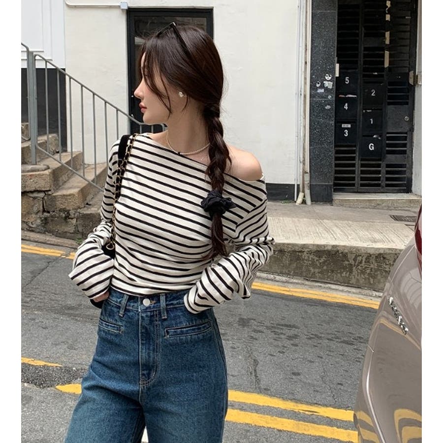 ボートネックオフショルボーダー配色トップス