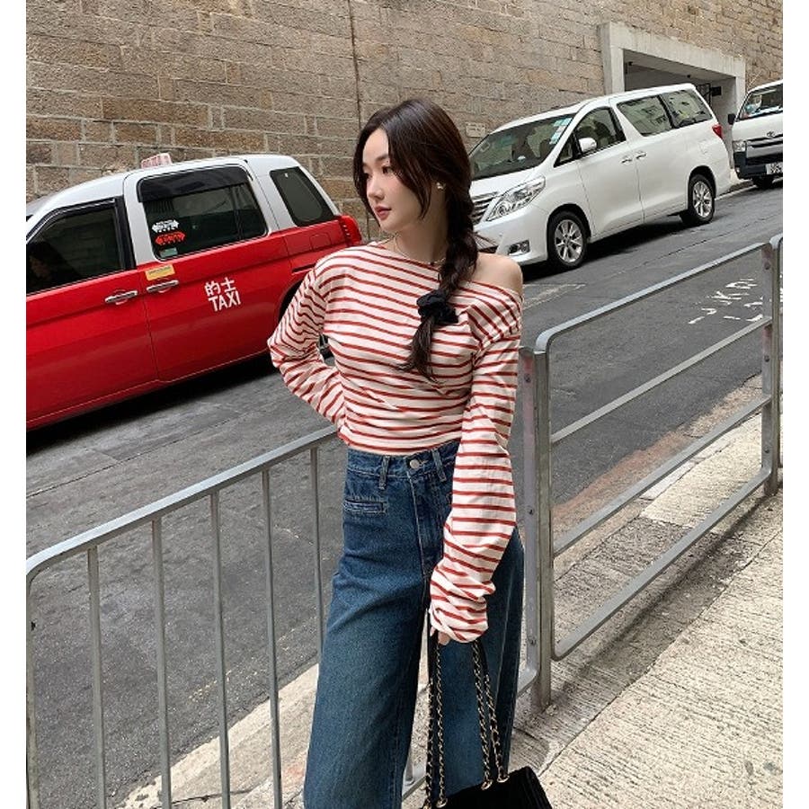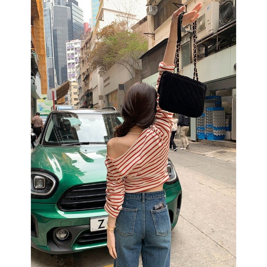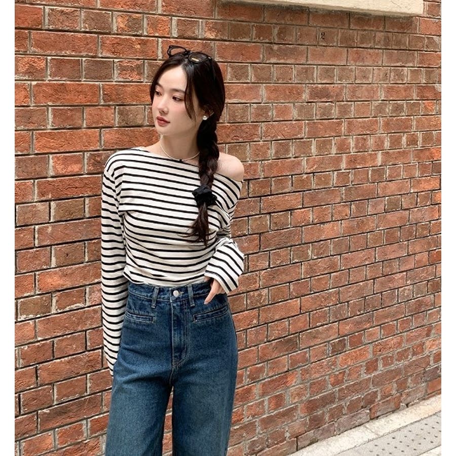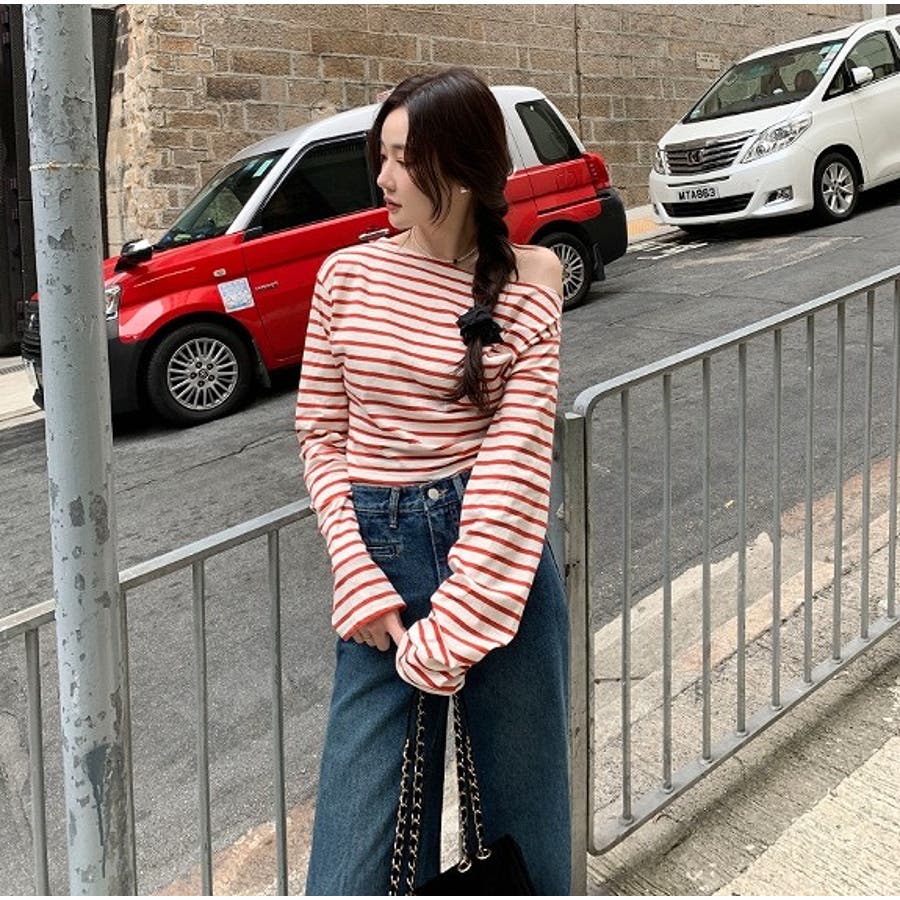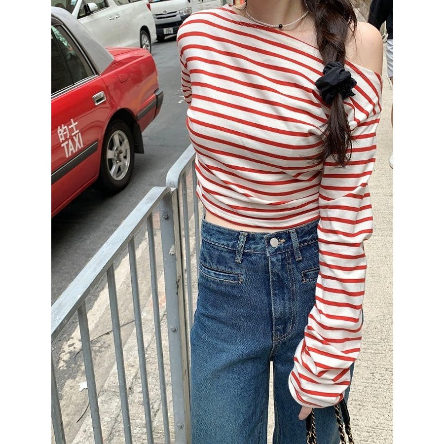 ボートネックオフショルボーダー配色トップス