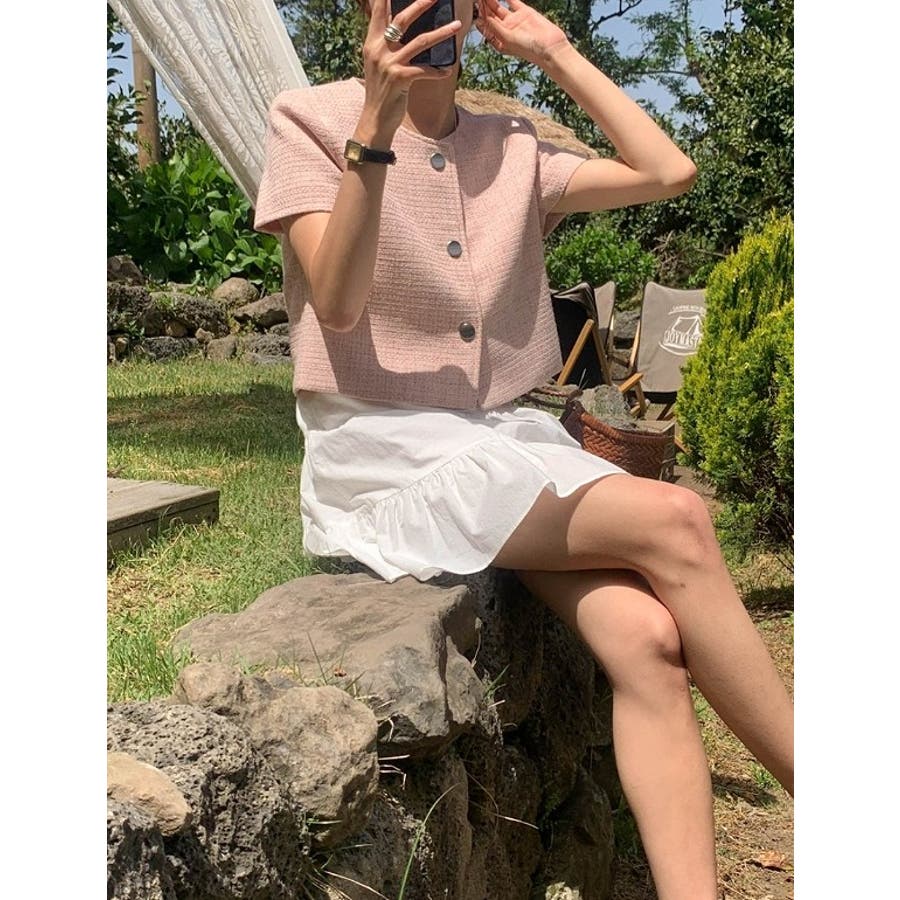 クルーネックシングルブレスト半袖ショットジャケット