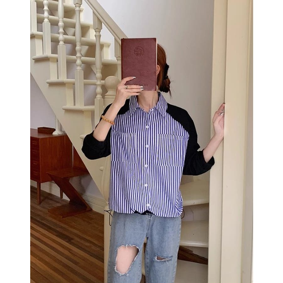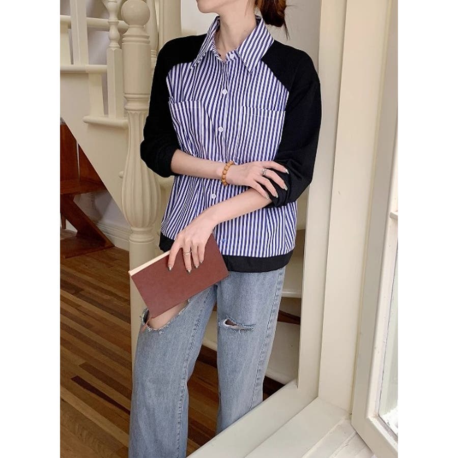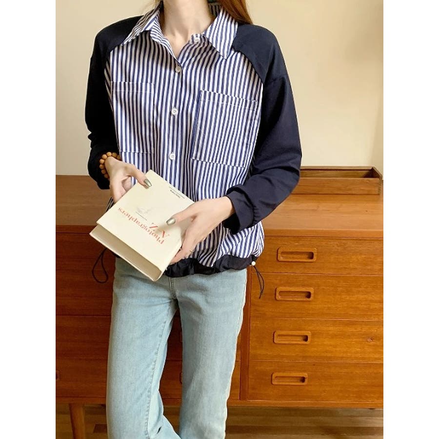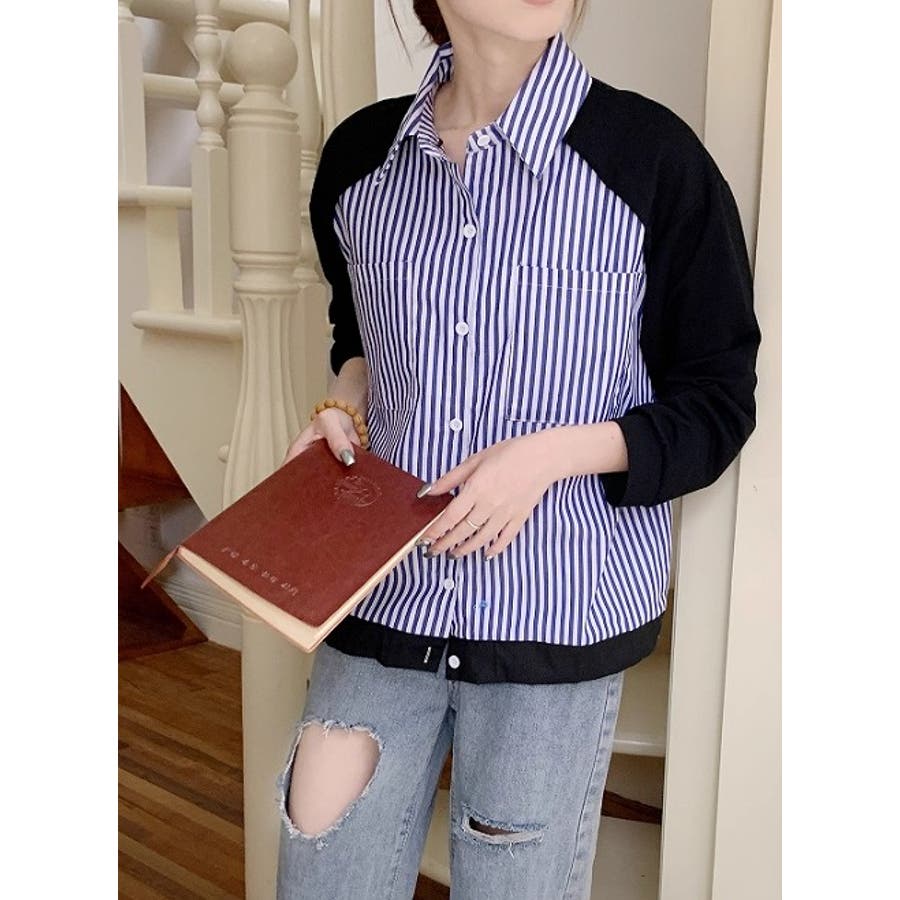 襟付きシングルブレストポケット付き配色ストライプシャツ