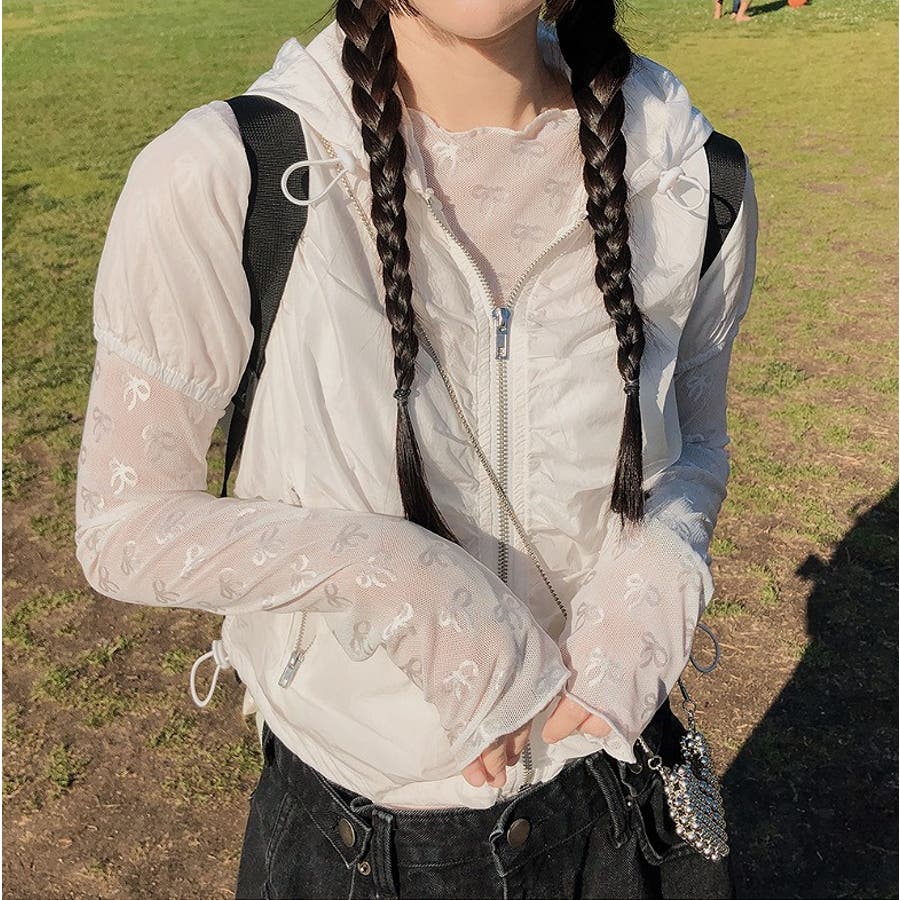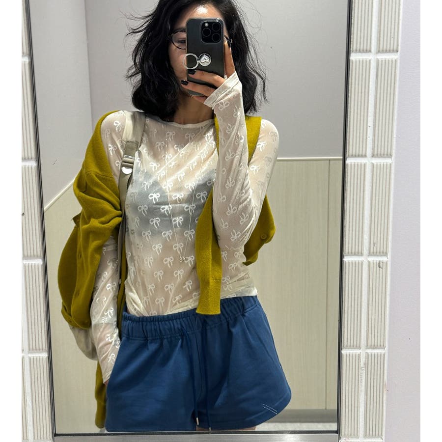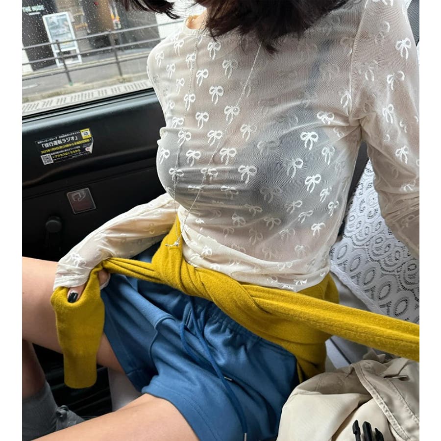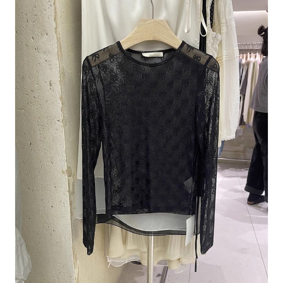 クルーネックリボンタイプリント無地チュールトップス