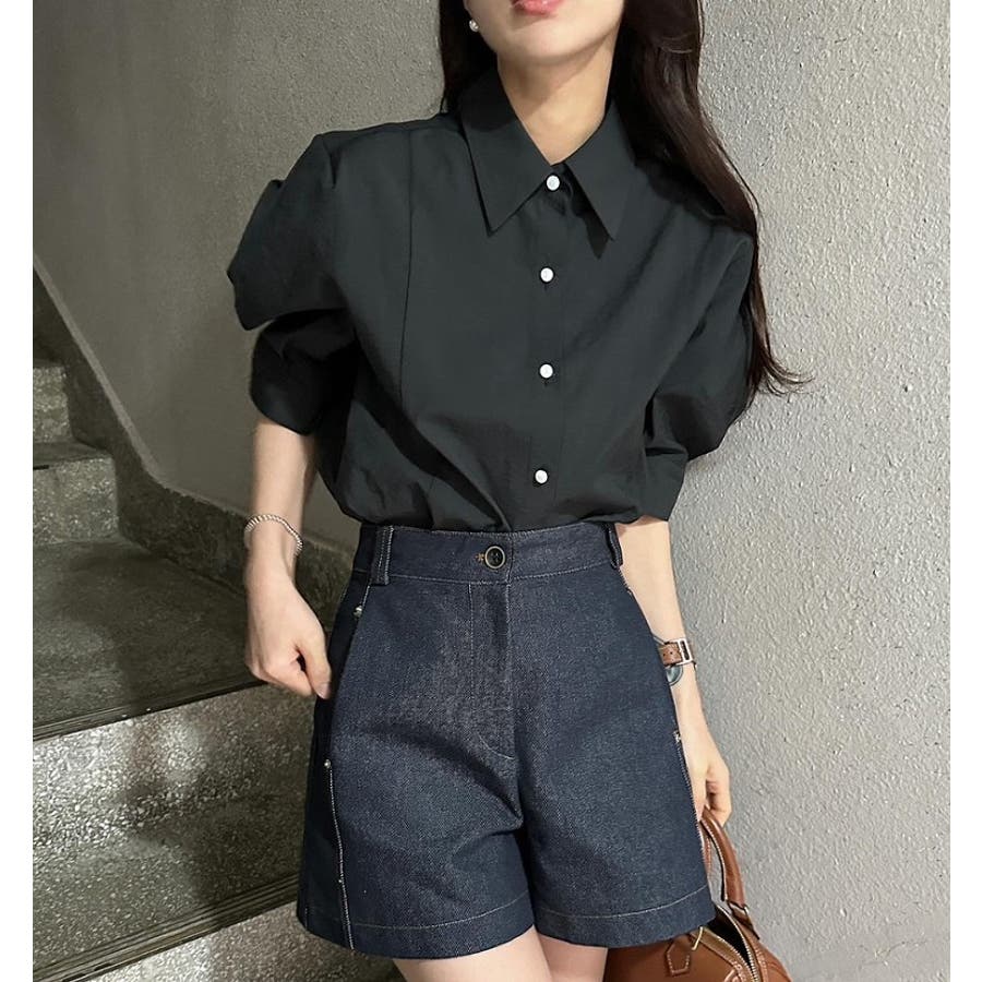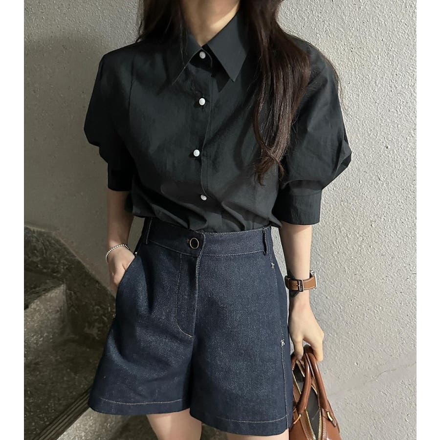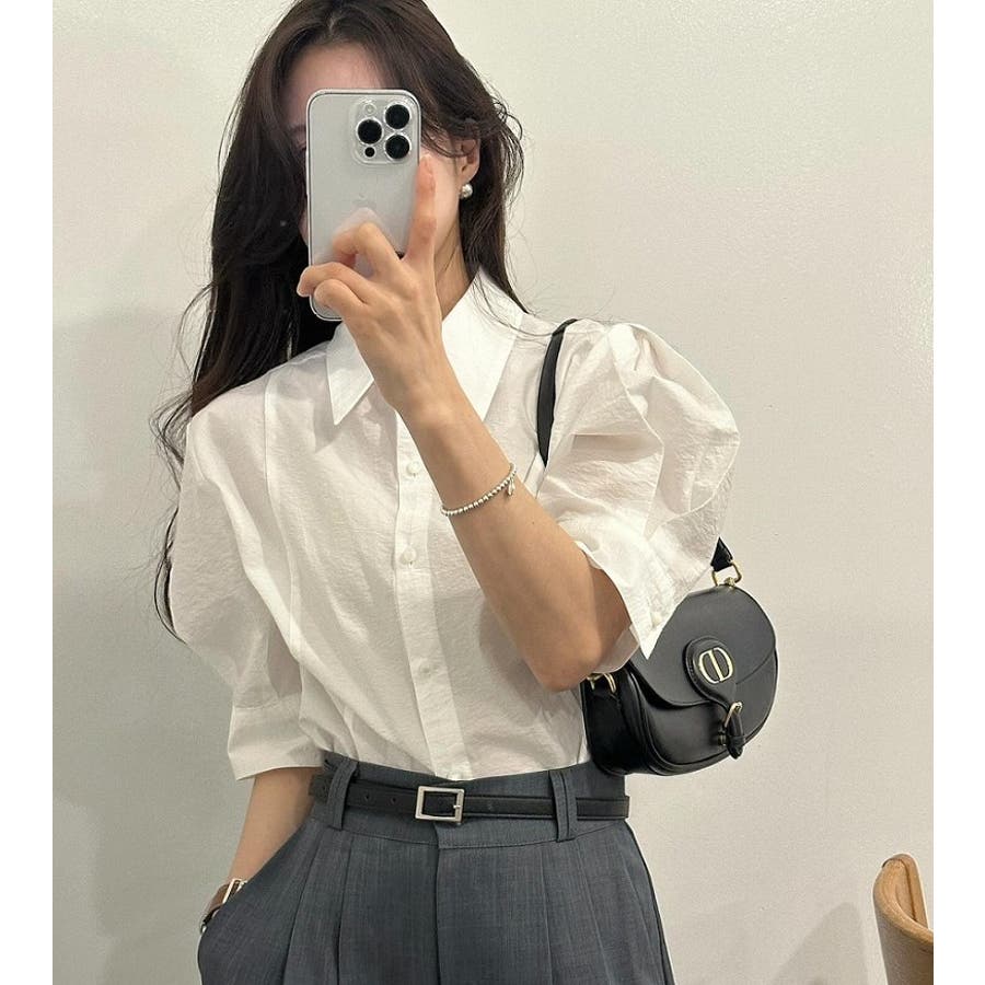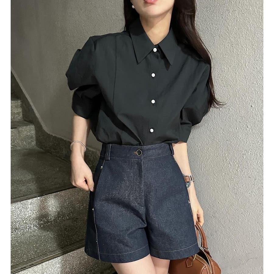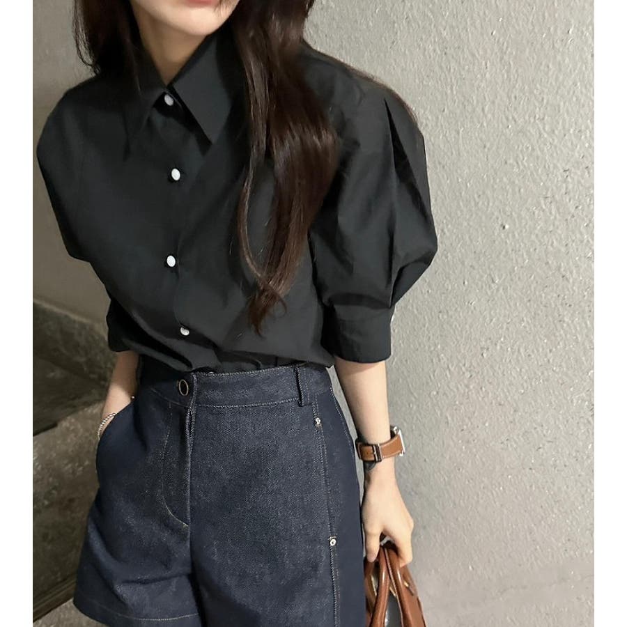 Vネック襟付きシングルブレストパフスリーブ無地シャツ