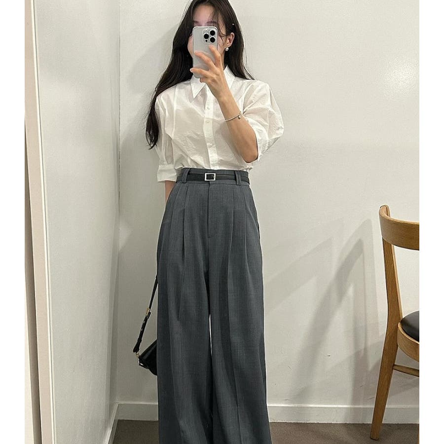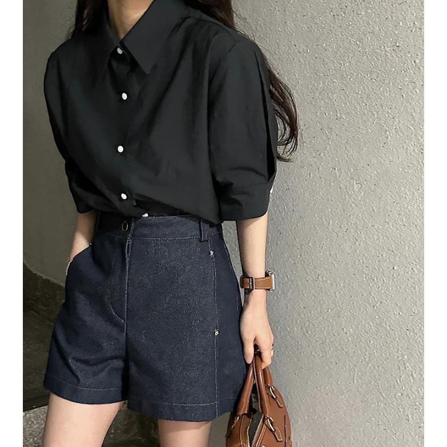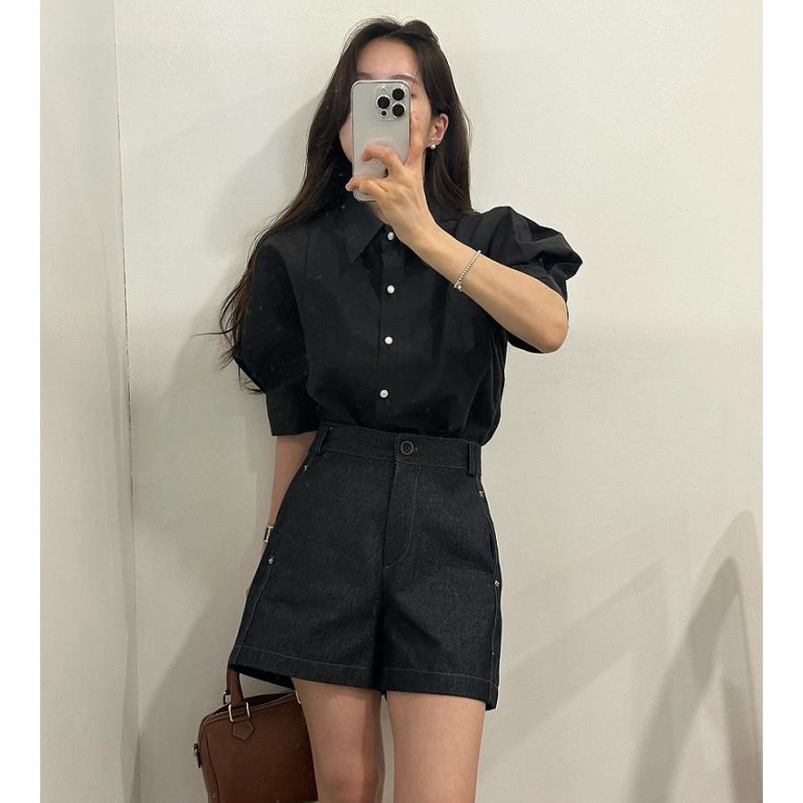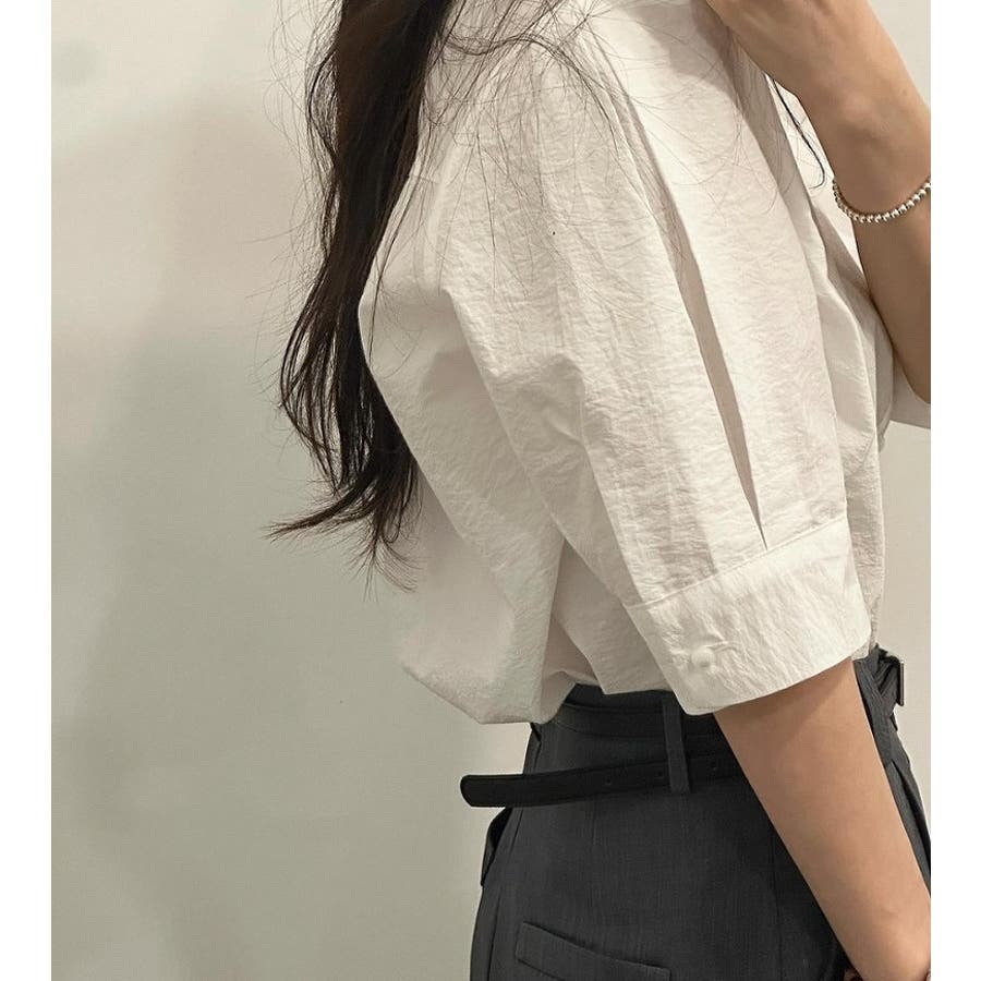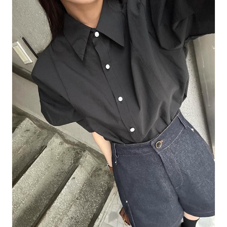 Vネック襟付きシングルブレストパフスリーブ無地シャツ