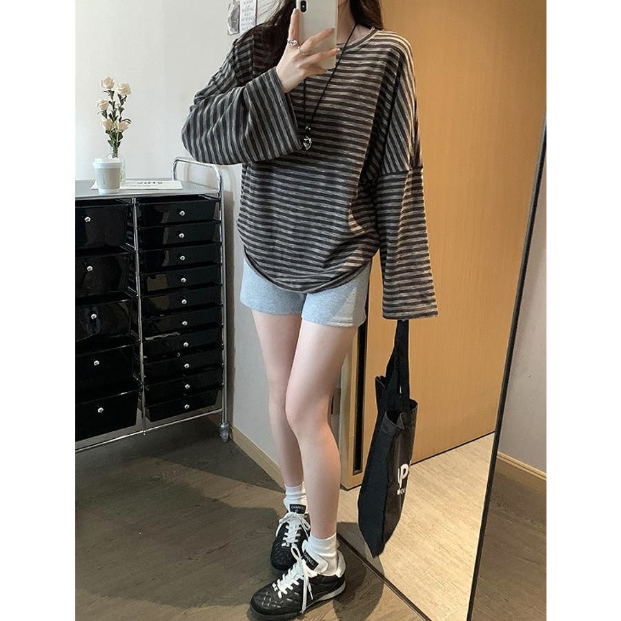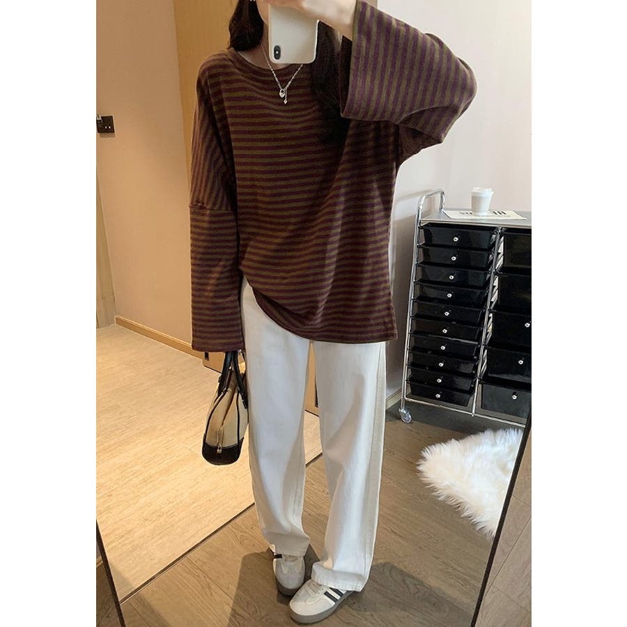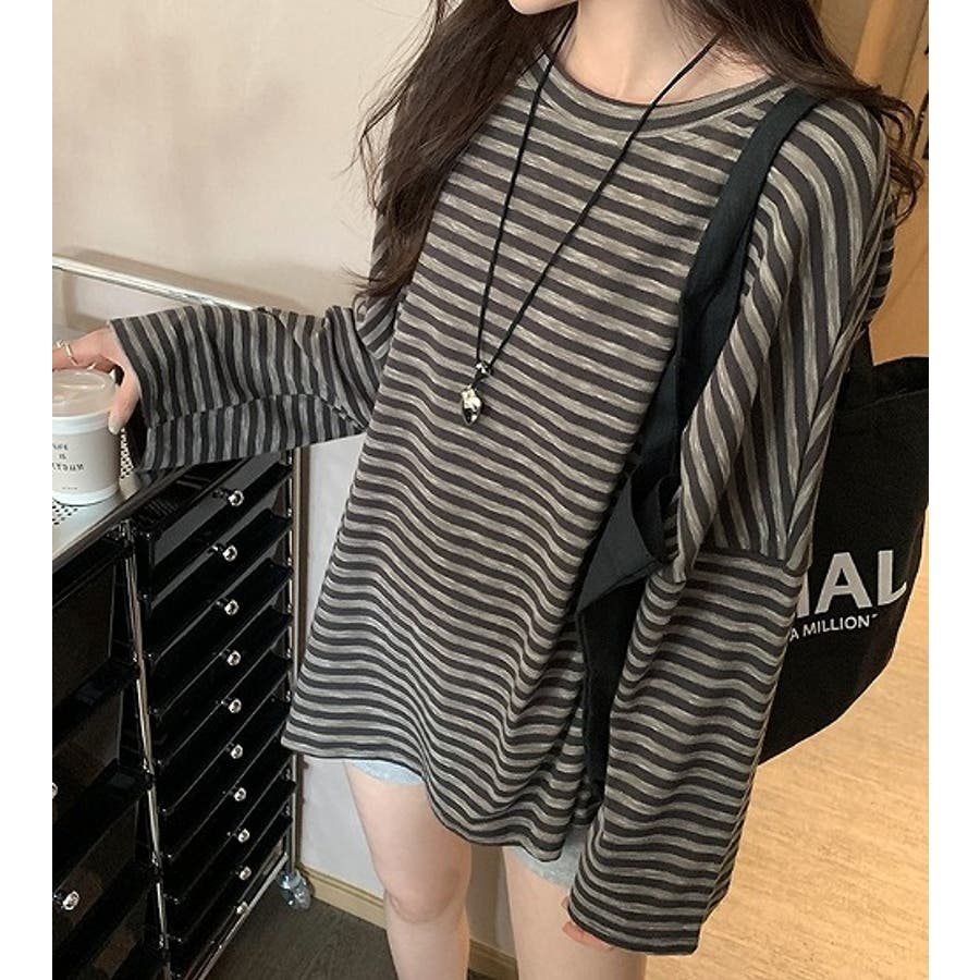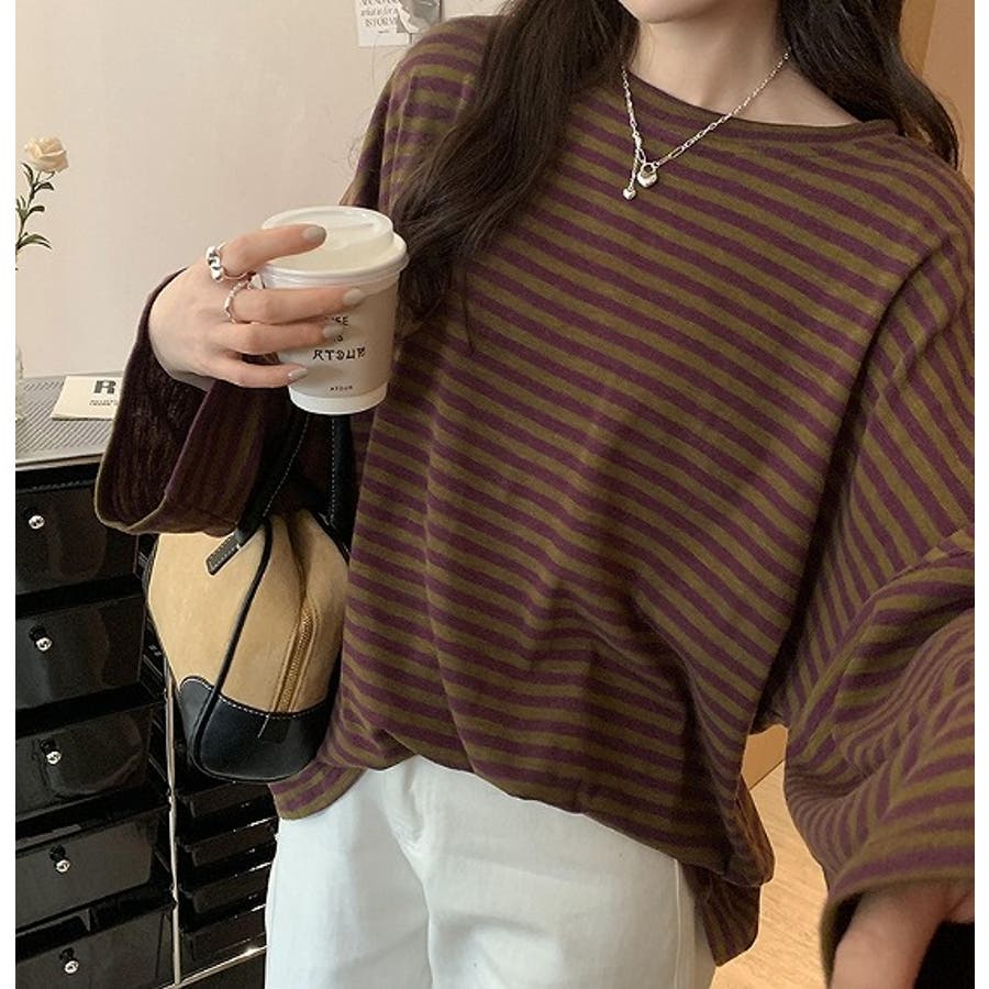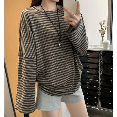 オーバーサイズクルーネックドロップドショルダースリーブボーダートップス