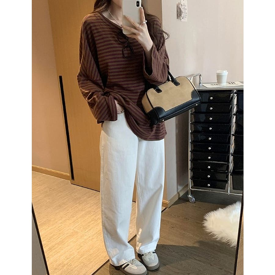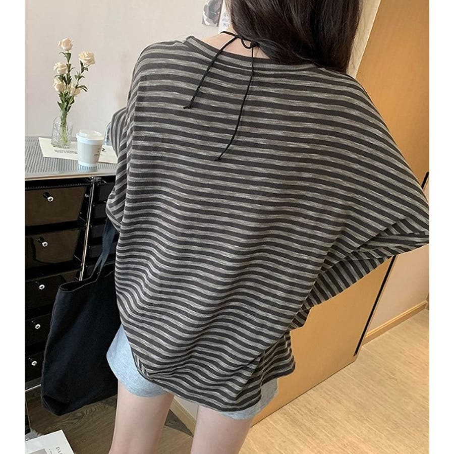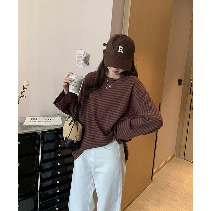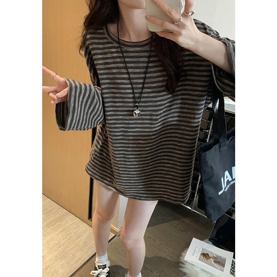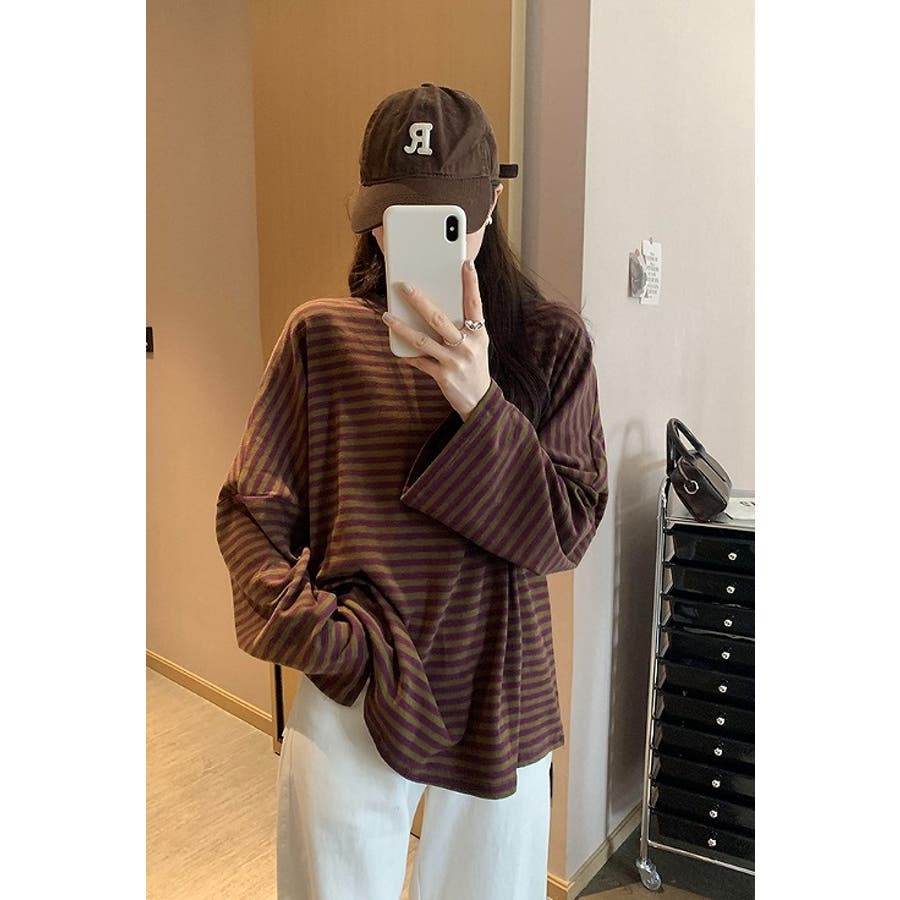 オーバーサイズクルーネックドロップドショルダースリーブボーダートップス