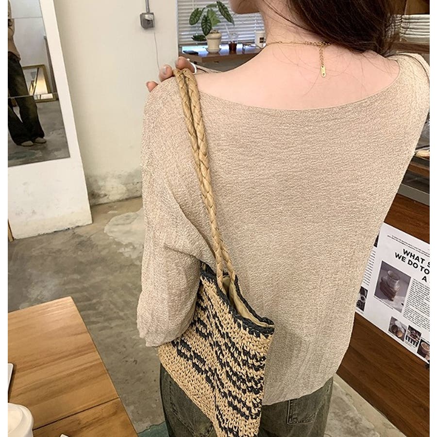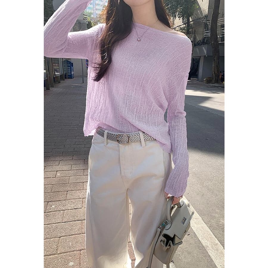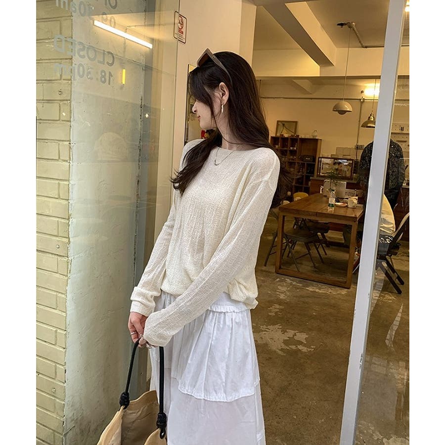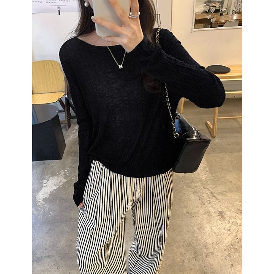 ボートネック長袖透ける無地トップス