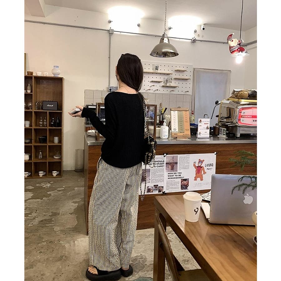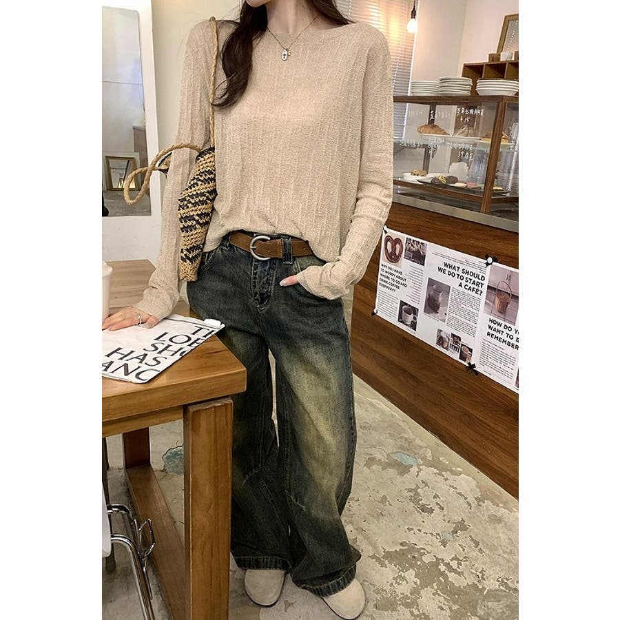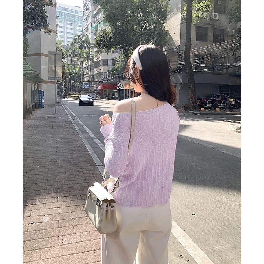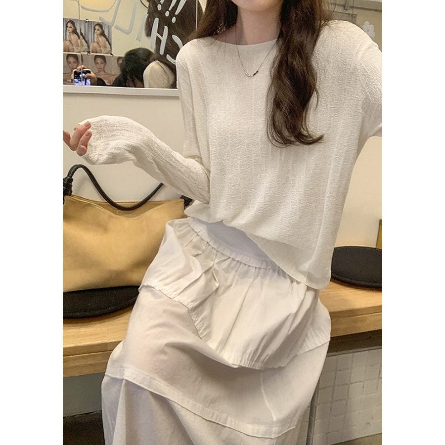 ボートネック長袖透ける無地トップス