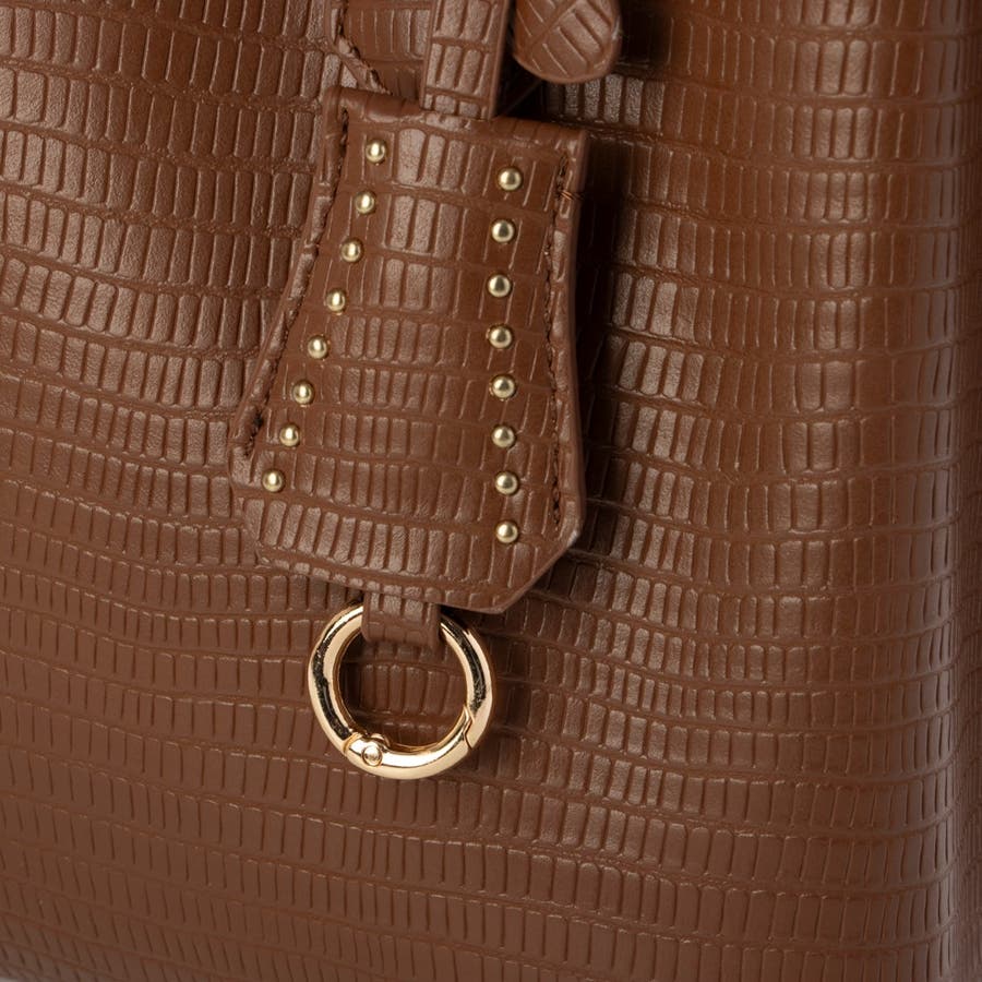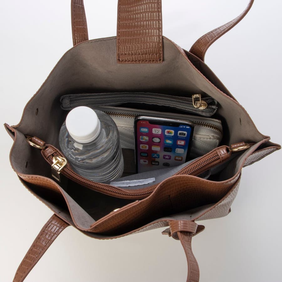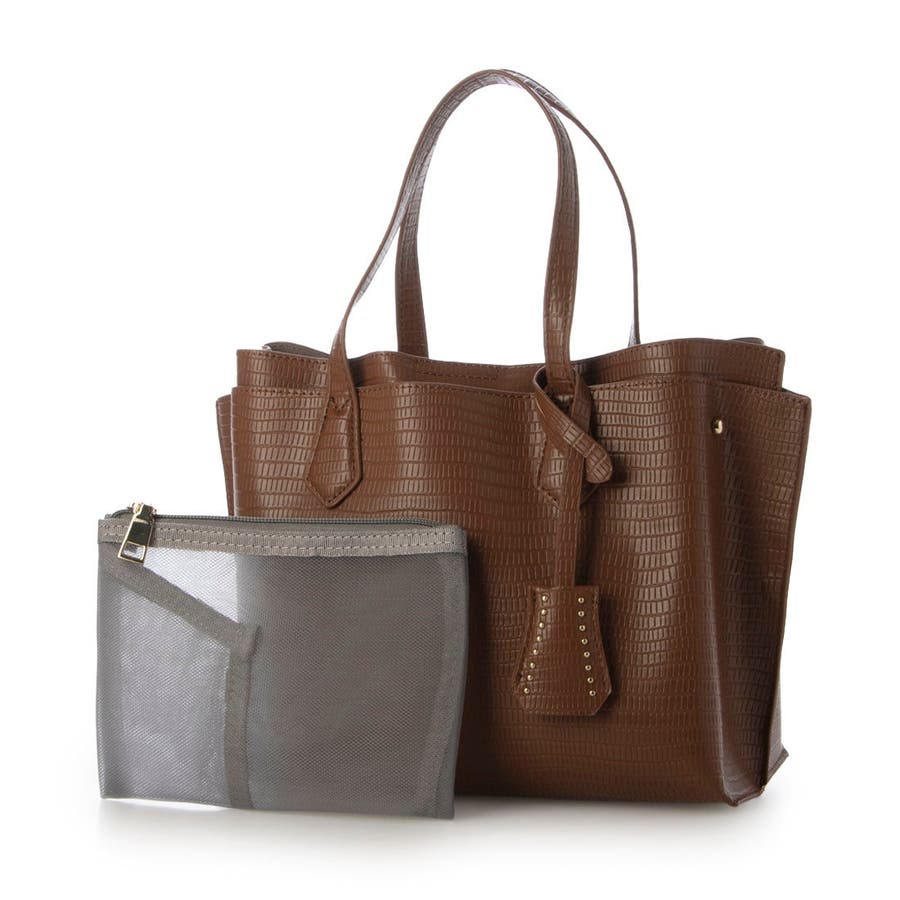 ベーシックで長く使っていただけるデザインのトートバッグ。小さなカシメ付きのキーチャームがポイントになっています。中はファスナー付き仕切りポケットで仕切られ、物が迷子にならないつくり。付属のメッシュポーチや前後にあるあおりポケットも便利です。