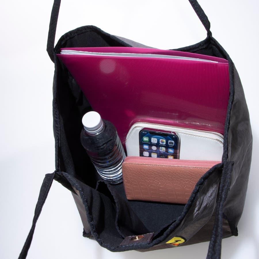 長財布、500mlボトル、お弁当やポーチなどいつものお出かけに必要なものがしっかり入るサイズ感。肩入れもできます。