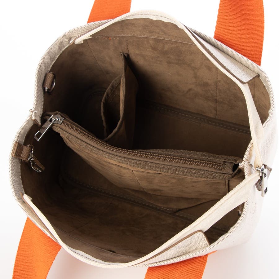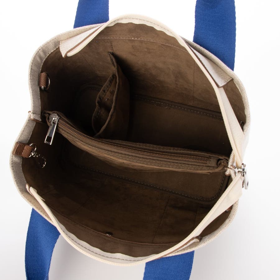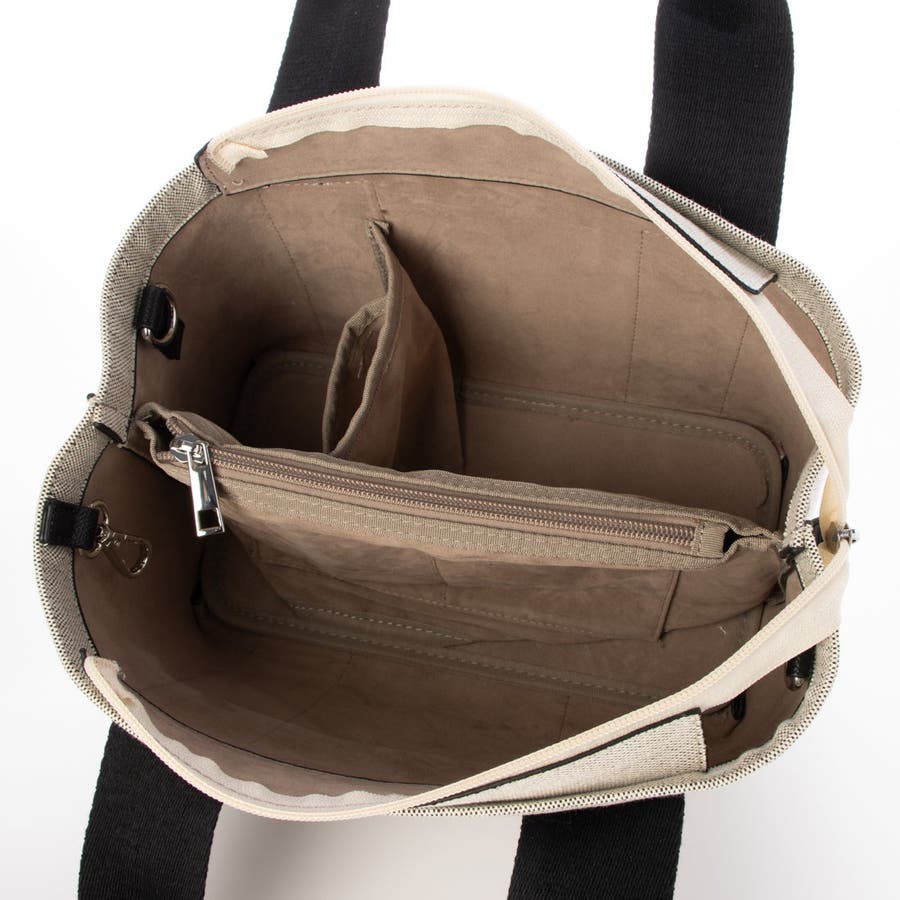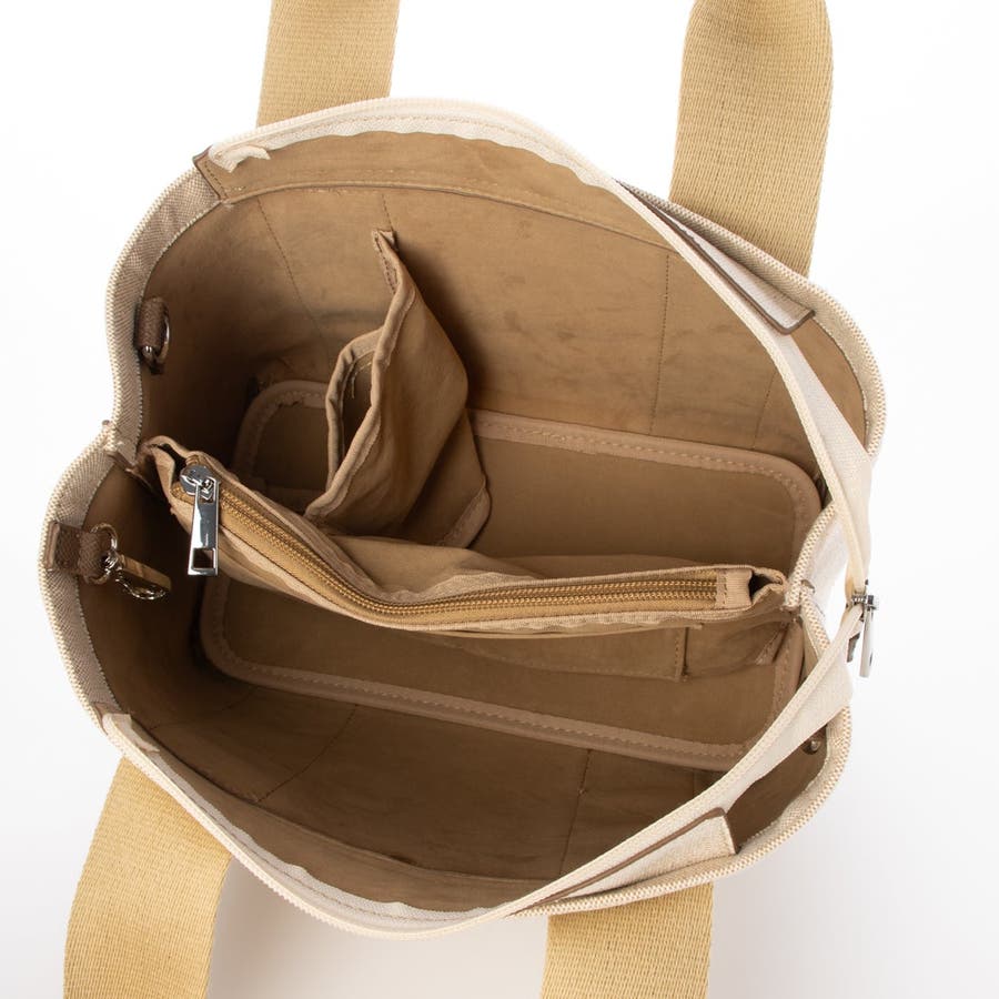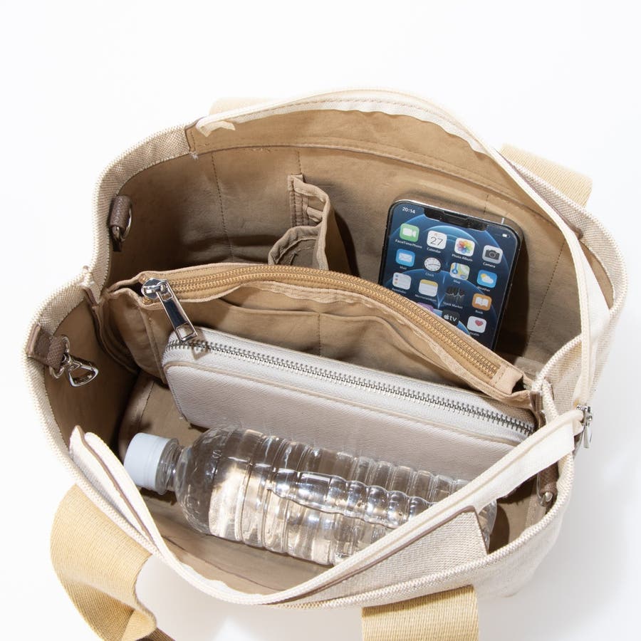 口元がファスナー仕様、斜め掛けもできるショルダー付きでとても使いやすいトートバッグです。