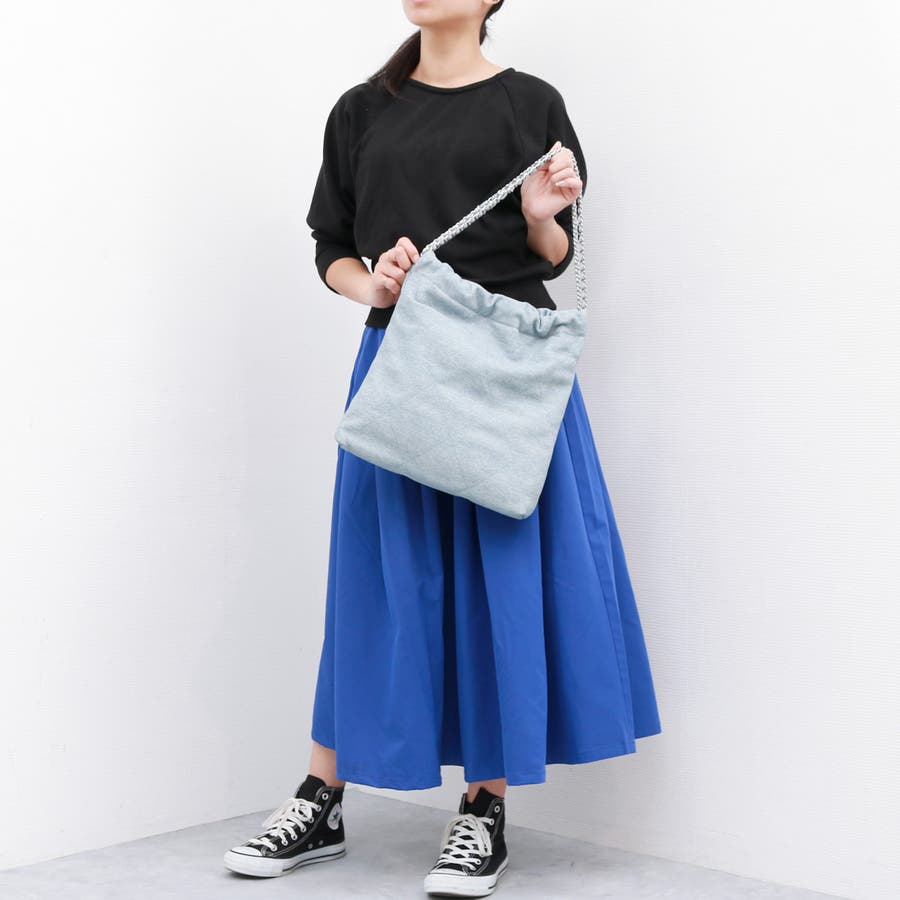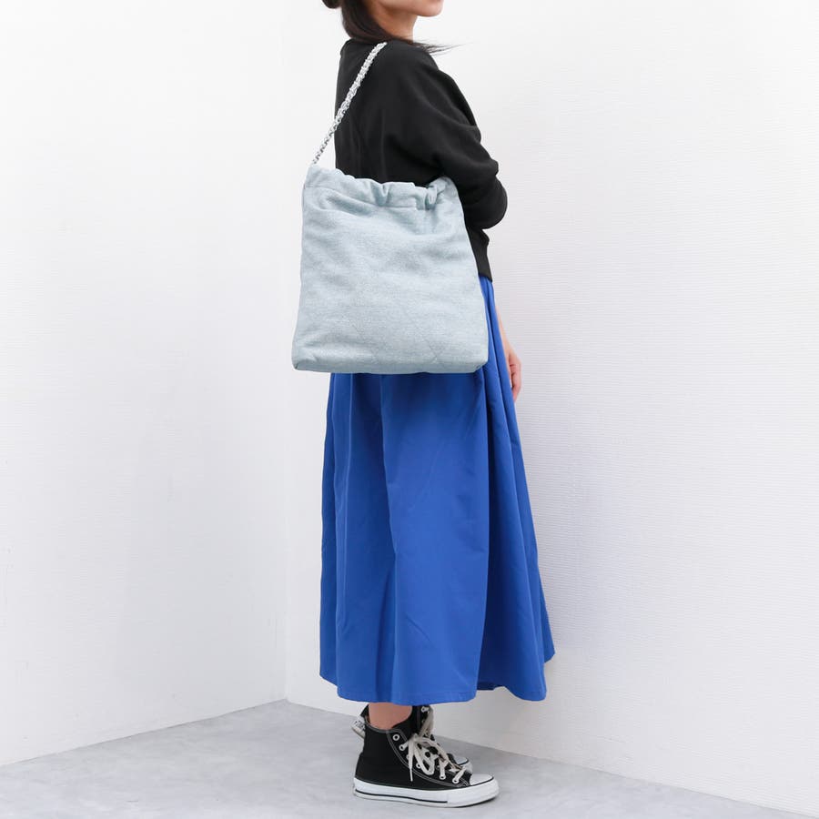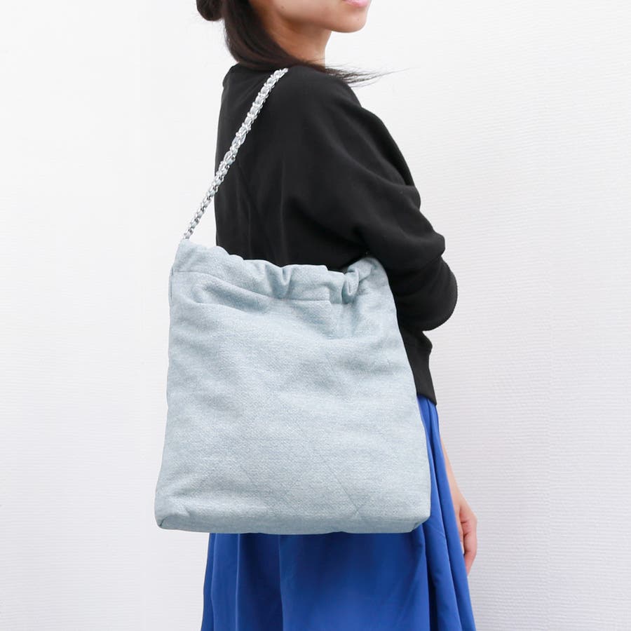 口元にキュっと寄せたギャザーが女性らしいデニムバッグ。