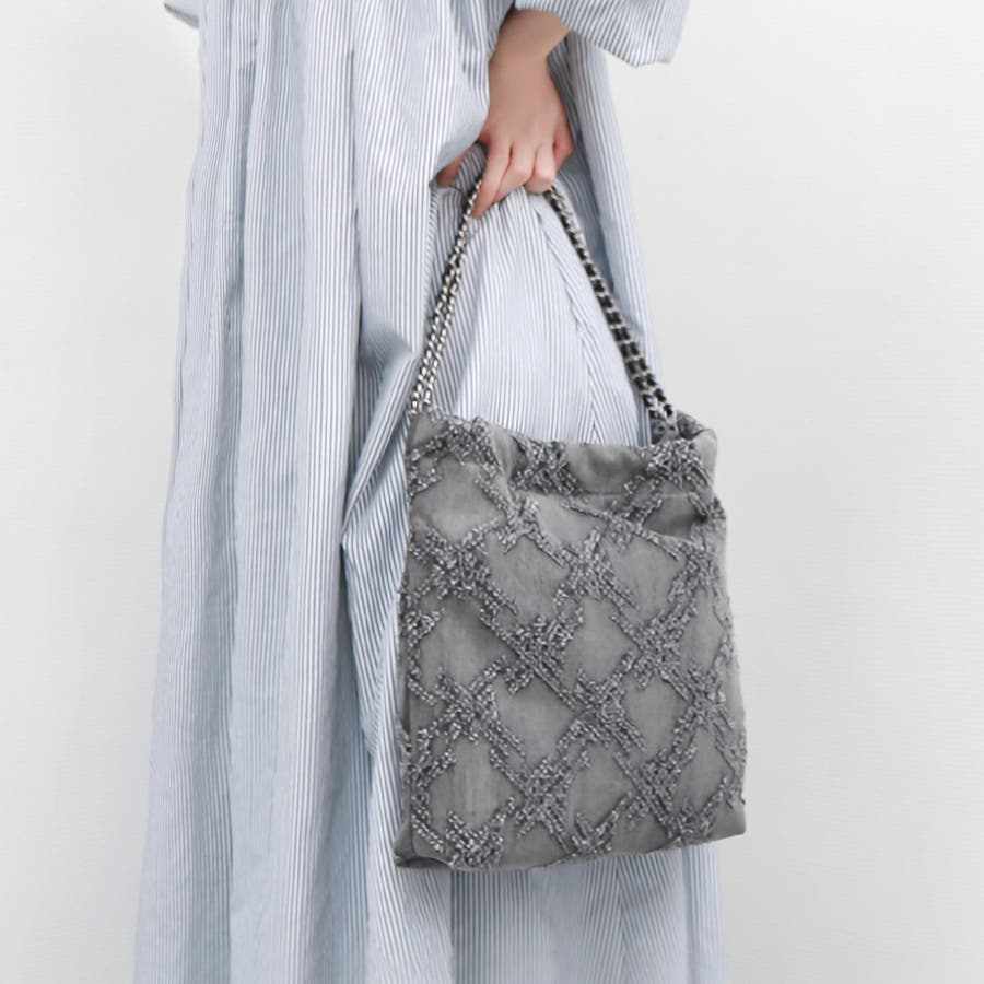 チェーンの間に生地や合皮を通したハンドルは大人っぽさを演出するデザインです。