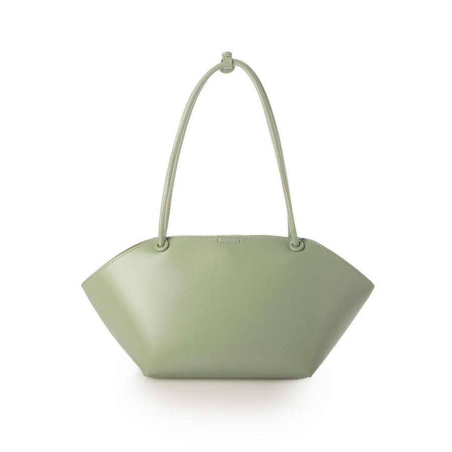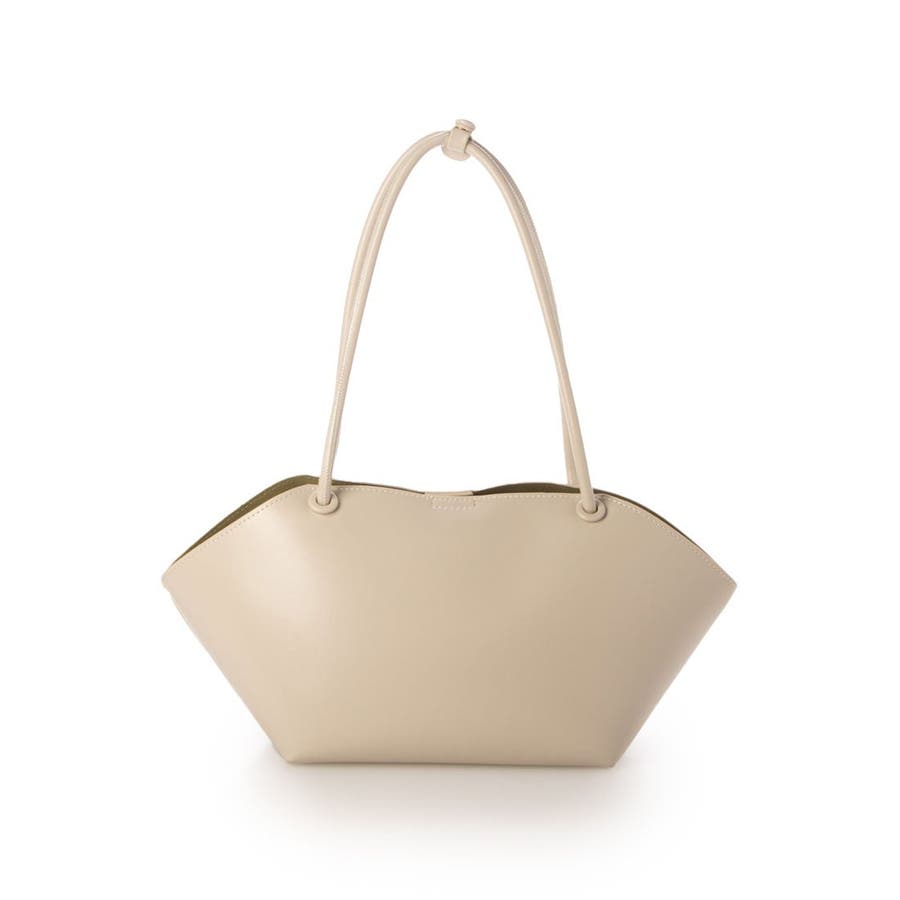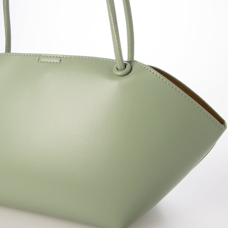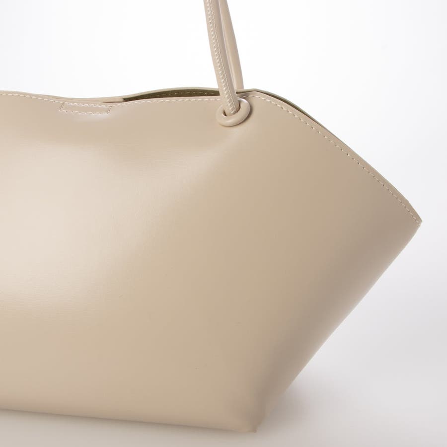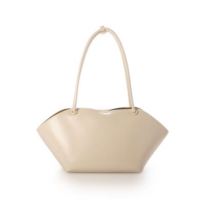 横長型のユニークな形でありながら細目のハンドルとツルっとした表面の素材がシックな印象のトートバッグ。