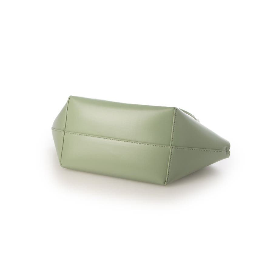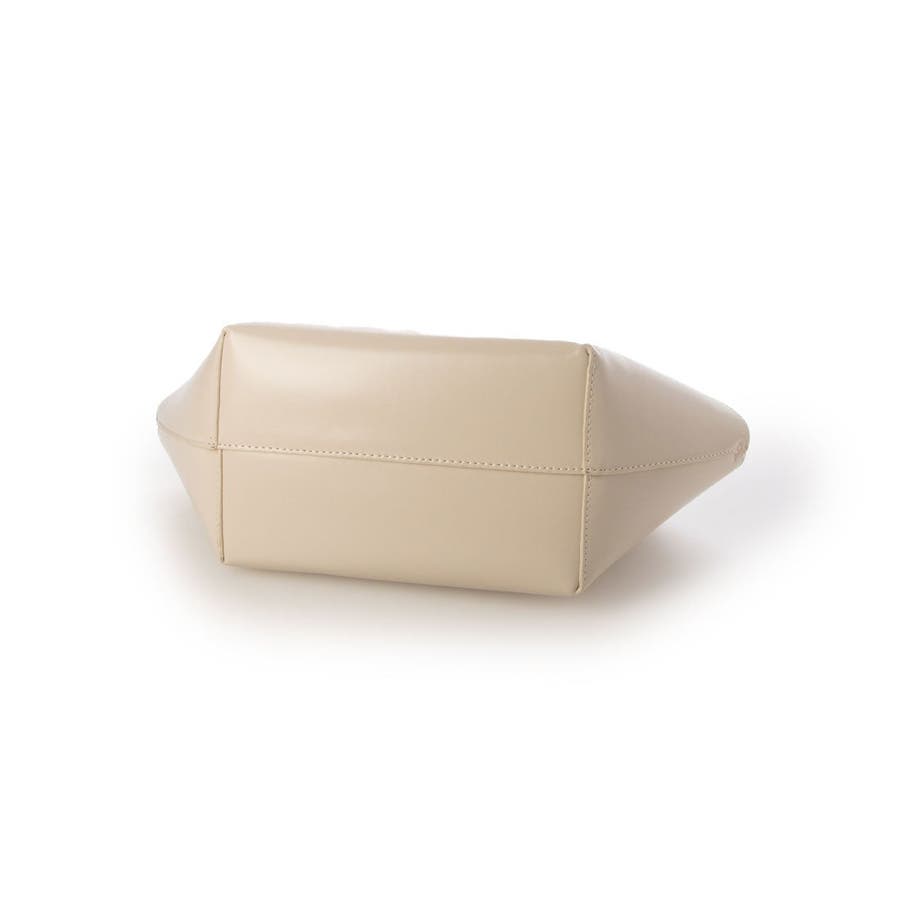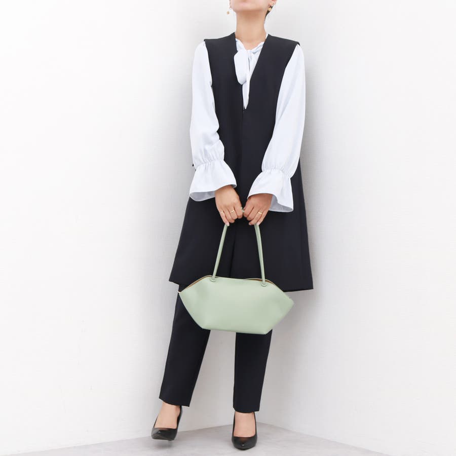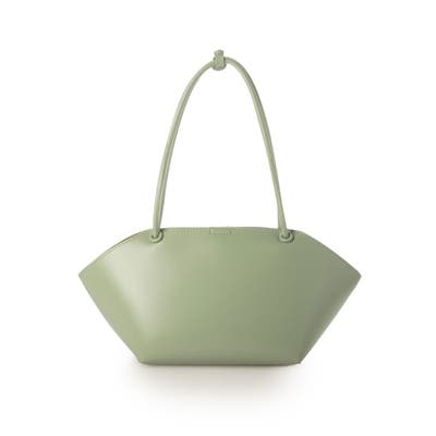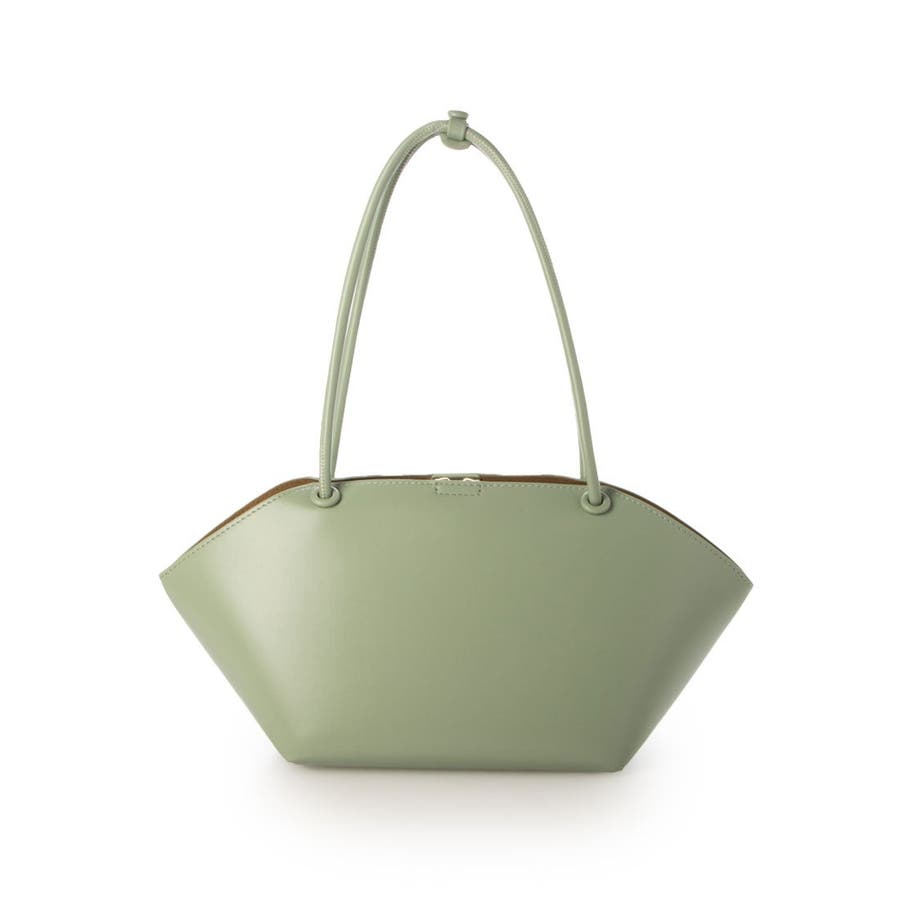 横長型のユニークな形でありながら細目のハンドルとツルっとした表面の素材がシックな印象のトートバッグ。