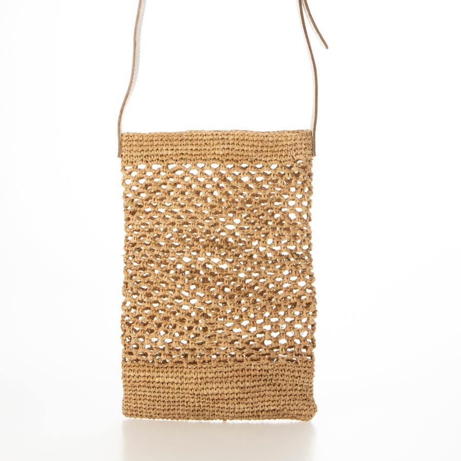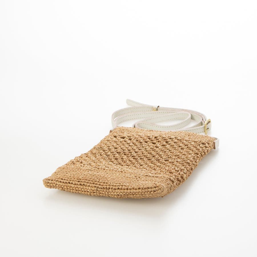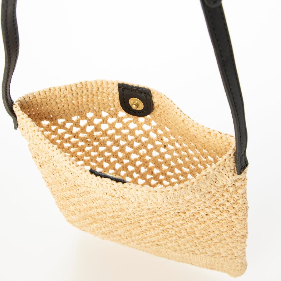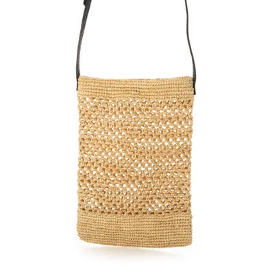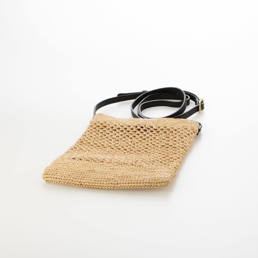 マダガスカルで編み上げた涼し気なラフィアのボディに姫路の牛革をを日本で取り付けたミニショルダーバッグ。