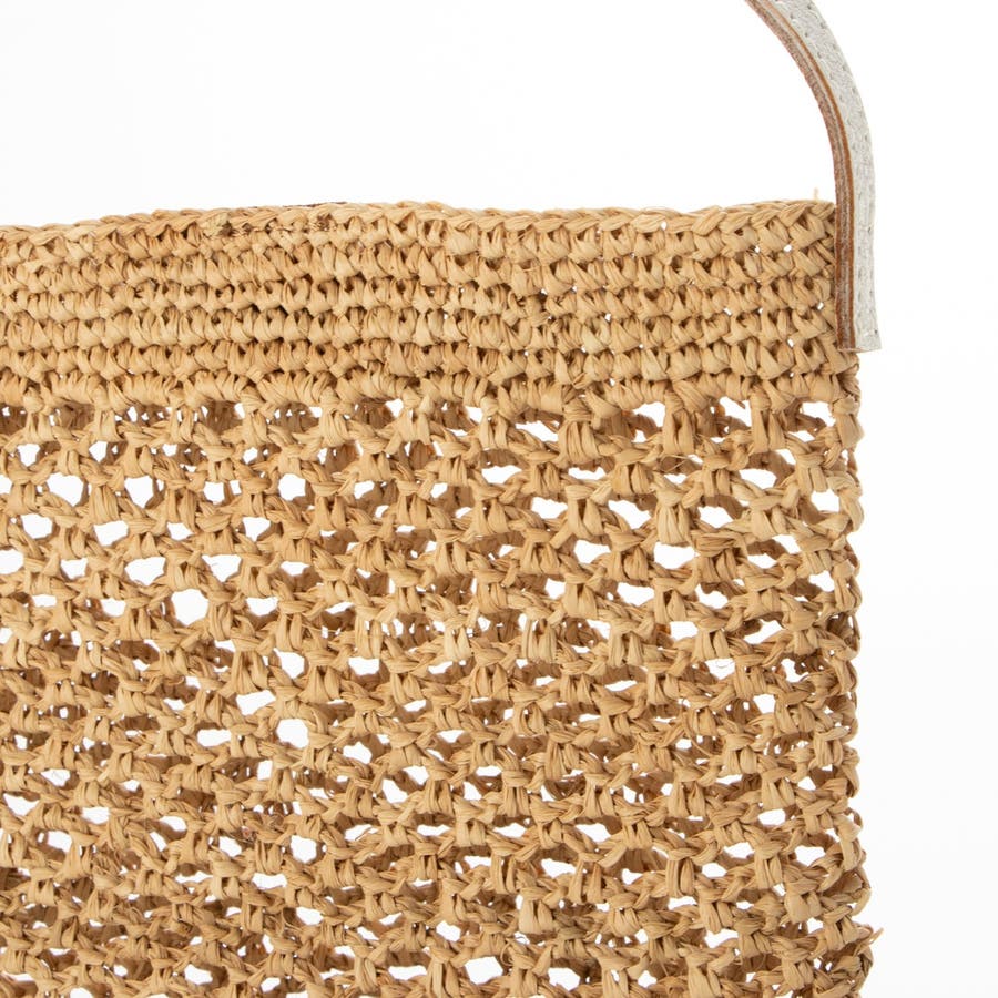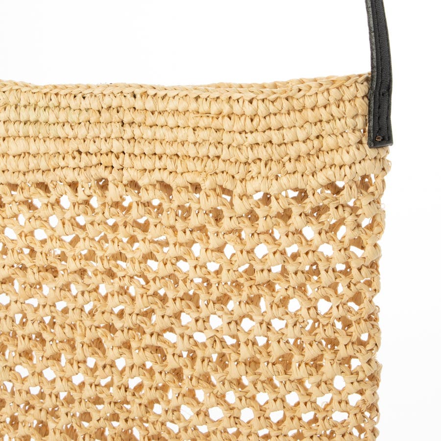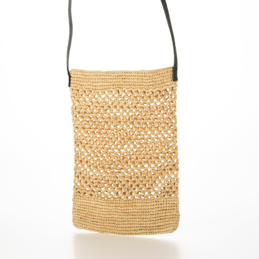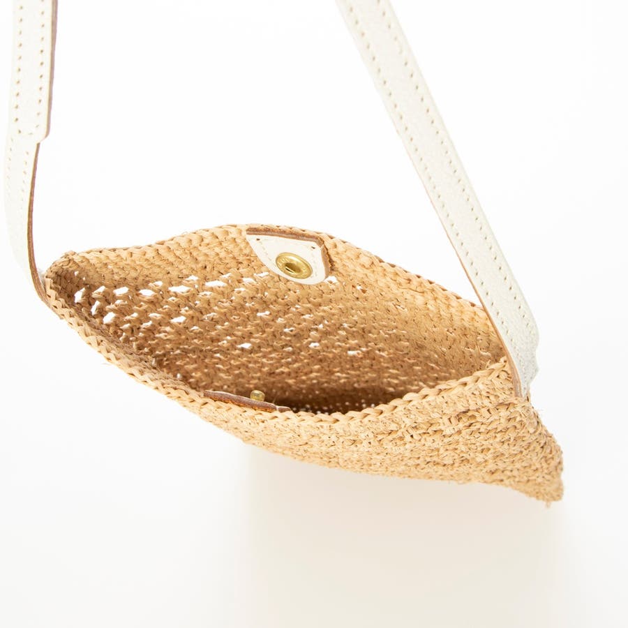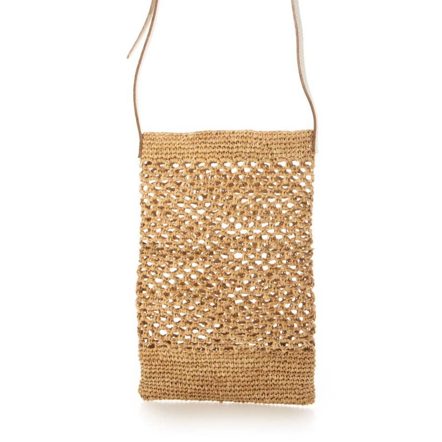 マダガスカルで編み上げた涼し気なラフィアのボディに姫路の牛革をを日本で取り付けたミニショルダーバッグ。