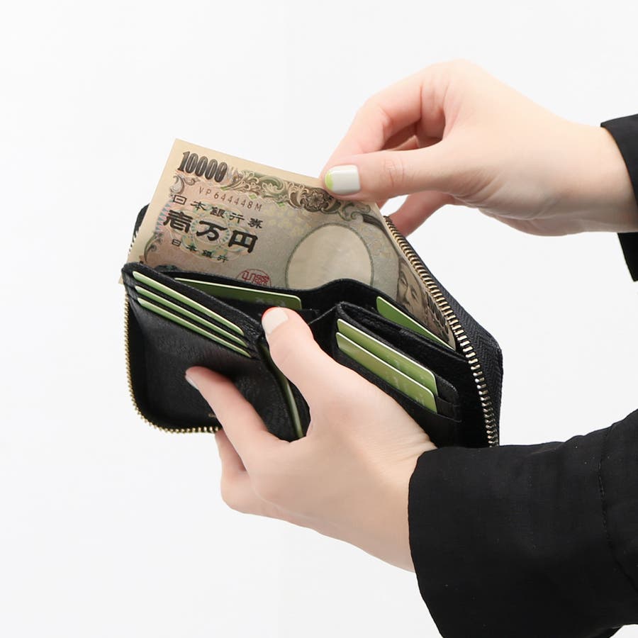 大きく開く小銭入れ、サイドからも取り出せる札入れ、7か所のカード入れと容量がたっぷりながら手のひらになじむサイズ感が◎
