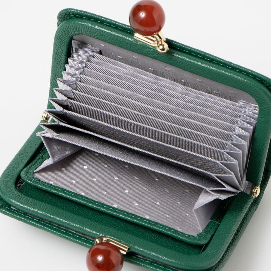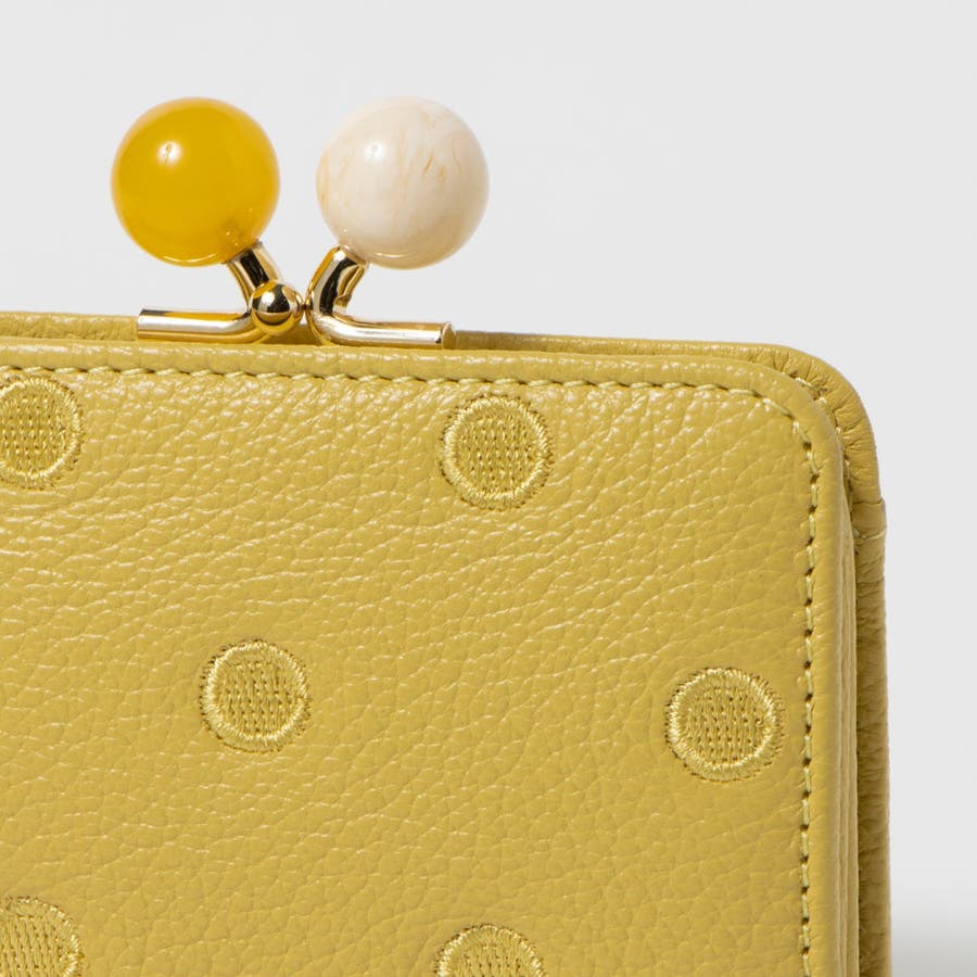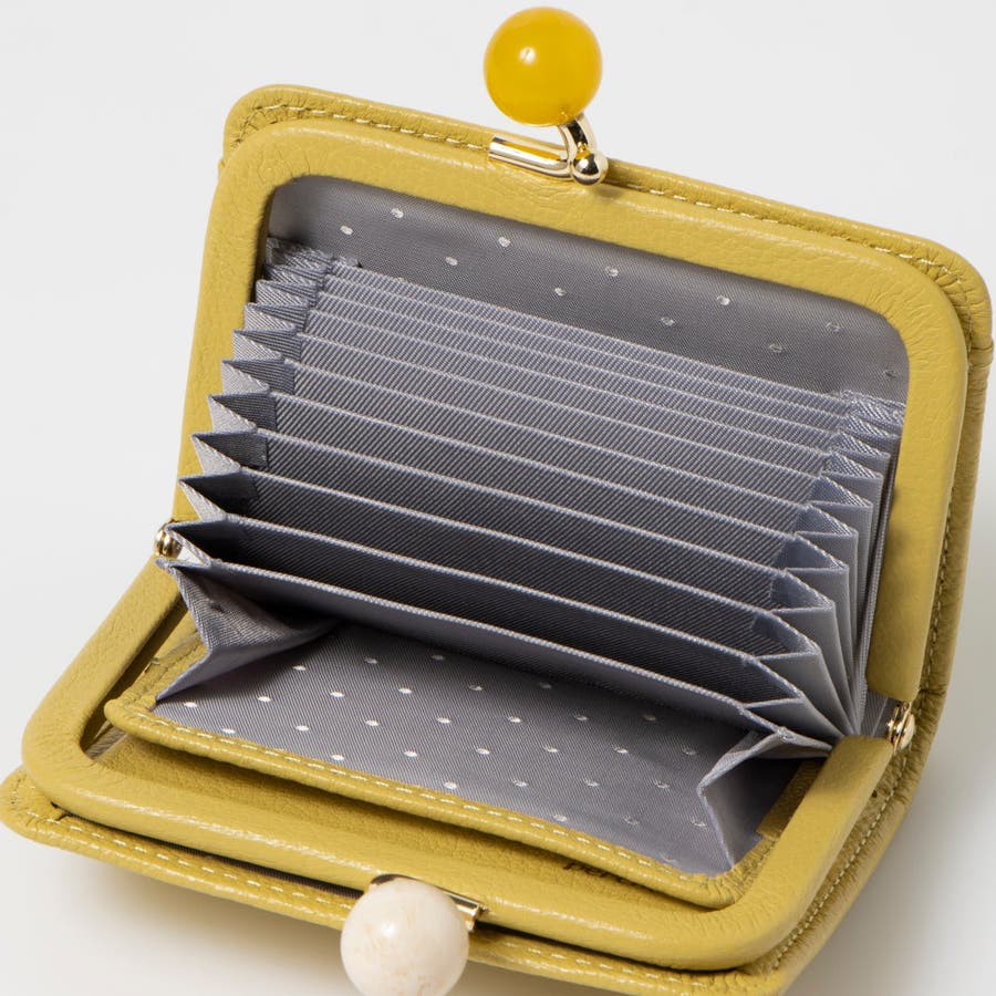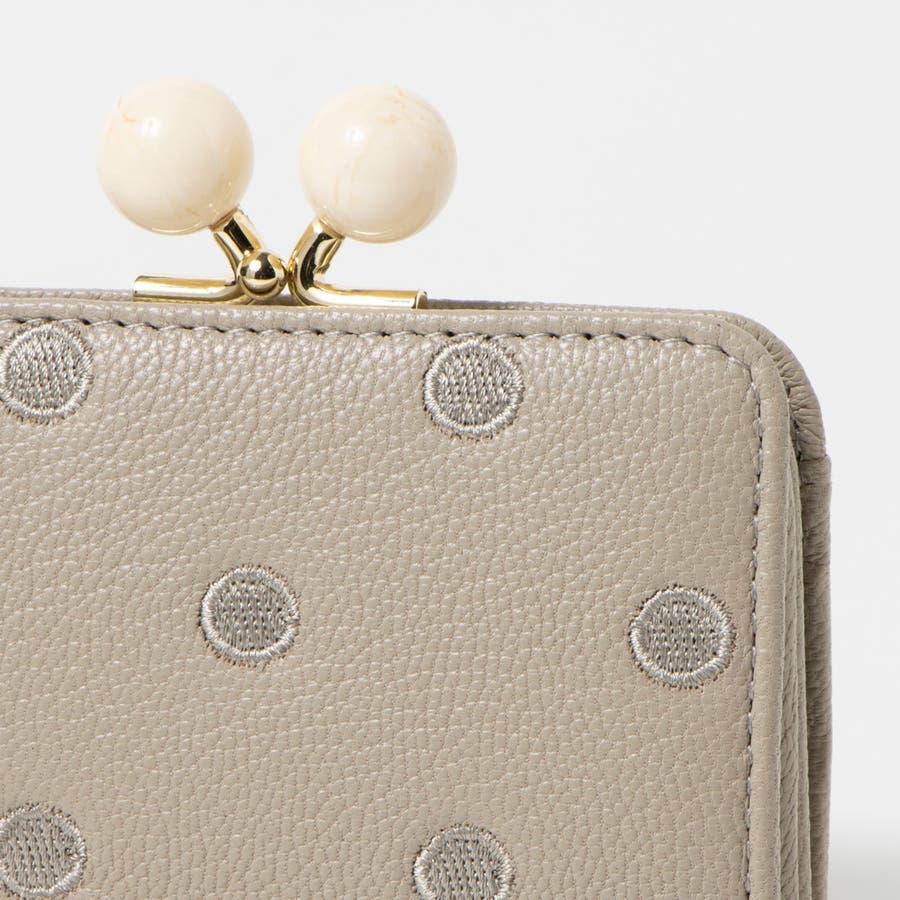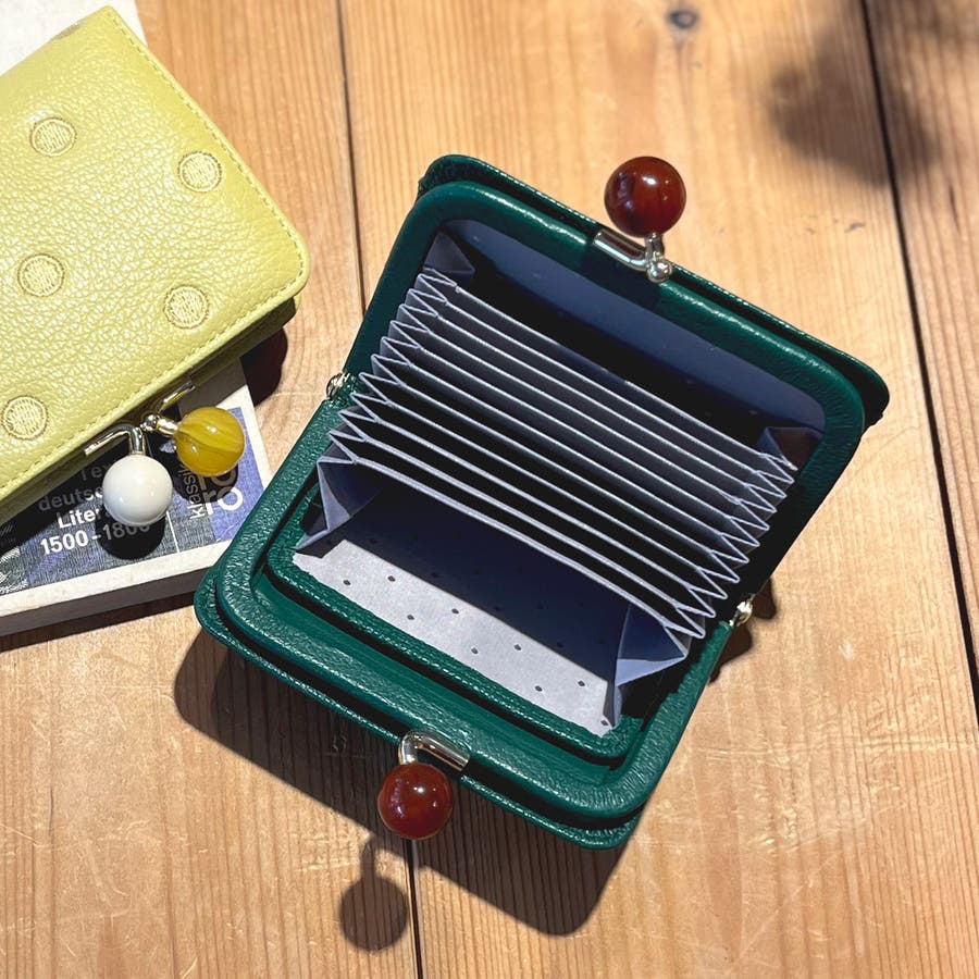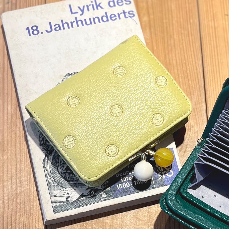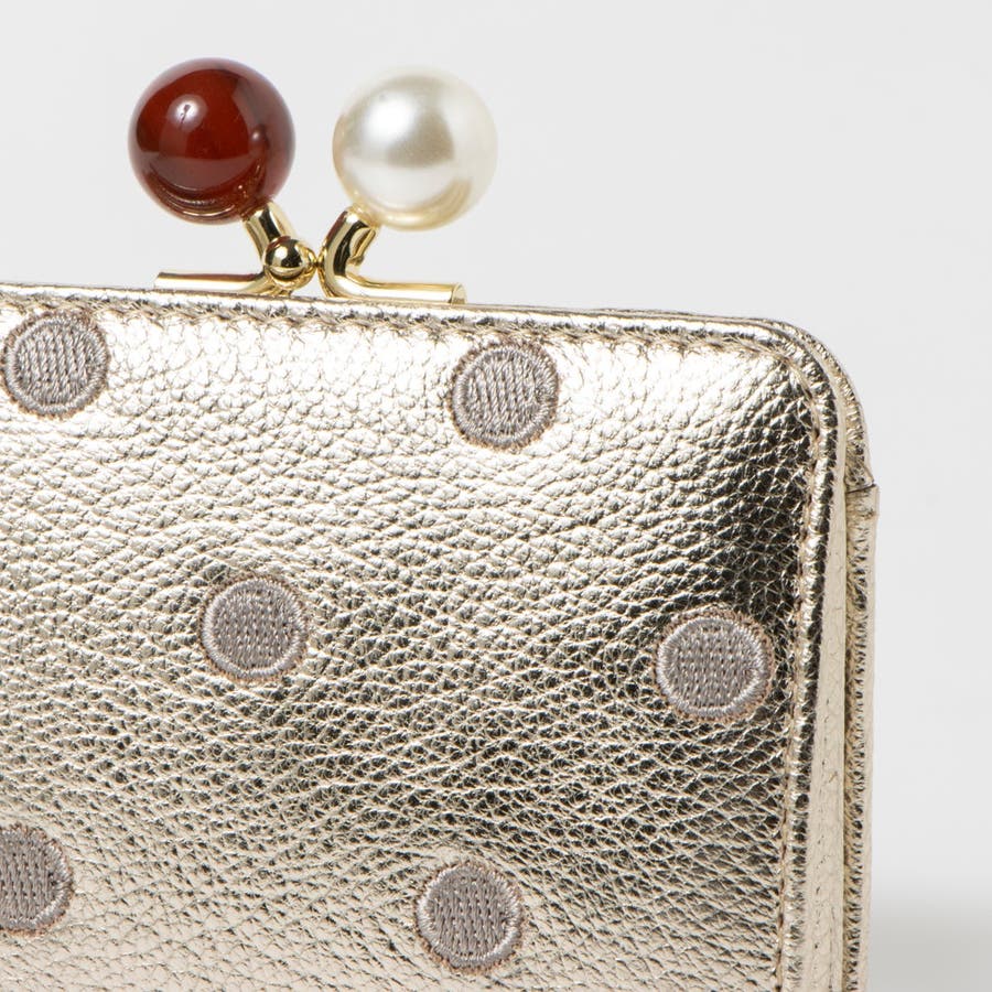 アクリル玉の付いたガマ口とドット刺繍がかわいいジャバラカードウォレット