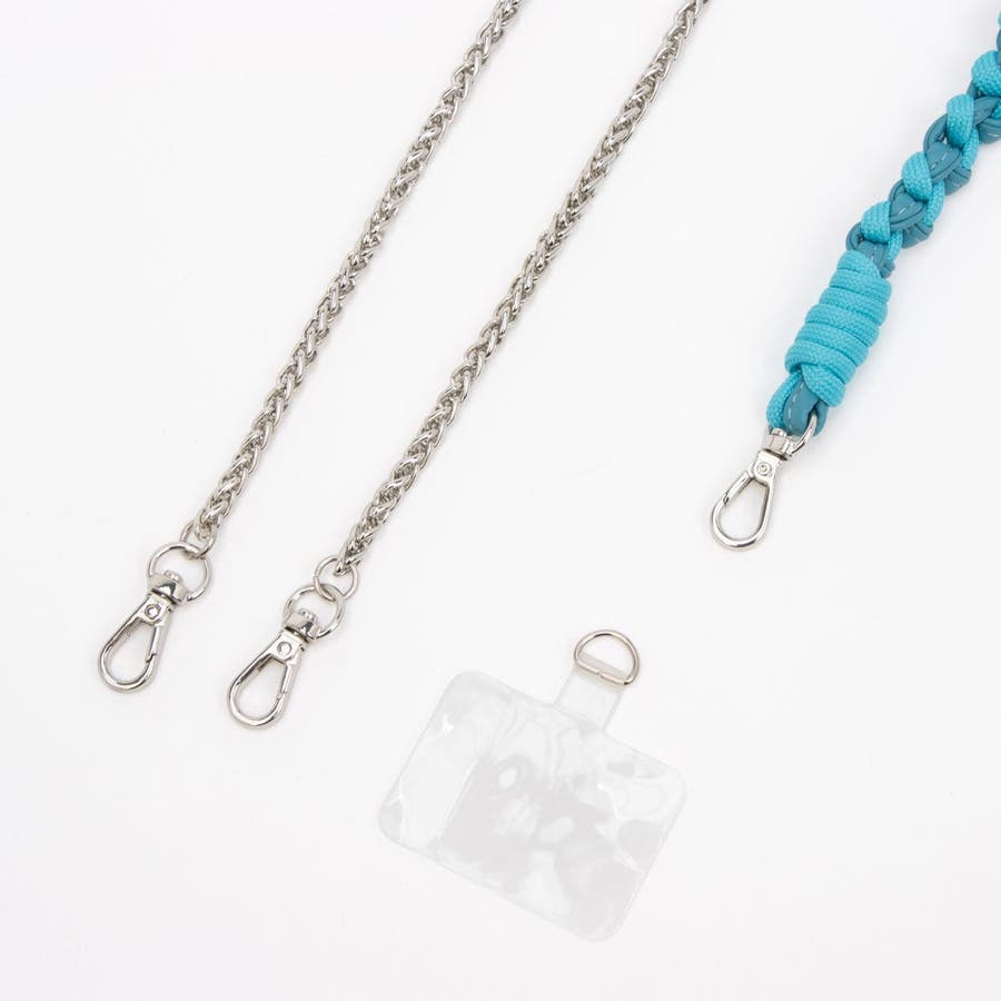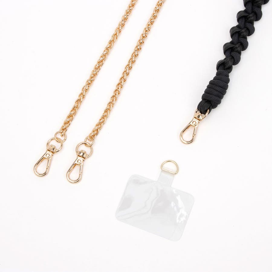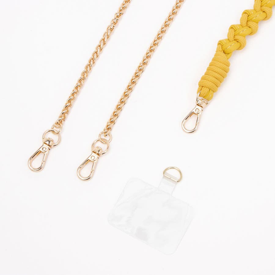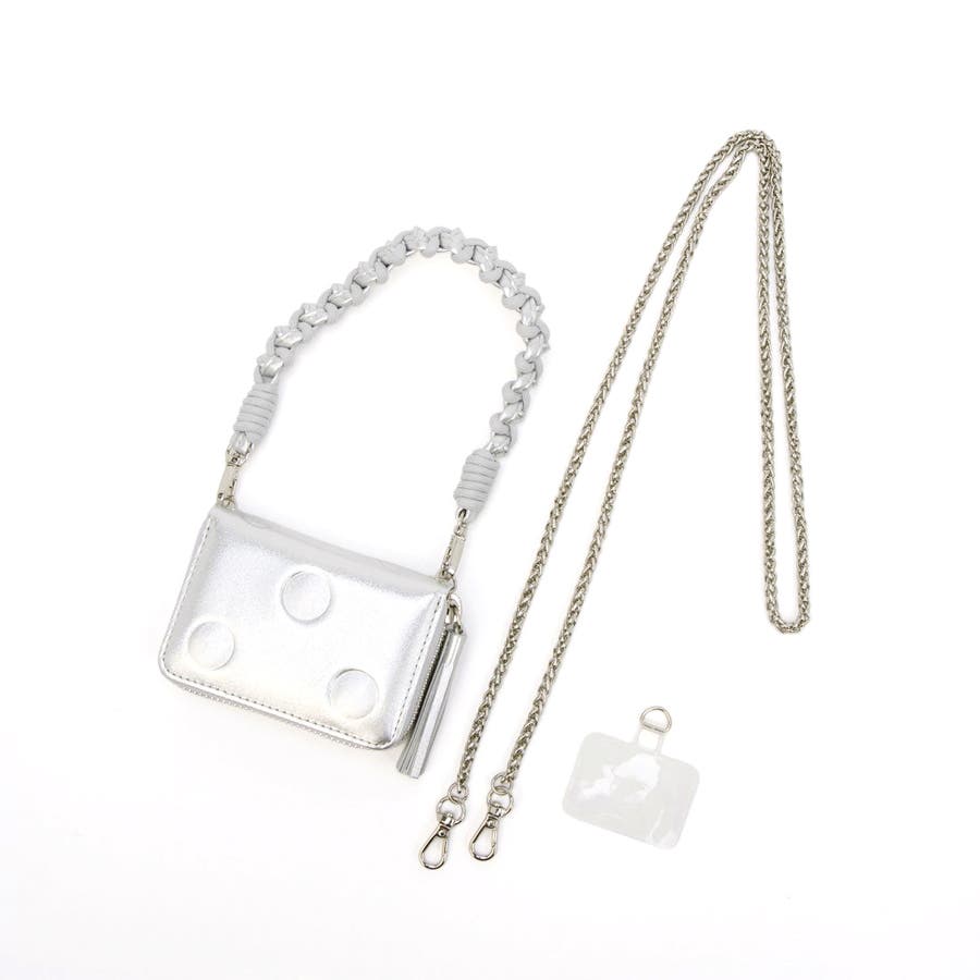 ハンドストラップやチェーンショルダー、スマホ取り付け用シートなどが付いていて組み合わせでマルチに使えるお財布です。