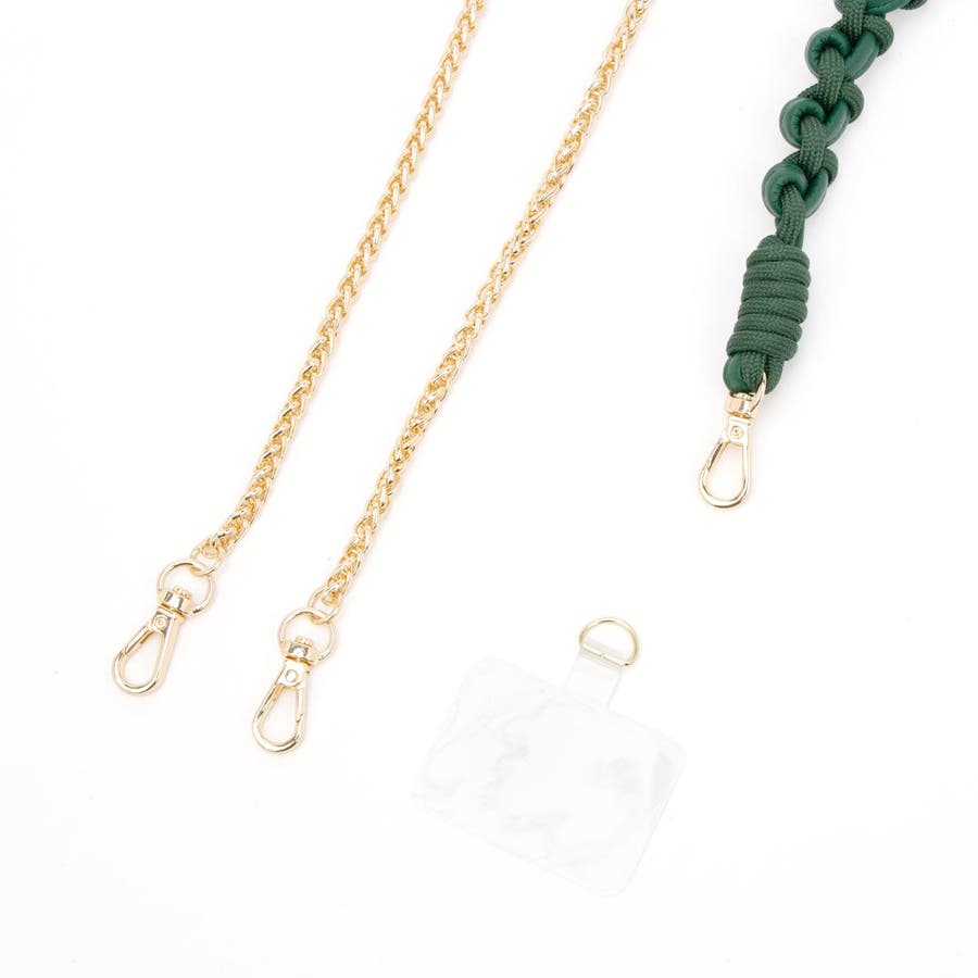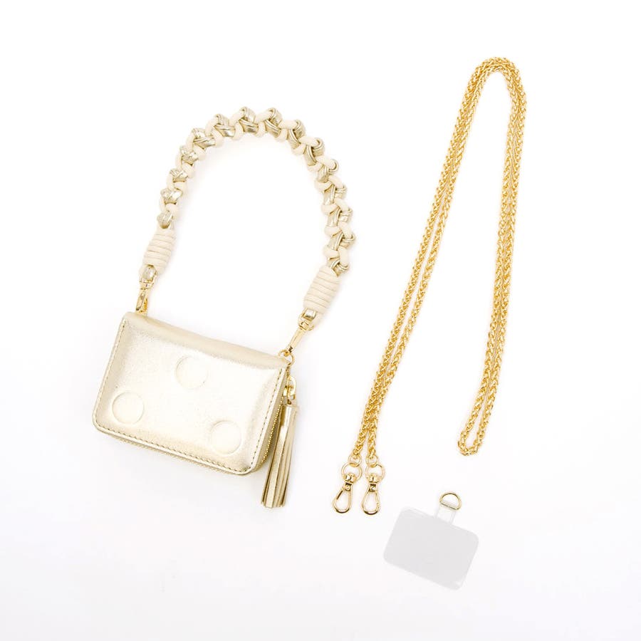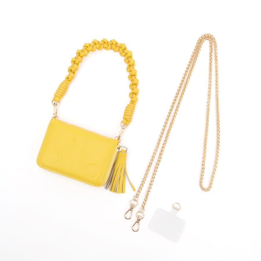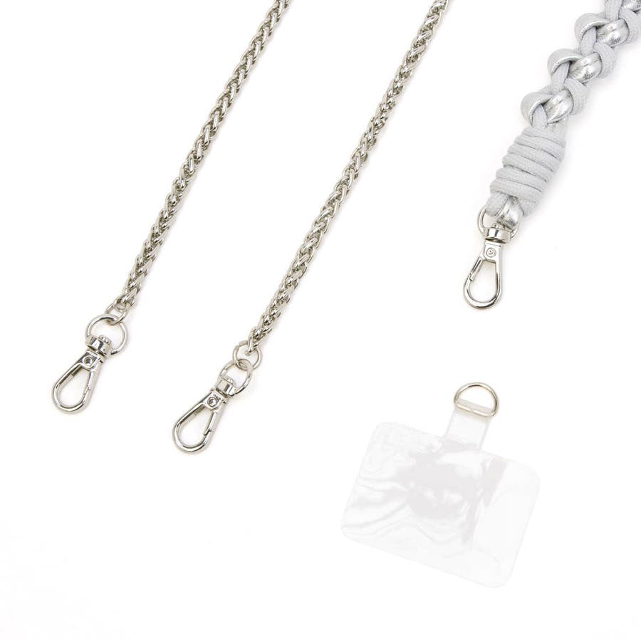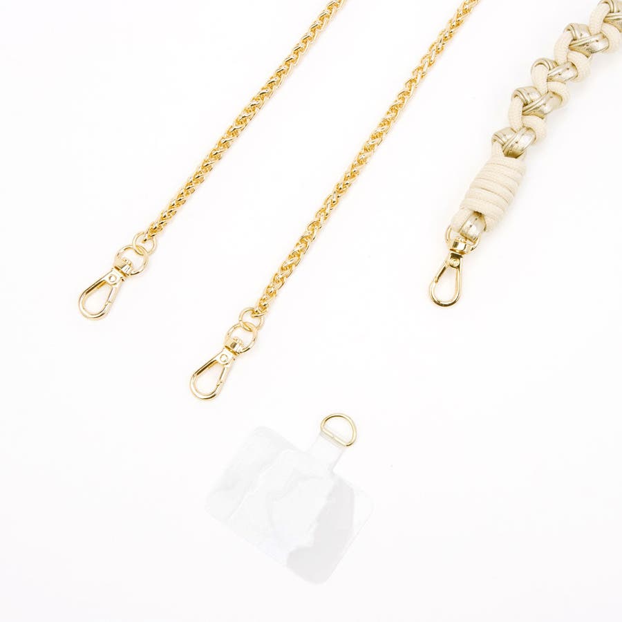 ハンドストラップやチェーンショルダー、スマホ取り付け用シートなどが付いていて組み合わせでマルチに使えるお財布です。