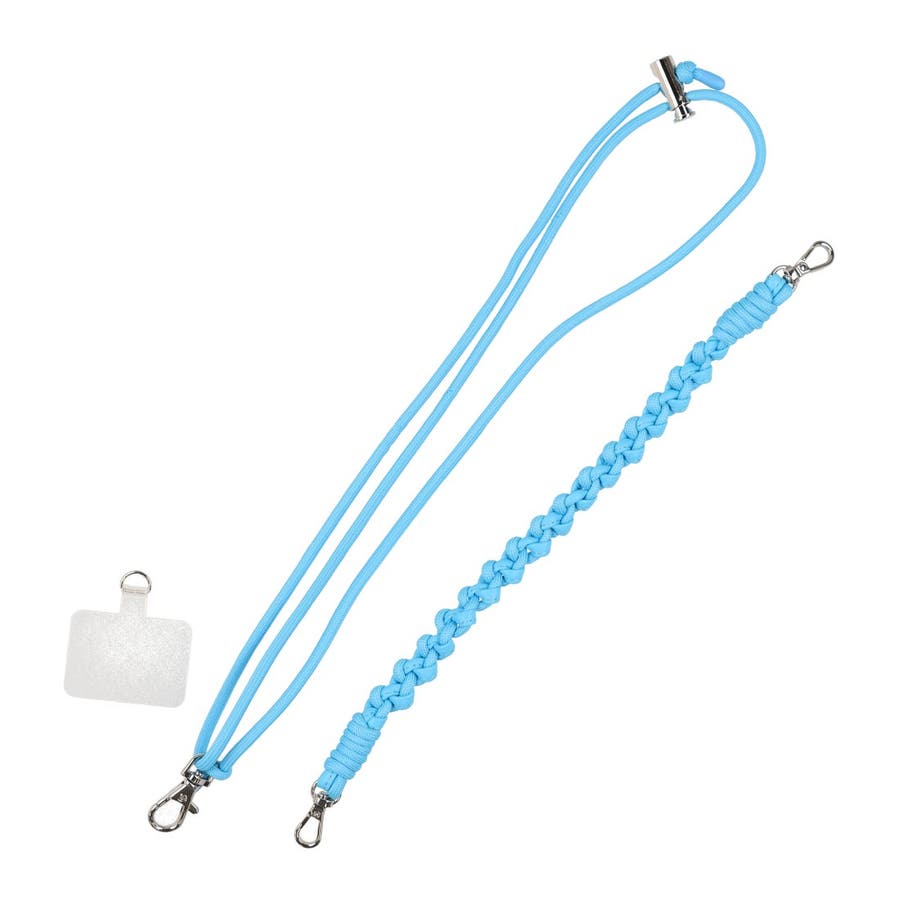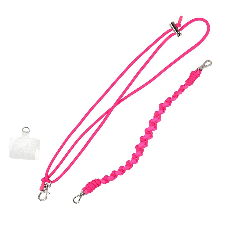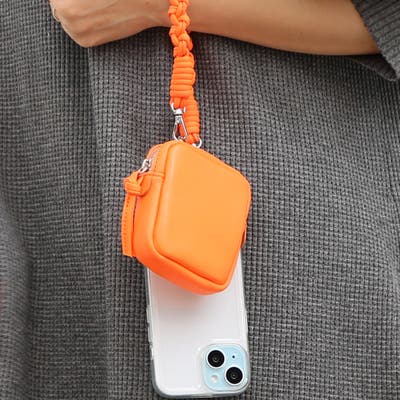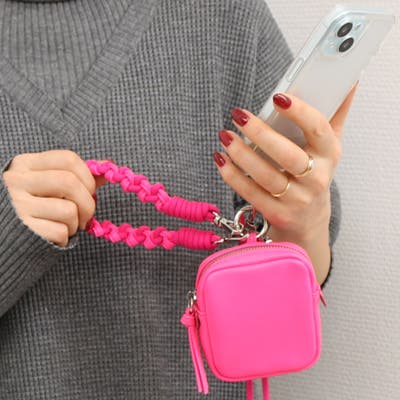 スクエア型のポーチにハンドストラップやチェーンショルダー、スマホ取り付け用シートなどが付いていて組み合わせでマルチに使えるポーチです。