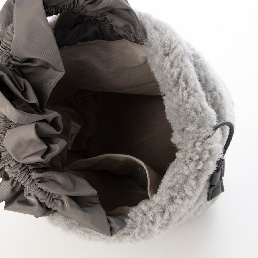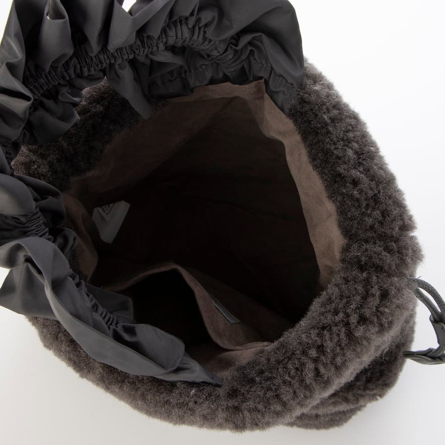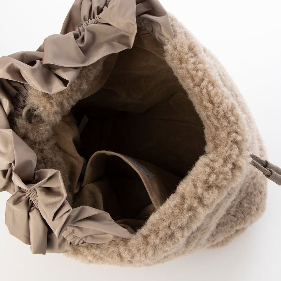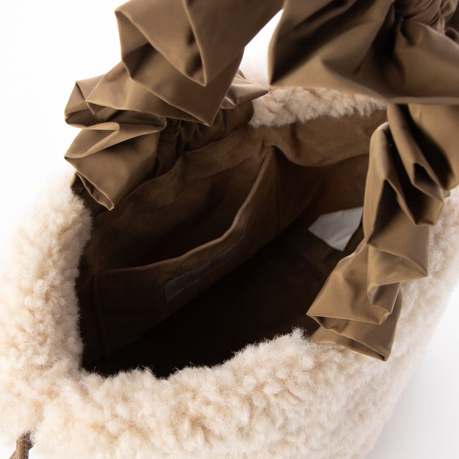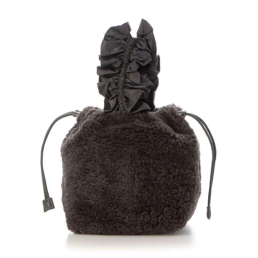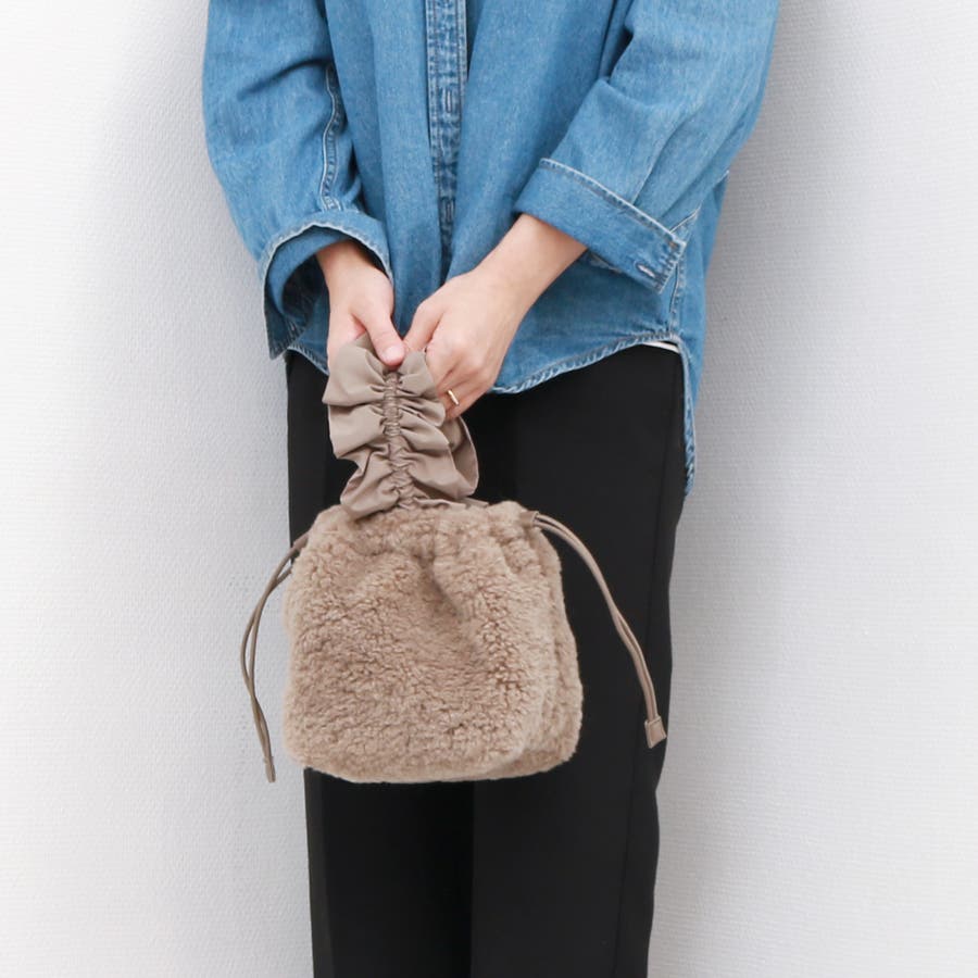 ボリュームフリルがポイントのボア巾着バッグ。