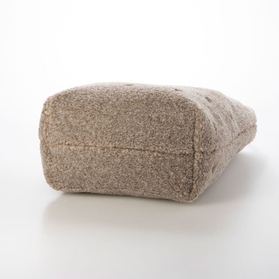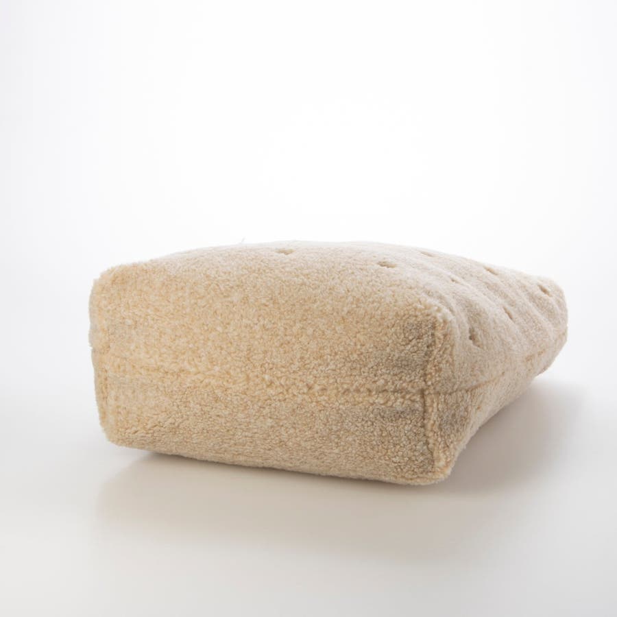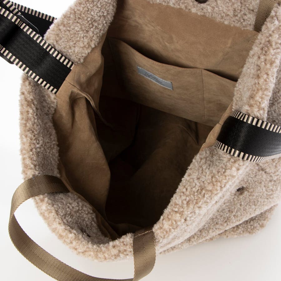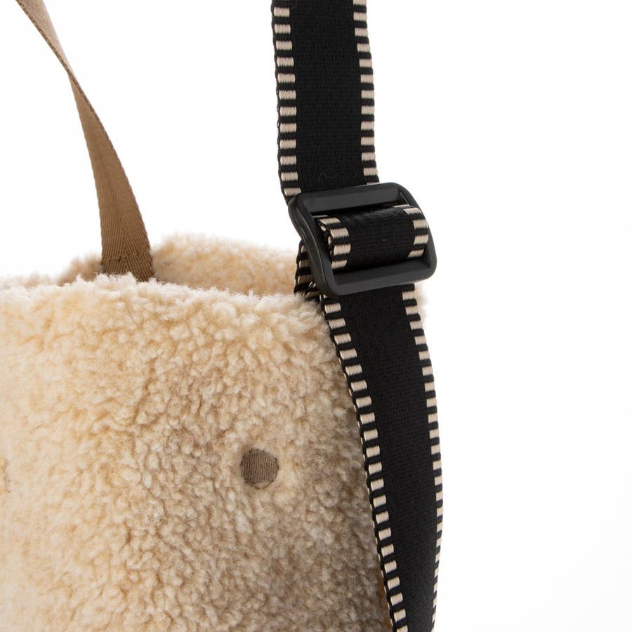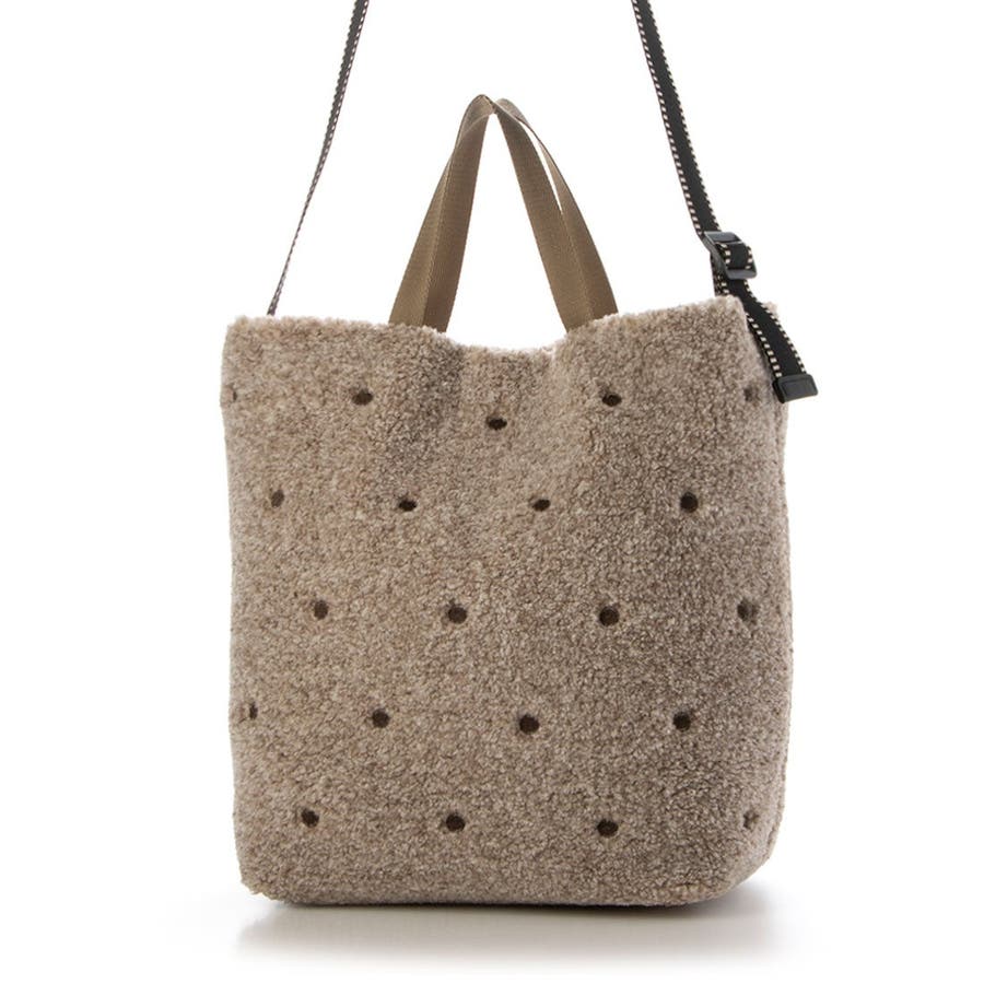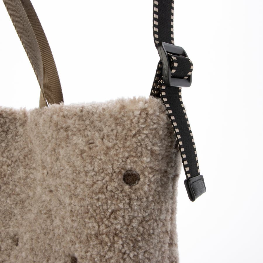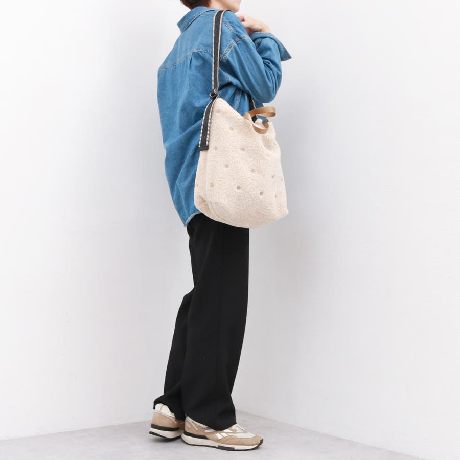 くすみカラーのボア素材に生地同色のドット刺繍を施し、さりげなくかわいさをプラスしました。