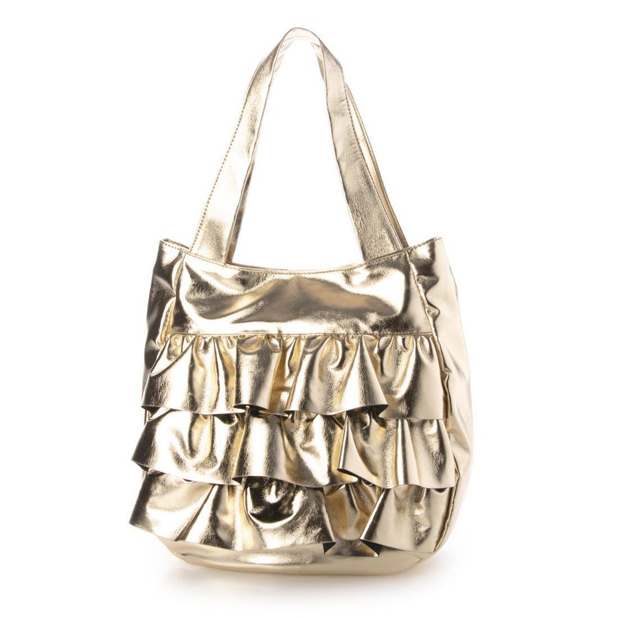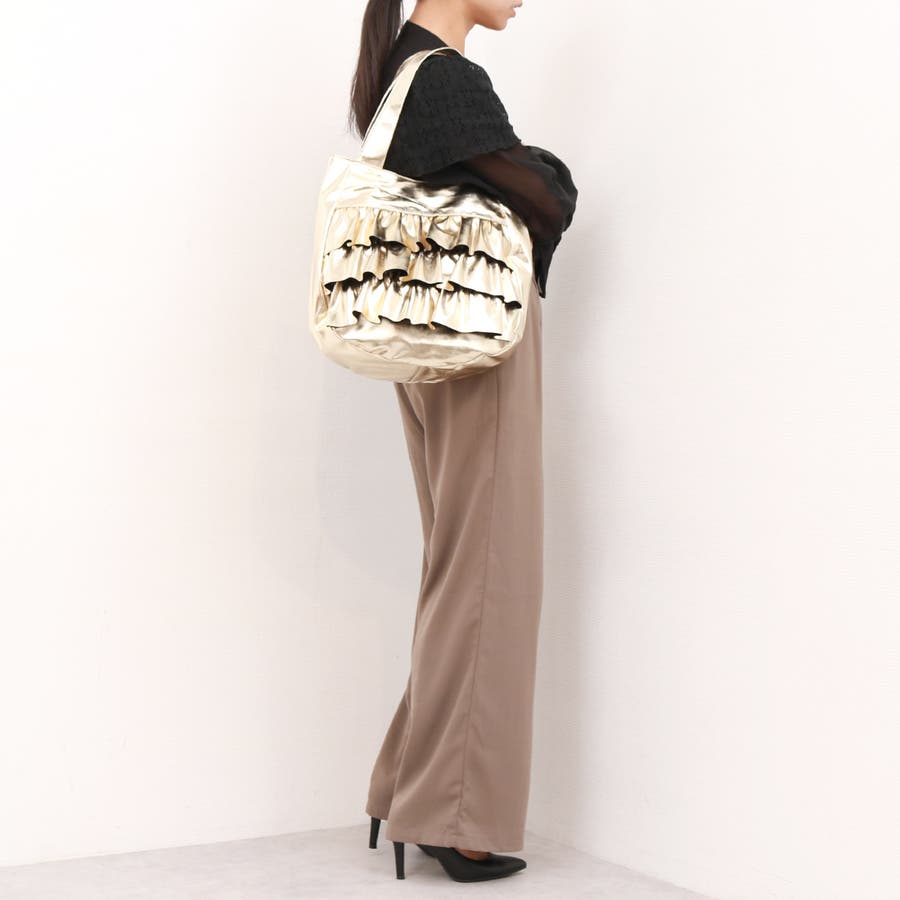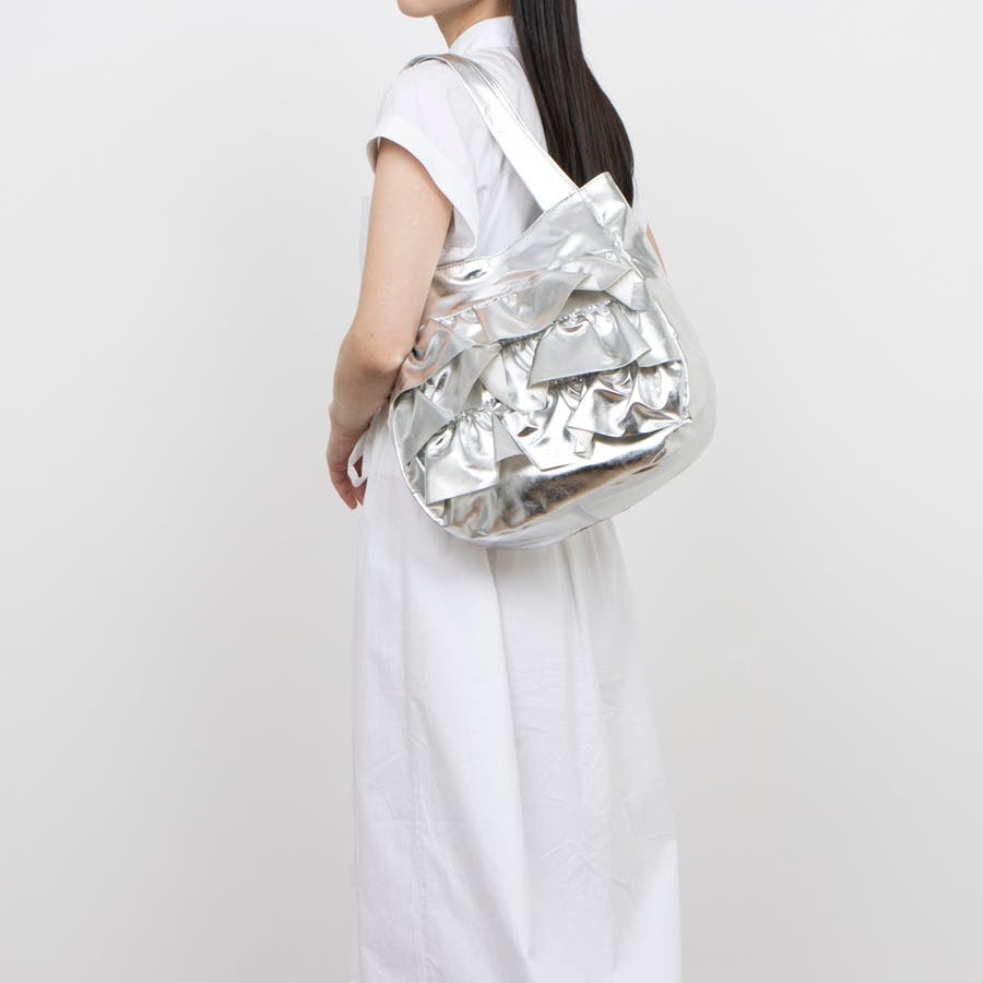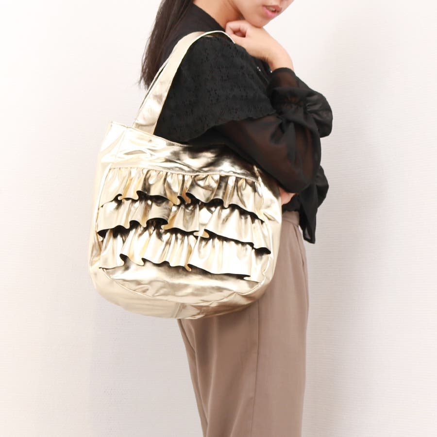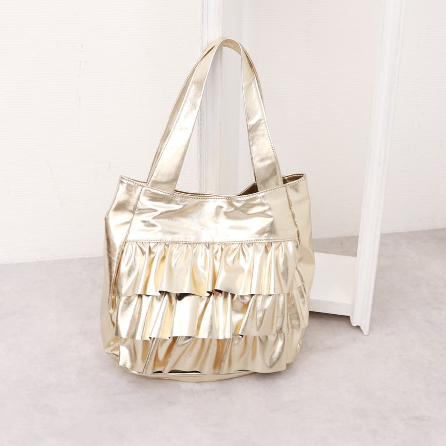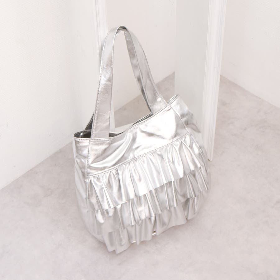 人気のメタリックカラーがと柔らかなフリルのフェミニンさがかわいいコーディネートの主役になれるバッグです。